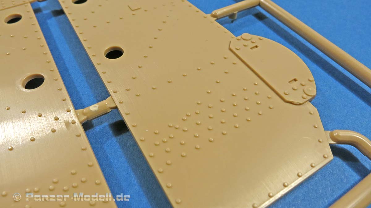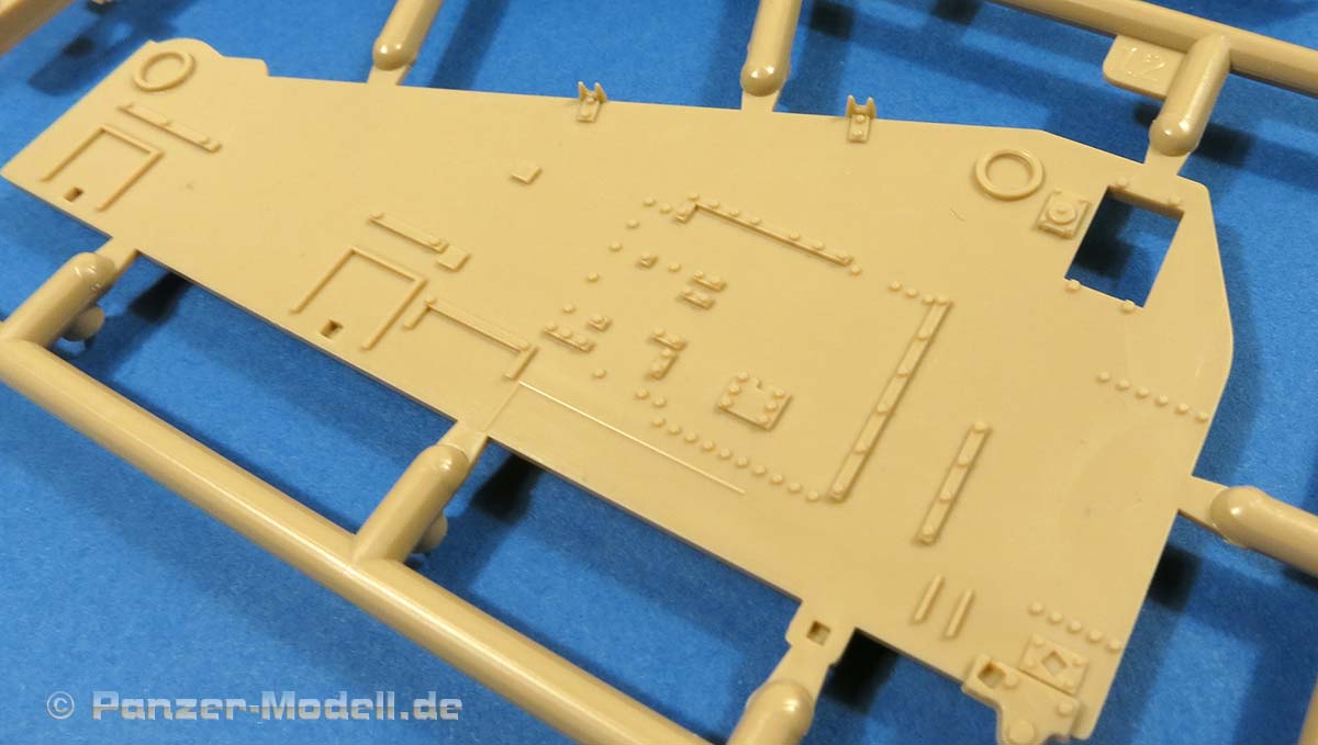Die Oberwanne ist ebenfalls einteilig, wird aber mit diversen Anbauteilen vervollständigt. Auch hier alles sehr schön und sauber wiedergegeben. Das Motordeck ist sehr gut dargestellt. Für die Lüftergitter liegen schöne geätzte Metallgitter bei. Es liegen auch Optionsteile bei um dem Modell auch spätere mögliche Produktionsausführungen zu ermöglichen, wie z.B. den erhöhten linken Lüfter für die Kampfraumheizung.
