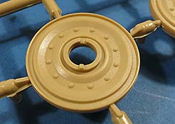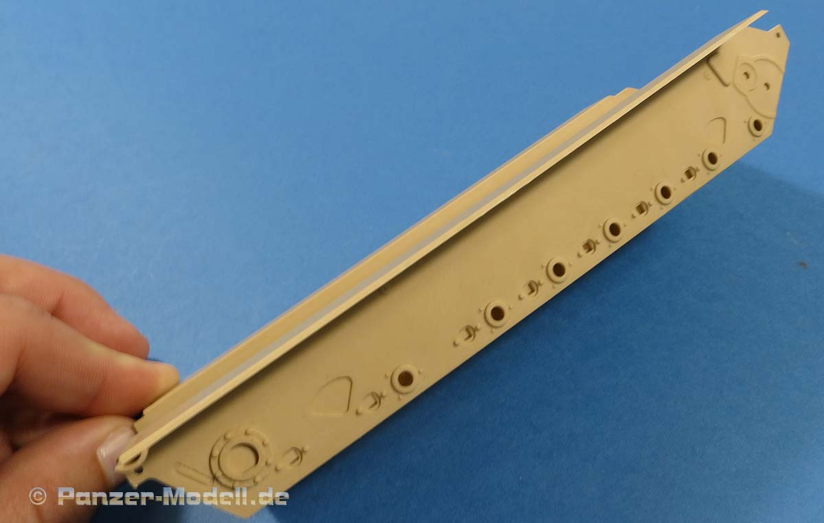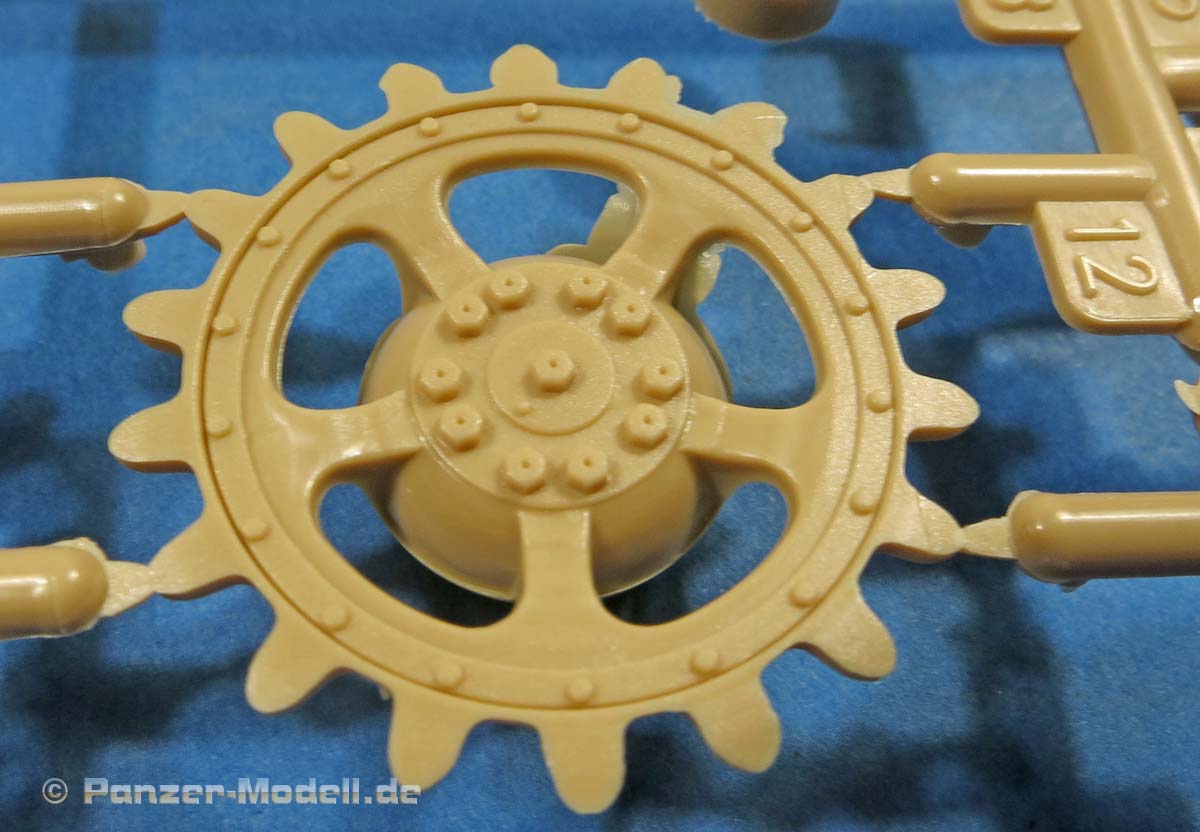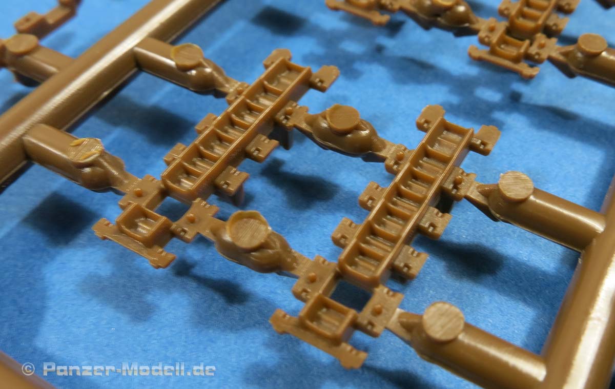 Die Unterwanne ist in einem Stück gemacht mit den Öffnungen für die Drehstäbe des Laufwerks, die einzeln eingesteckt werden und damit ein bewegliches Laufwerk ermöglicht. Die Laufrollen sind als Doppellaufrollen ausgeführt und weisen die korrekte Darstellung für das Laufwerk des Panther II auf. Die Laufrollen sind wunderschön geformt und mit sehr guten, feinen Schraubenkopfdetails versehen - ein Traum!