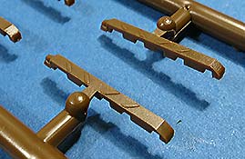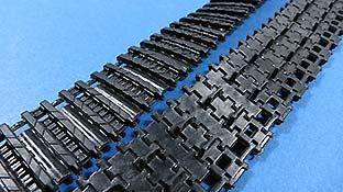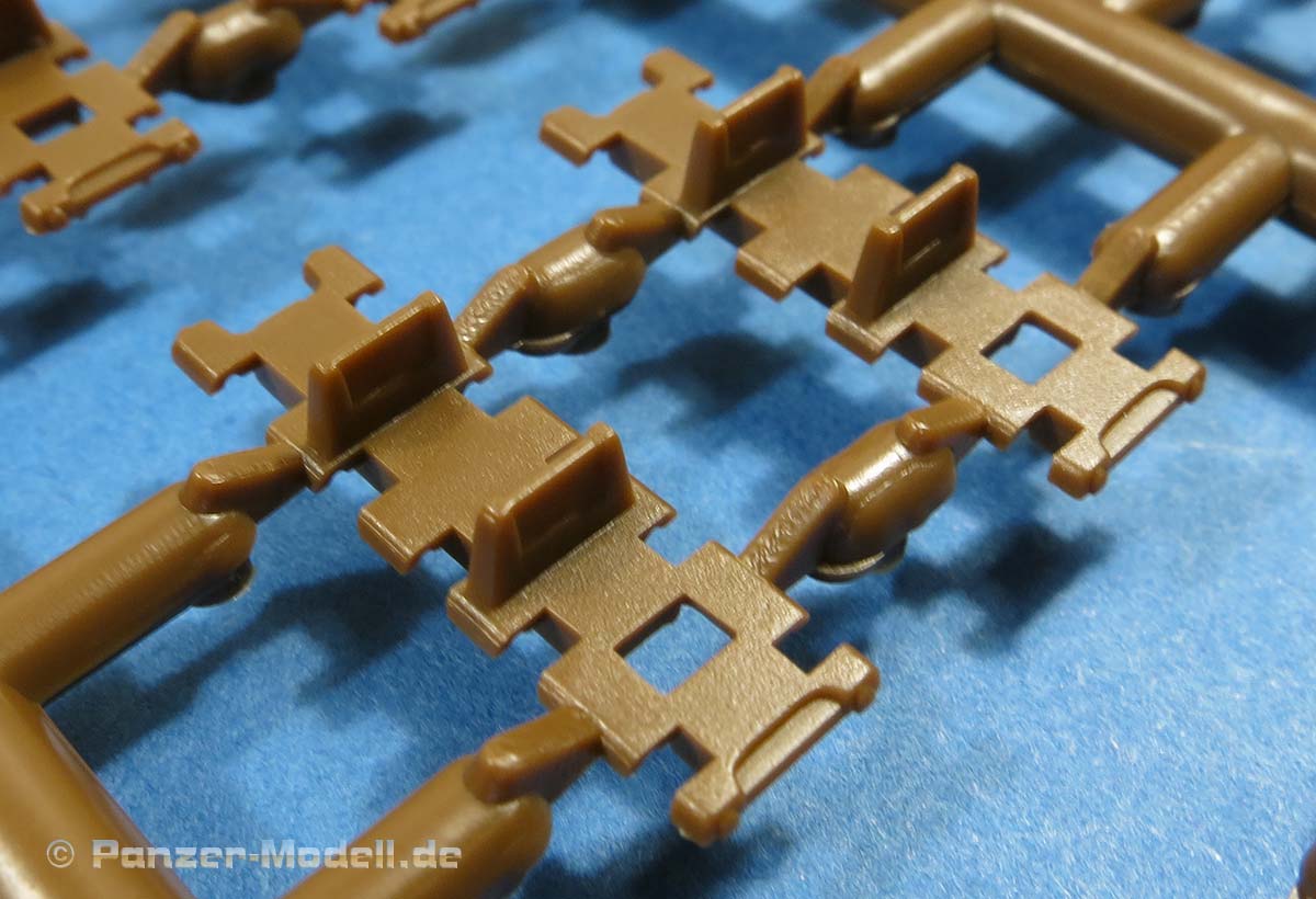 Die Ketten für die Ersatzketten sind im typischen Amusing Hobby Stil bei dem das Hauptglied mit dem nächsten verbunden und dann mit dem drüberliegenden Kettensteg geschlossen wird und somit eine bewegliche Kette entsteht. In diesem Fall sind zwei Kettenglieder über ein Zwischenglied verbunden - für den Bau liegt eine Bauhilfe bei. Mit Sicherheit eine ziemlich Fummelarbeit, auch da alle Teile von mehreren Angüssen befreit werden müssen. Aber man braucht ja nur wenige Kettenglieder!