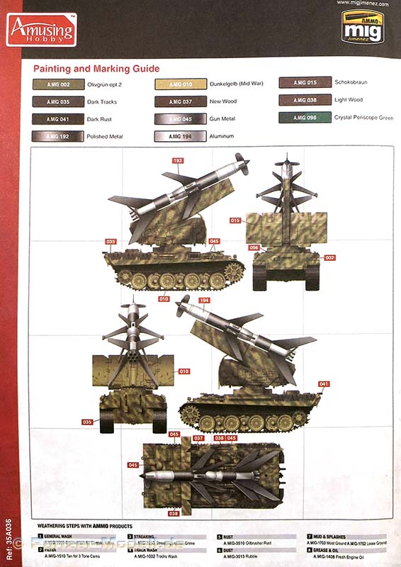 Am Ende der Bauanleitung sind 2 farbig gedruckte Seiten mit 5-Seiten Zeichungen für 2 Bemalungsvorschläge. Die Farbangaben sind für Ammo of Mig Farben.
