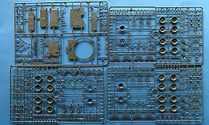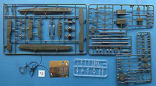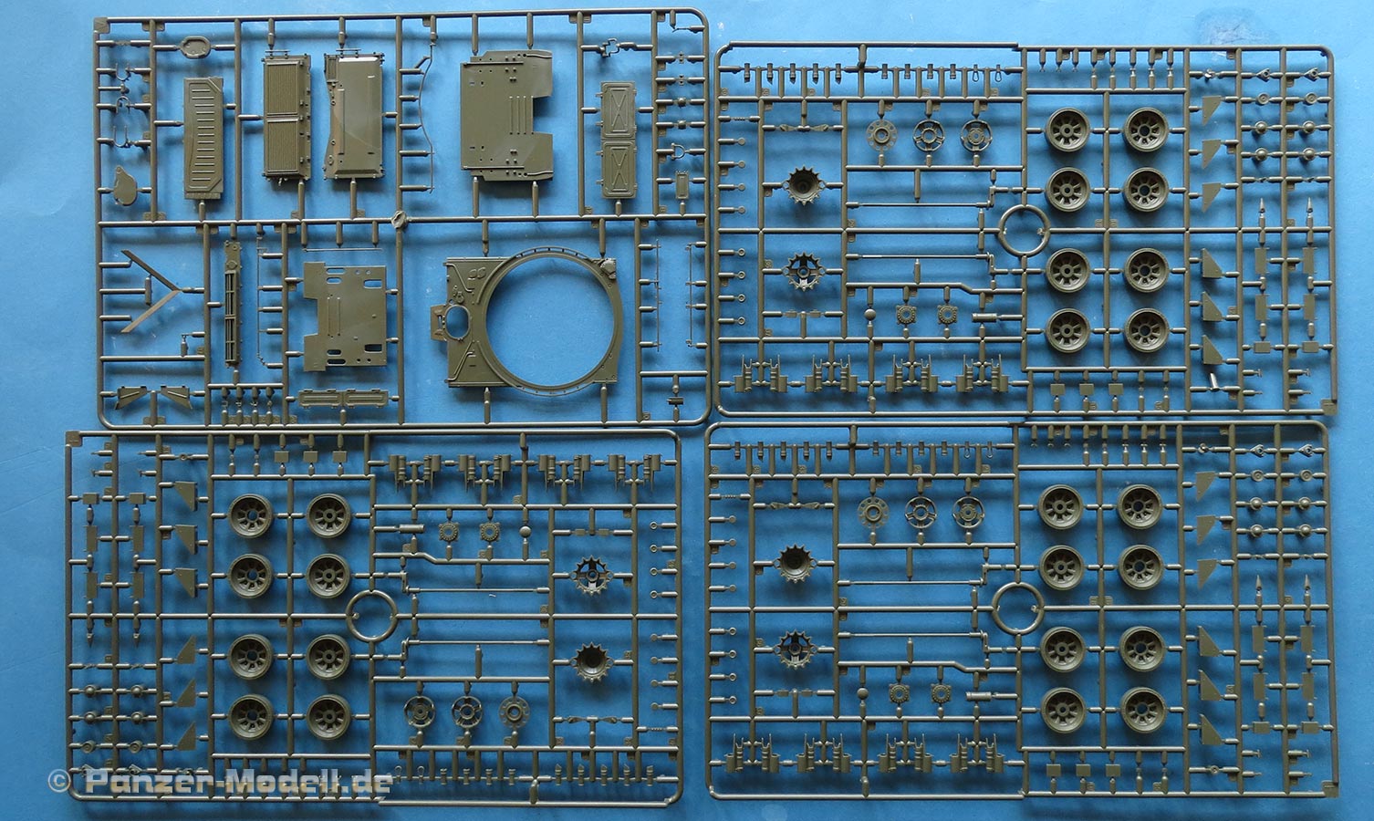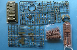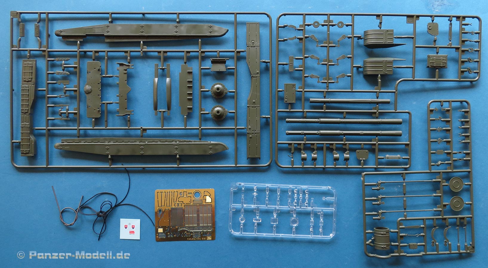 Im Karton finden wir 10 grünliche Spritzlinge, ein Klasrichtspritzling, eine Tüte mit Einzelkettengliedern, eine Tüte mit Verbindungspins, die Unterwanne, das Turmoberteil, eine PE Platine, Seilmaterial und ein winziger Decalbogen.