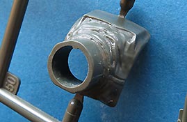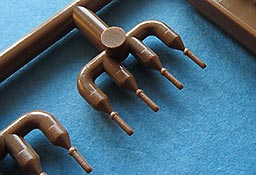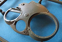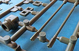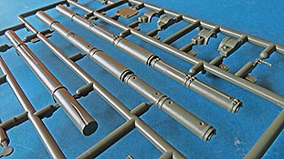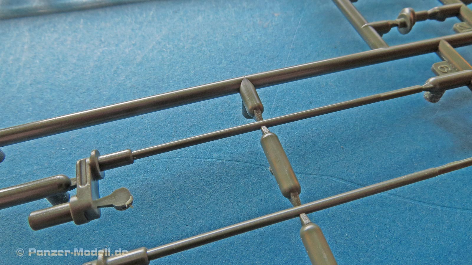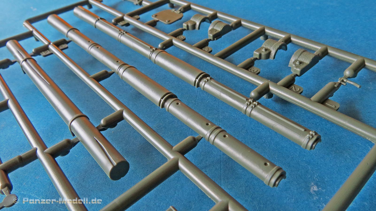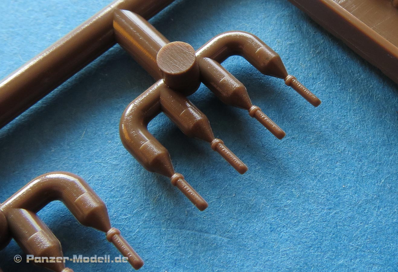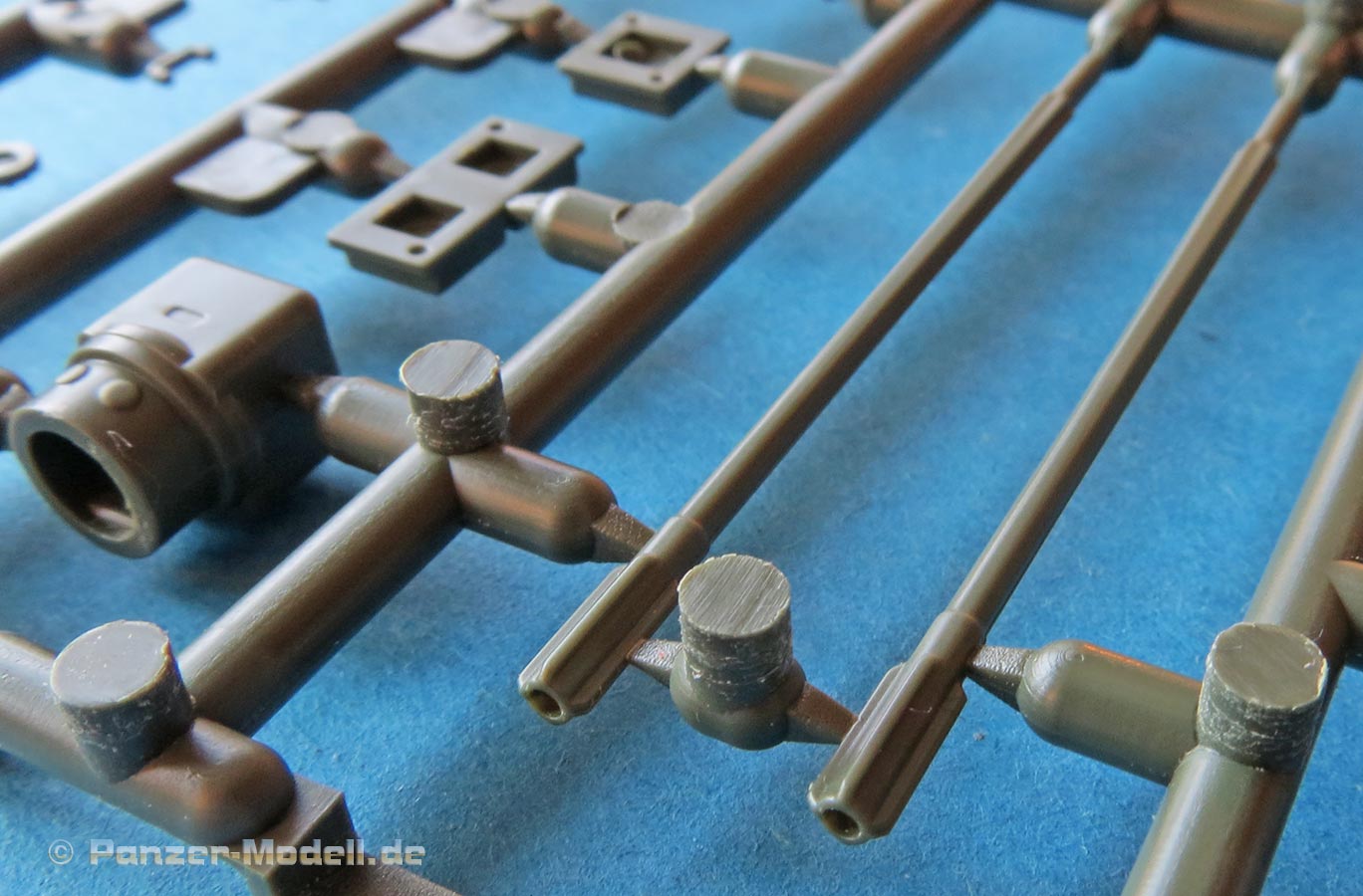 Die beiden seitlichen 20mm Kanonen seitzen sich aus relativ wenigen Teilen zusammen - die Rohre aus Plastik sind einteilig mit offener Mündung. So wie es aussieht kann man diese dann aber aufgrund von Bauteilen, die im Original beweglich sind, nur in zwei Stellungen (horizontal und leicht erhöht) anbaubar.