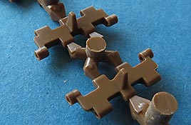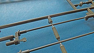 Auch das typische "Zubehör" wie der Bergebalken und die Zusatzfässer am Heck sind im Bausatz enthalten und machen einen guten Eindruck. 95 Glieder müssen pro Seite zusammengesetzt und jeweils mit zwei kleinen Plastikpins rechts und links gesichert werden. Diese Pins sind jeweils in Vierergruppen gespritzt, sodass man immer vier Glieder zusammen bekommt.