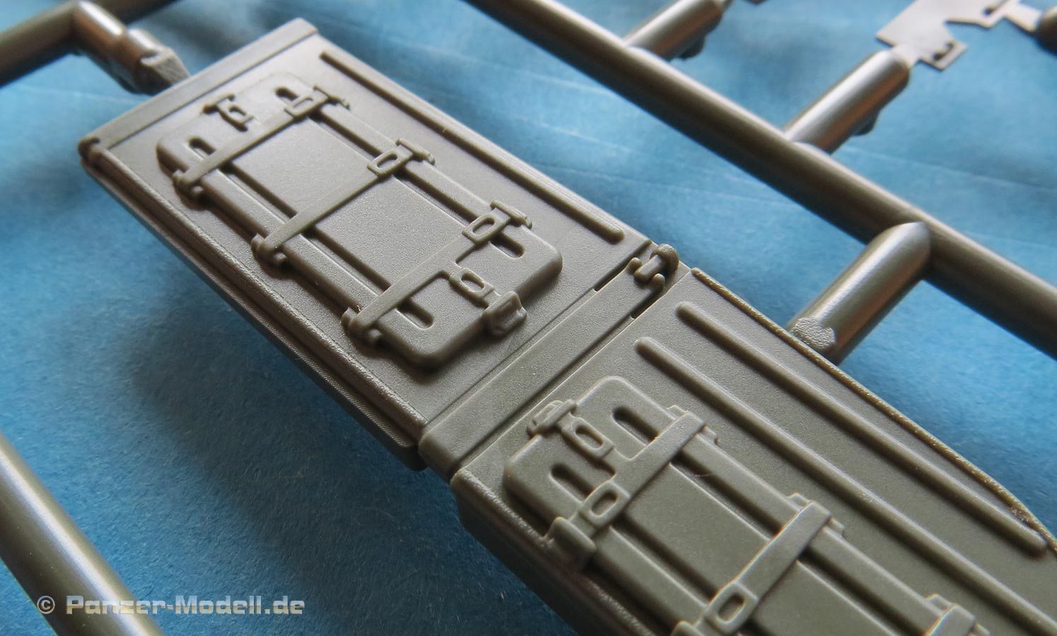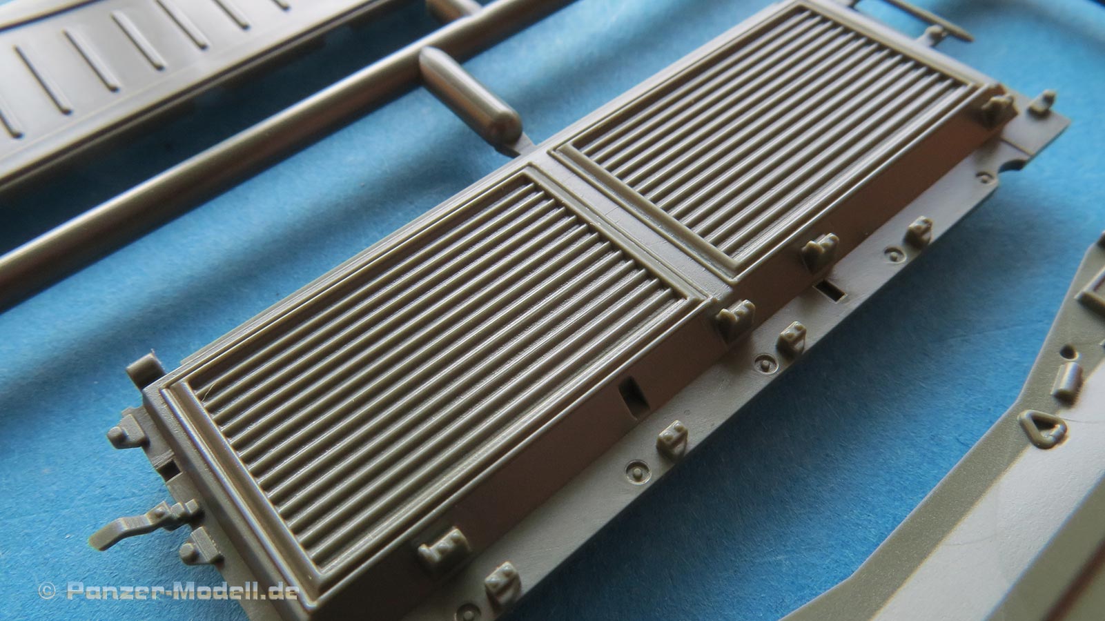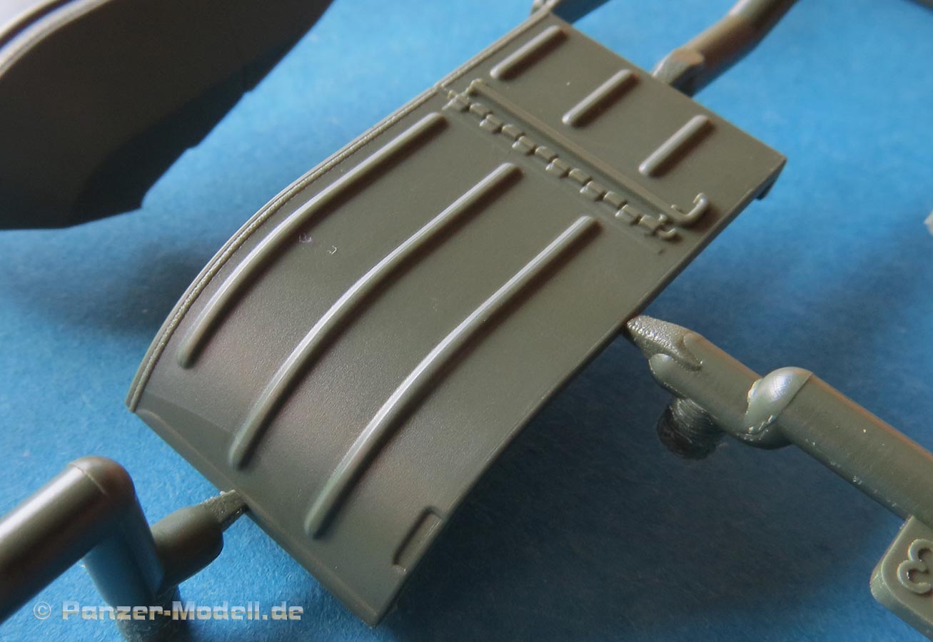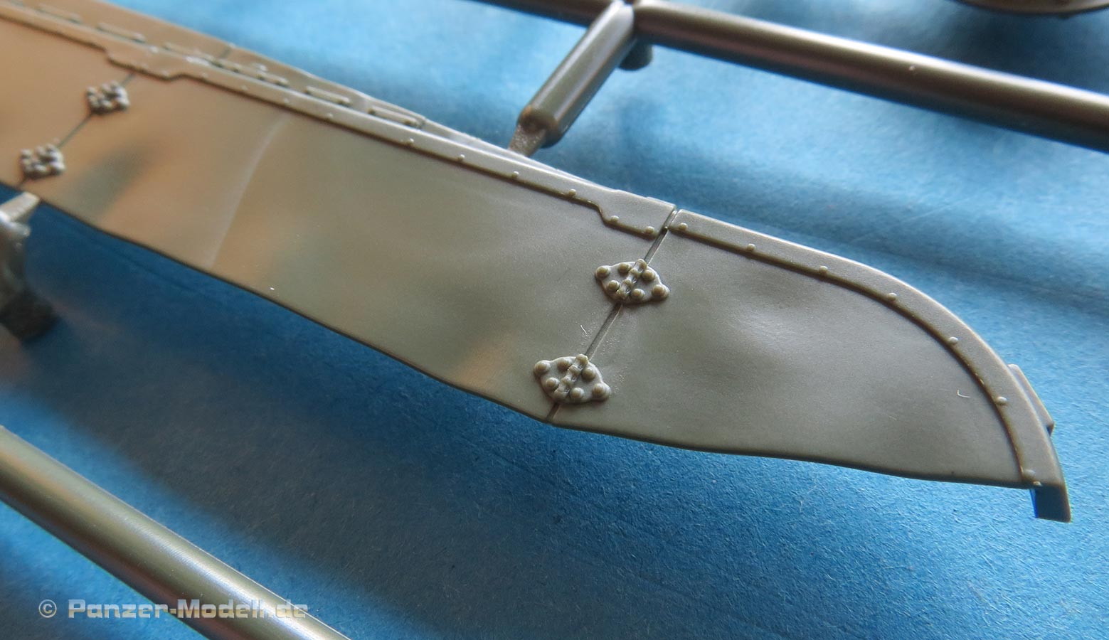 Auch die Kettenbleche mit den Staukästen sind sehr gut dargestellt, hier kommt auch einige Verstrebungen aus Fotoätzteilen zum Einsatz obwohl man nach der Komplettierung von diesen nicht mehr viel sieht.