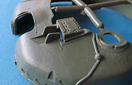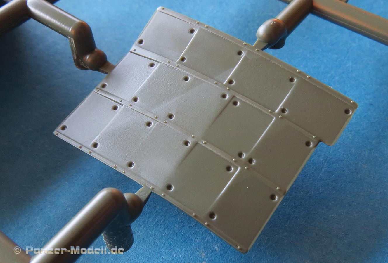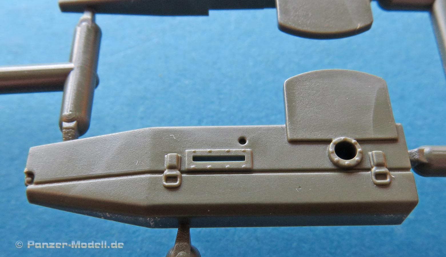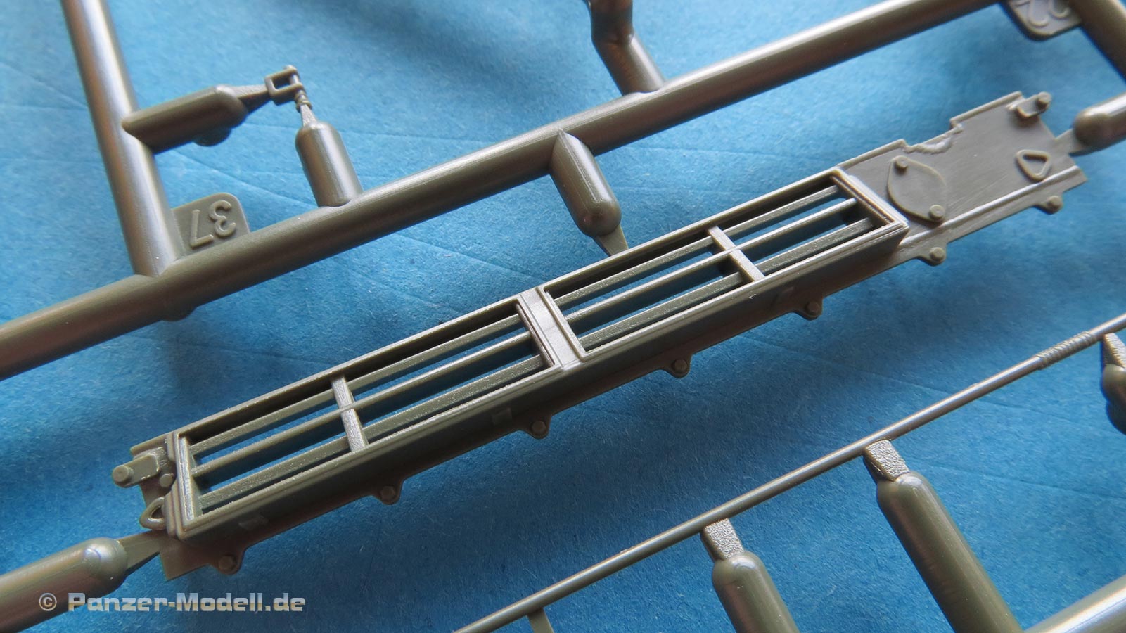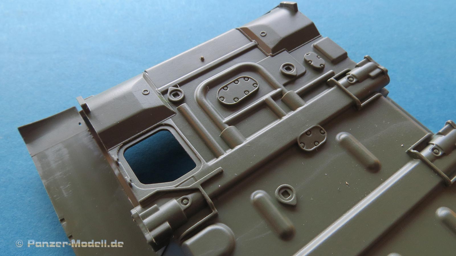 Auch die Kettenbleche mit den Staukästen sind sehr gut dargestellt, hier kommt auch einige Verstrebungen aus Fotoätzteilen zum Einsatz obwohl man nach der Komplettierung von diesen nicht mehr viel sieht.