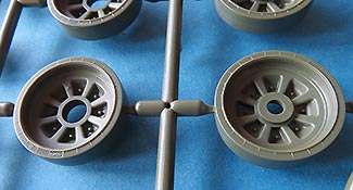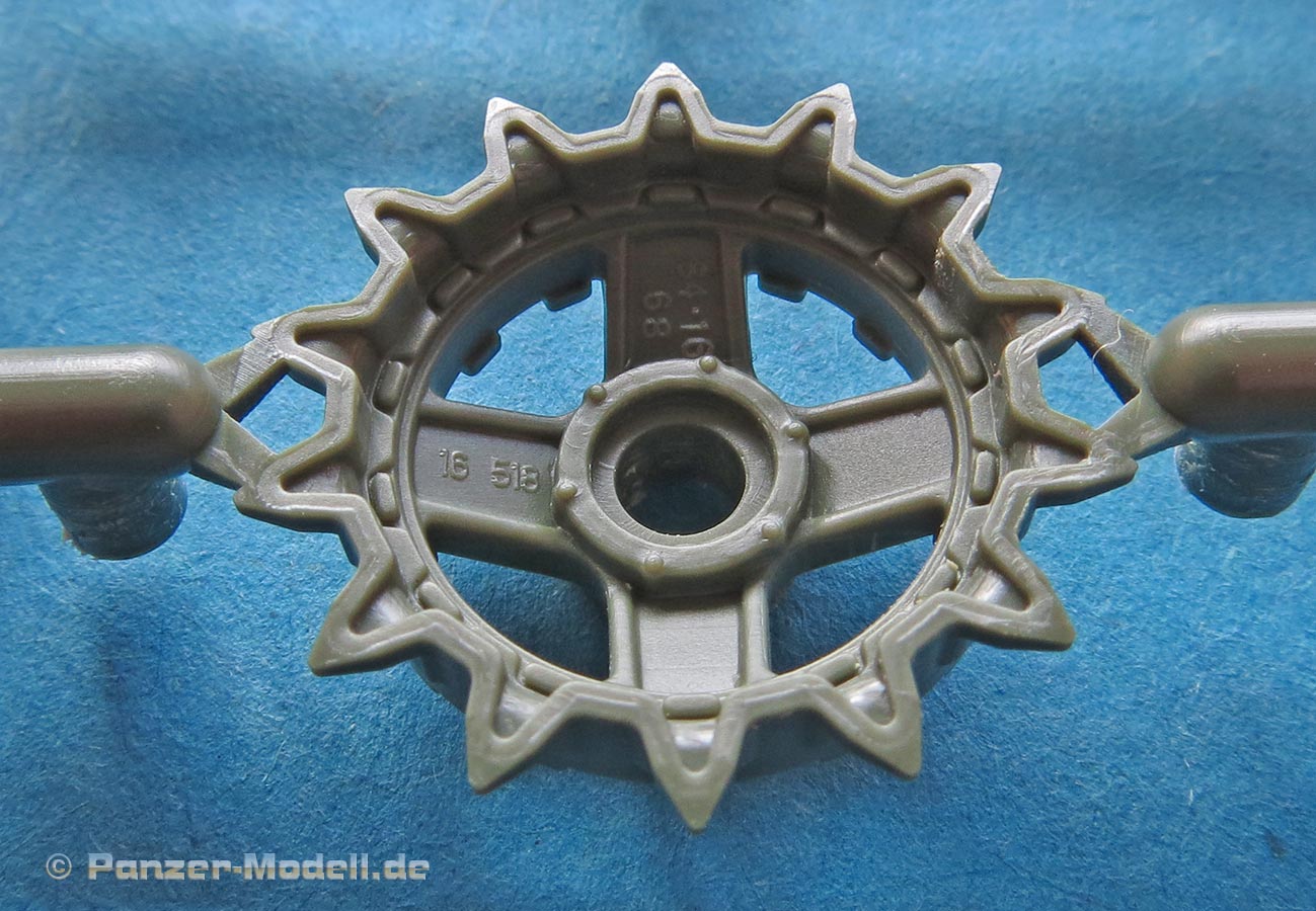 Die Laufrollen setzen sich aus Innen- und Aussenlaufrolle und der Nabe zusammen und machen einen sehr guten EIndruck mit feinen und scharfen Details. Sogar Maßzahlen sinden sich auf den Gummidandagen dargestellt - das hab ich bisher bei den modernen Russen noch an keinem Modell entdeckt. Auch an den Triebrädern sind erhabene Gussnummern zu sehen.