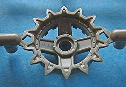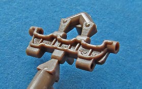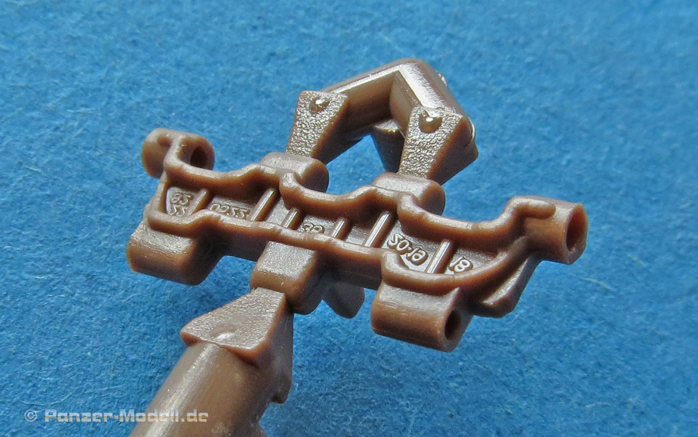 Die Ketten setzen sich aus Einzelgliedern zusammen, die wirklich ganz hervorragend gespritzt sind - auf der Inennseite sauber und glatt ohne Auswerfer, auf der Aussenseite mit den entsprechenden RIppen und Versteifungen. Und auch hier finden sich Gussnummern. Interessanterweise sind einige davon spiegelverkehrt - ob das nun ein Fehler ist oder im Original auch so, kann ich nicht sagen. Aber man müsste mit einer guten Brille schon sehr sehr nah ran, damit das auffällt.