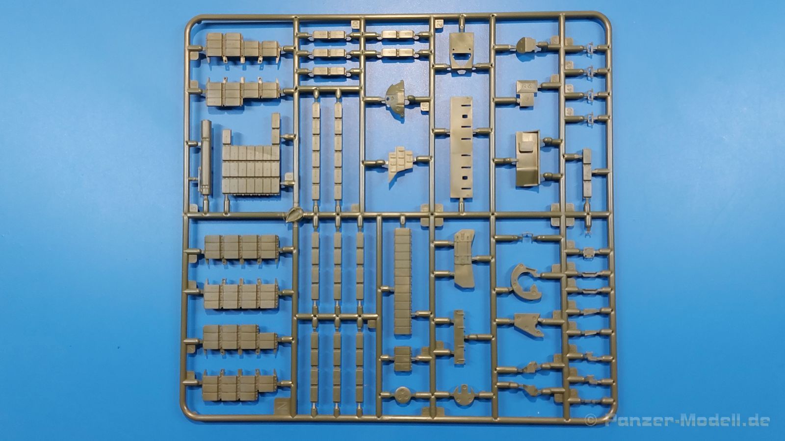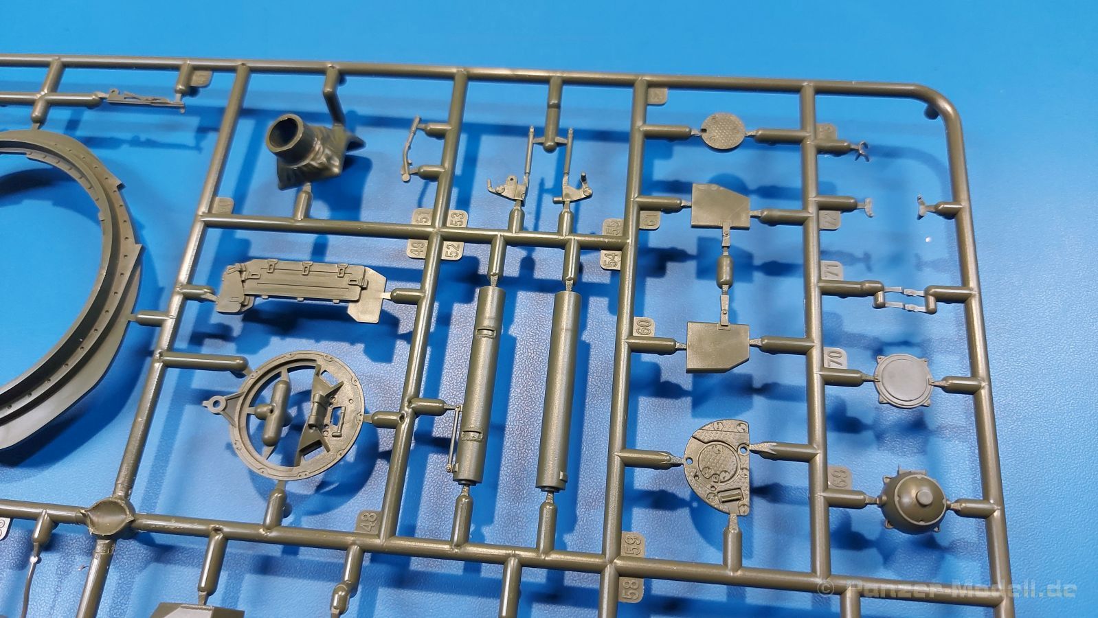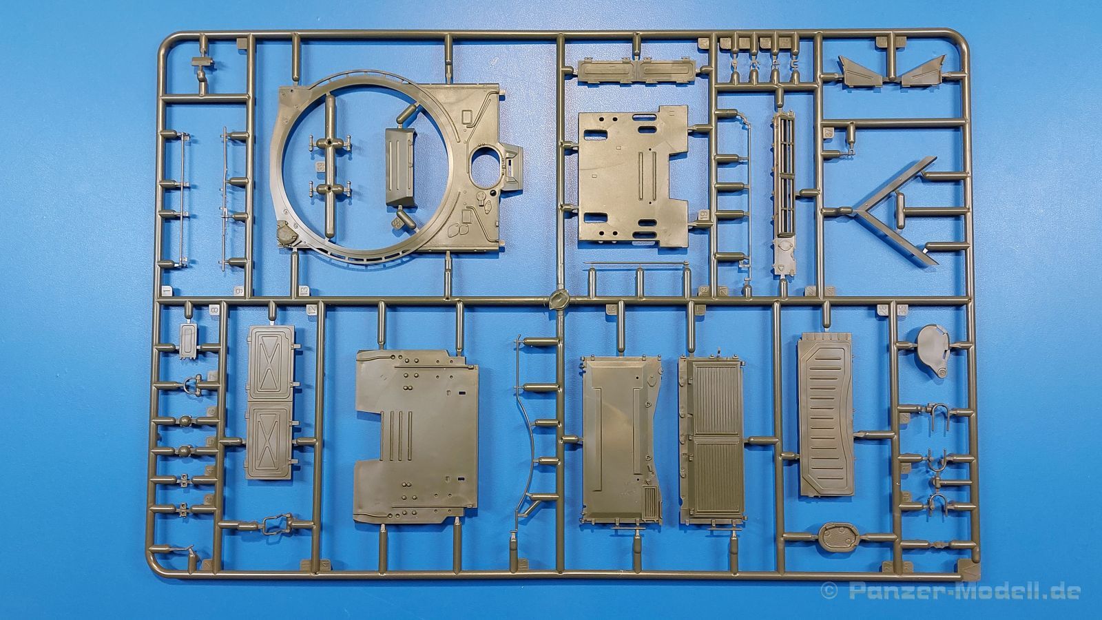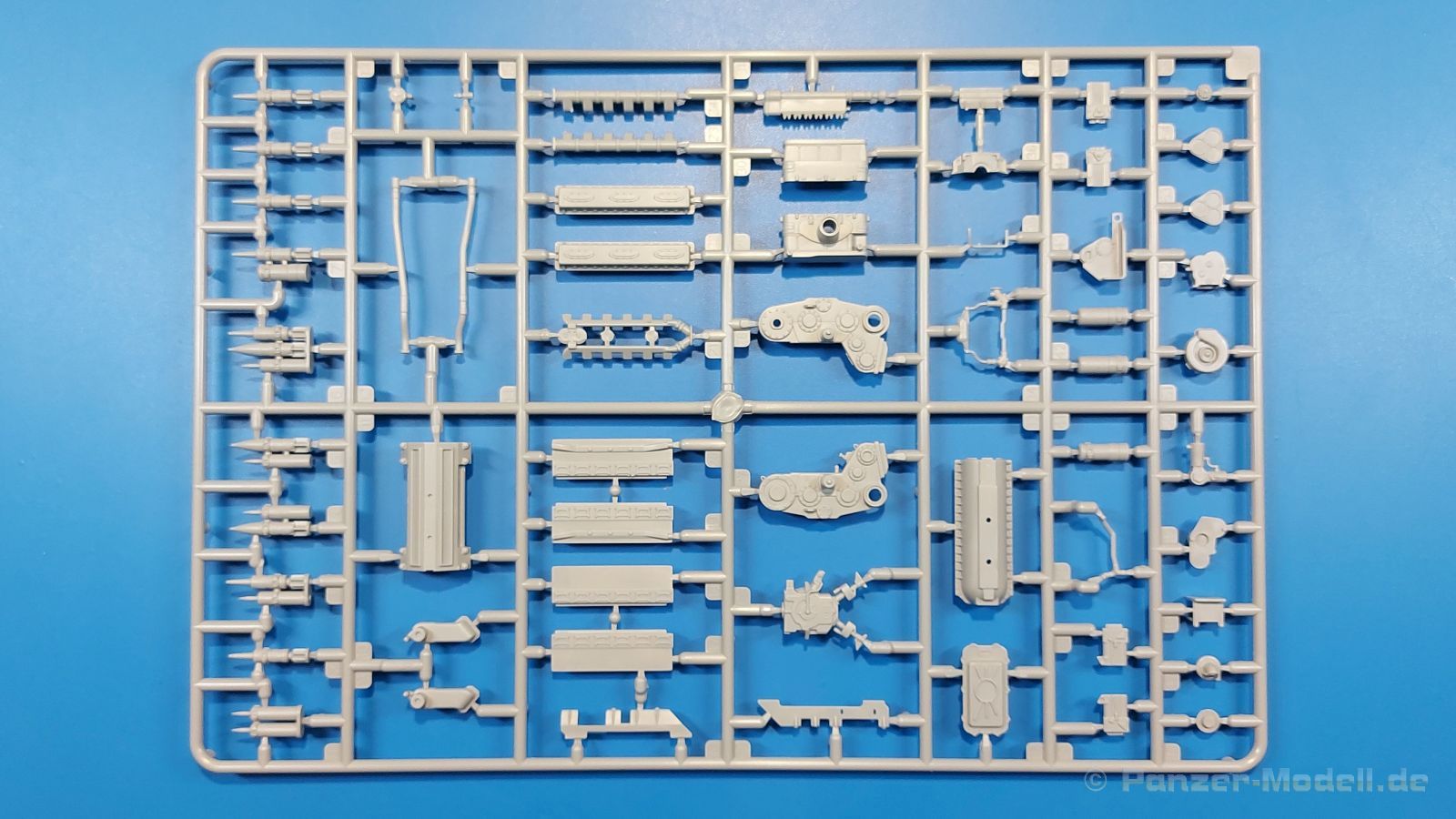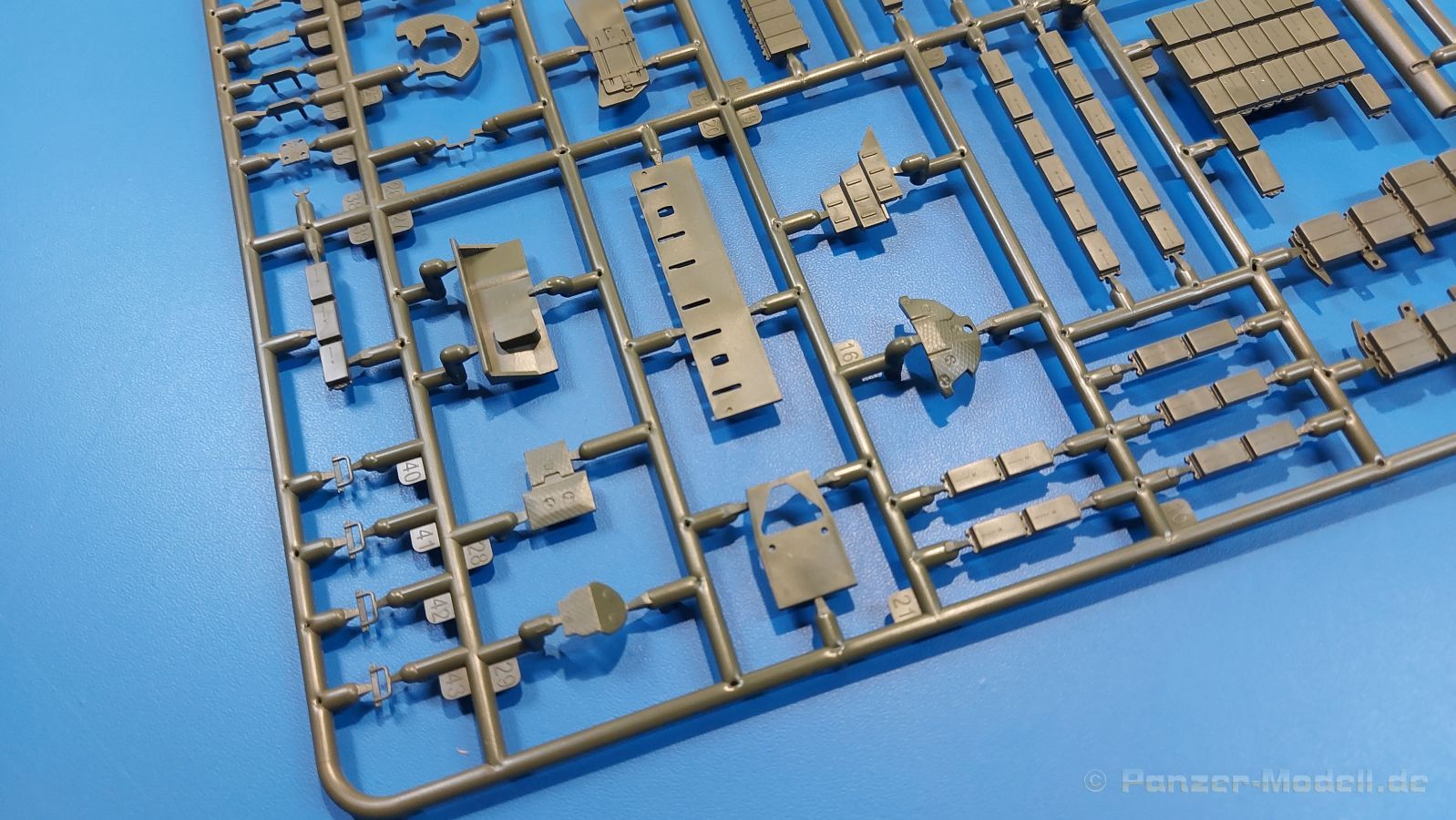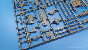 Der Bausatz: Nicht nur im Original gibt es jede Menge T-72. Modellbauer können sich sicherlich nicht über Mangel an entsprechenden Modellen beschweren. Amusing Hobby hat dem ganzen noch einen draufgesetzt und den ersten T-72 mit vollständiger Inneneinrichtung (Fahrer-, Motor- und Kampfraum inkl. Ladekarussel und -mechanismus) auf den Markt gebracht. Auch dieser T-72 AV Bausatz ist voll ausgestattet. Um die ganzen Spritzlinge aufzunehmen, ist der Karton mit 400 x 260 x 120 mm auch etwas größer ausgefallen. Er enthält 54 Spritzlinge (in olivgrün, hellgrau, braun und durchsichtig), die Unterwanne, Turm, 1 Metallfeder, 1 PE-Platine, 1 Kabel, 1 Draht, 1 Abziehbilderbogen und die Bauanleitung. Im Standard der heutigen Zeit ist die Qualität der Teile ausgezeichnet. Scharfe Details, teils kleine und feine Teile, kein Verzug oder Versatz vorhanden. Es gibt zwar Auswerferspuren, aber nur dort, wo sie nach dem Zusammenbau nicht mehr zu sehen sind. Einige hervorstehende Auswerferreste auf manchen Teilen, hier z.B. an den Innenseiten der Kettenschürzen und dem Grabschild, sollten aber entfernt werden, da die Teile sonst nicht korrekt montiert werden können. Das Klarsichtteile für die Scheinwerferscheiben sind schön geriffelt, die Gussstruktur am Turm ist glaubhaft wiedergegeben und wenn man genau hinsieht, sieht man Gussnummern an den Kettengliedern. Die Spritzlinge sind farblich getrennt - Olivgrün für den eigentlichen Panzer, Hellgrau für die Inneneinrichtung und Braun für die Kettenglieder und -bolzen. Schauen wir uns mal die Wanne an. Sie besteht aus einem Teil, das Unterboden und die Seitenteile beinhaltet. Grad der T-72-typische und auffällige Unterboden ist sehr gut dargestellt. Öffnungen für Wartungsdeckel und Notausstiegsluke sind vorhanden. Innen sind zwar mehrere Auswerferspuren zu sehen, aber diese werden wohl komplett von der Inneneinrichtung verdeckt. Die Inneneinrichtung ist ein Modell für sich. Beginnend beim Fahrerraum mit der gesamten Pedalerie, sämtlichen Instrumenten, dem hervorragenden Fahrersitz über die Munitionskästen, Staukästen, Feuerlöscher bis zum unglaublich gut dargestellten Karussell des Autoladers, in dem verschiedene Munitionssorten optional eingesetzt werden können, ist alles vorhanden. Auch im Heck ist der Dieselmotor mit Turboaufladung, sowie der Kühler (der Lüfterpropeller ist ein echter Hingucker!), die Treibstofftanks und das Getriebe vorhanden. Es sind ebenfalls Luftfilter, die Lichtmaschine, wichtige Leitungen und Verstrebungen dargestellt. Auch der Turm ist vollständig eingerichtet. Der Bau des Turmes beginnt mit dem Bau der 125mm Kanone 2A46(D-81). Hier werden zunächst der Verschluss und der Rest der Waffenanlage zusammengesetzt, dann folgen der Richtschützen- und der Kommandantensitz und diverse Anbauteile. Viele Teile der Ladeautomatik wollen auch zusammengesetzt werden. Der Turm besteht aus einer Innen-, einer Außenschale und einem Turmdrehkranz. Zusätzlich wird noch ein Teil des Turmdaches separat eingesetzt. So erreicht man einen ungeheuren Realismus in der Materialdicke. Zudem sind zum Beispiel alle Schutzpolsterungen und Nietungen genauestens dargestellt. Natürlich können alle Luken offen dargestellt werden, und die Maschinengewehre (Koaxial und Flugabwehr) sind mit offenen Rohrmündungen wiedergegeben. Die Optiken des Richtschützen und des Kommandanten, sowie die Funkanlage kann sich wirklich sehen lassen. Beim Fahrwerk werden die Drehstäbe (mit den angegossenen Schwingarmen) in die hervorragend wiedergegeben Unterwanne geklebt, und bleiben beweglich. Dadurch kann das Modell auch an unebene Untergründe angepasst werden, und macht in jedem Diorama eine gute Figur. Auch die Trieb-, Leiträder, Lauf- und Stützrollen sind sehr schön wiedergegeben und setzen sich erfreulicherweise aus nur wenigen Teilen zusammen, ohne hier an der Detaillierung zu sparen. Die Ketten sind als Einzelgliedketten ausgelegt. Schaut man sich die Glieder näher an, entdeckt man in den Riffeln der Außenseite feinste Gussnummern. Jede Seite benötigt fünfundneunzig Kettenglieder. Diese befinden sich an achtundzwanzig Spritzlingen zu je 8 Gliedern, die einzeln abgetrennt und versäubert werden wollen. Die Kette soll voll beweglich bleiben. Dies wird mithilfe der Bolzenlöcher in den Gliedern und separaten Bolzen erreicht. Die Kettenbolzen befinden sich an sieben eigenen Gussästen. Diese können zu Gruppen aus je zwei Bolzen bzw. vier Bolzen ausgeschnitten werden und mit Hilfe einer Montagehilfe, in welche die einzelnen Kettenglieder eingelegt werden, in die Bohrungen der einzelnen Glieder eingesetzt werden. Der Kettenbau wird sicherlich einen gewissen Teil der Arbeit an diesem Bausatz ausmachen. Die Heckplatte hat bereits einen großen Wartungsdeckel mit fünf Schraubenköpfen angegossen. Zwei Ersatzkettenglieder plus deren Halterungen und zwei Bergehaken bringt man beidseitig des Wartungsdeckels an. Der typische Bergebalken fehlt natürlich auch nicht. Er zeigt Trocknungsrisse des Holzes, aber kaum eine Maserung. An den oberen Rand kommen die Halterungen für die Kraftstofffässer. Die typischen Heckfässer sind im Slide-Mould-Verfahren hergestellt, haben bereits die Haltebänder und Leitungsanschlüsse bereits angegossen und werden nur mit den Seitenteilen komplettiert. Die typischen Treibstoffleitungen, welche zum Motor führen, werden mit Hilfe einer Spiralfeder mit eingelegtem Draht simuliert. Die Bugplatte besteht aus drei Platten - Innenplatte mit Elementen der Inneneinrichtung, der eigentlich Panzerplatte und einer Zusatzpanzerplatte. Auf diese Zusatzpanzerplatte werden die Kacheln der Reaktivpanzerung, bestehend aus Einzel- und Gruppenelementen, aufgesetzt. Die Fahrscheinwerfer sind ausgehöhlt und bekommen geriffelte Klarsichtgläser. Die Scheinwerferhalterung sind etwas „komisch“ aufgeteilt. Man klebt die geteilten Gestänge stumpf aufeinander. Die Kettenbleche sind bereits an der Unterwanne angegossen. Es kommen einige Verst