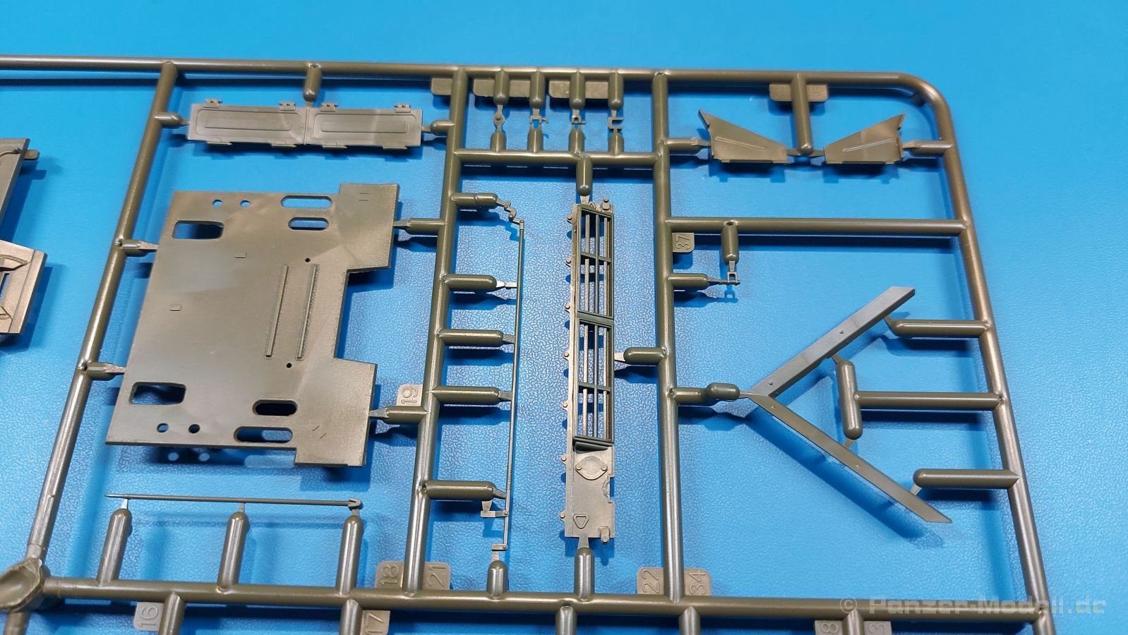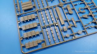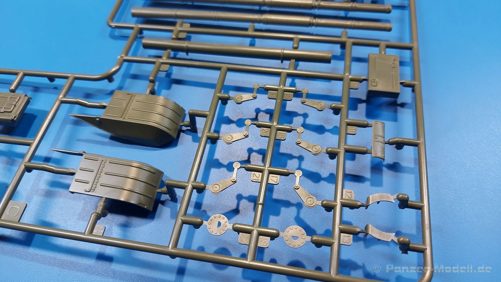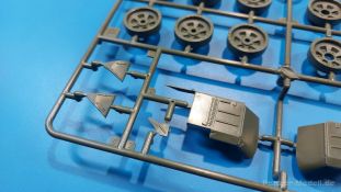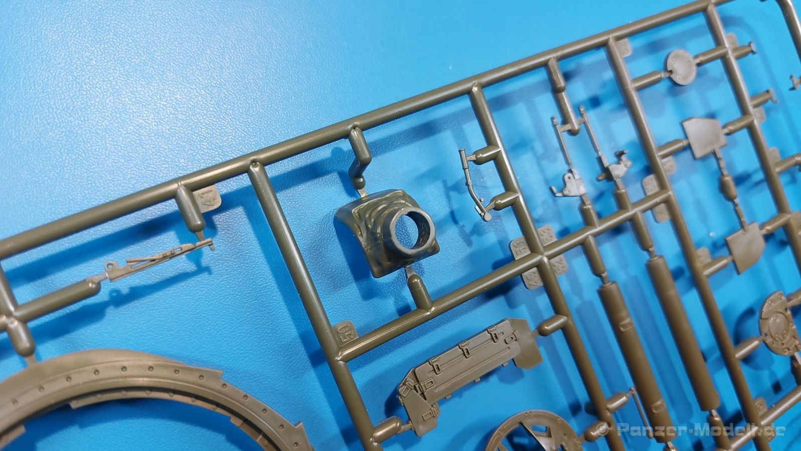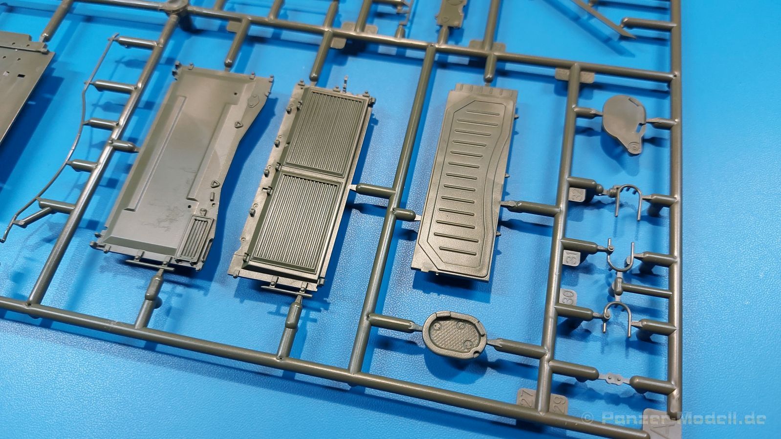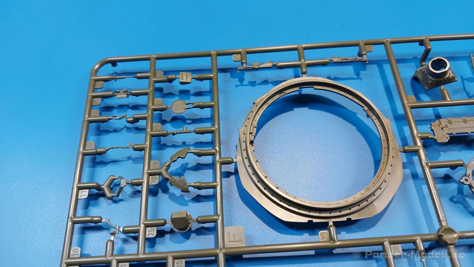 Der Bausatz: Nicht nur im Original gibt es jede Menge T-72. Modellbauer können sich sicherlich nicht über Mangel an entsprechenden Modellen beschweren. Amusing Hobby hat dem ganzen noch einen draufgesetzt und den ersten T-72 mit vollständiger Inneneinrichtung (Fahrer-, Motor- und Kampfraum inkl. Ladekarussel und -mechanismus) auf den Markt gebracht. Auch dieser T-72 AV Bausatz ist voll ausgestattet. Um die ganzen Spritzlinge aufzunehmen, ist der Karton mit 400 x 260 x 120 mm auch etwas größer ausgefallen. Er enthält 54 Spritzlinge (in olivgrün, hellgrau, braun und durchsichtig), die Unterwanne, Turm, 1 Metallfeder, 1 PE-Platine, 1 Kabel, 1 Draht, 1 Abziehbilderbogen und die Bauanleitung. Im Standard der heutigen Zeit ist die Qualität der Teile ausgezeichnet. Scharfe Details, teils kleine und feine Teile, kein Verzug oder Versatz vorhanden. Es gibt zwar Auswerferspuren, aber nur dort, wo sie nach dem Zusammenbau nicht mehr zu sehen sind. Einige hervorstehende Auswerferreste auf manchen Teilen, hier z.B. an den Innenseiten der Kettenschürzen und dem Grabschild, sollten aber entfernt werden, da die Teile sonst nicht korrekt montiert werden können. Das Klarsichtteile für die Scheinwerferscheiben sind schön geriffelt, die Gussstruktur am Turm ist glaubhaft wiedergegeben und wenn man genau hinsieht, sieht man Gussnummern an den Kettengliedern. Die Spritzlinge sind farblich getrennt - Olivgrün für den eigentlichen Panzer, Hellgrau für die Inneneinrichtung und Braun für die Kettenglieder und -bolzen. Schauen wir uns mal die Wanne an. Sie besteht aus einem Teil, das Unterboden und die Seitenteile beinhaltet. Grad der T-72-typische und auffällige Unterboden ist sehr gut dargestellt. Öffnungen für Wartungsdeckel und Notausstiegsluke sind vorhanden. Innen sind zwar mehrere Auswerferspuren zu sehen, aber diese werden wohl komplett von der Inneneinrichtung verdeckt. Die Inneneinrichtung ist ein Modell für sich. Beginnend beim Fahrerraum mit der gesamten Pedalerie, sämtlichen Instrumenten, dem hervorragenden Fahrersitz über die Munitionskästen, Staukästen, Feuerlöscher bis zum unglaublich gut dargestellten Karussell des Autoladers, in dem verschiedene Munitionssorten optional eingesetzt werden können, ist alles vorhanden. Auch im Heck ist der Dieselmotor mit Turboaufladung, sowie der Kühler (der Lüfterpropeller ist ein echter Hingucker!), die Treibstofftanks und das Getriebe vorhanden. Es sind ebenfalls Luftfilter, die Lichtmaschine, wichtige Leitungen und Verstrebungen dargestellt. Auch der Turm ist vollständig eingerichtet. Der Bau des Turmes beginnt mit dem Bau der 125mm Kanone 2A46(D-81). Hier werden zunächst der Verschluss und der Rest der Waffenanlage zusammengesetzt, dann folgen der Richtschützen- und der Kommandantensitz und diverse Anbauteile. Viele Teile der Ladeautomatik wollen auch zusammengesetzt werden. Der Turm besteht aus einer Innen-, einer Außenschale und einem Turmdrehkranz. Zusätzlich wird noch ein Teil des Turmdaches separat eingesetzt. So erreicht man einen ungeheuren Realismus in der Materialdicke. Zudem sind zum Beispiel alle Schutzpolsterungen und Nietungen genauestens dargestellt. Natürlich können alle Luken offen dargestellt werden, und die Maschinengewehre (Koaxial und Flugabwehr) sind mit offenen Rohrmündungen wiedergegeben. Die Optiken des Richtschützen und des Kommandanten, sowie die Funkanlage kann sich wirklich sehen lassen. Beim Fahrwerk werden die Drehstäbe (mit den angegossenen Schwingarmen) in die hervorragend wiedergegeben Unterwanne geklebt, und bleiben beweglich. Dadurch kann das Modell auch an unebene Untergründe angepasst werden, und macht in jedem Diorama eine gute Figur. Auch die Trieb-, Leiträder, Lauf- und Stützrollen sind sehr schön wiedergegeben und setzen sich erfreulicherweise aus nur wenigen Teilen zusammen, ohne hier an der Detaillierung zu sparen. Die Ketten sind als Einzelgliedketten ausgelegt. Schaut man sich die Glieder näher an, entdeckt man in den Riffeln der Außenseite feinste Gussnummern. Jede Seite benötigt fünfundneunzig Kettenglieder. Diese befinden sich an achtundzwanzig Spritzlingen zu je 8 Gliedern, die einzeln abgetrennt und versäubert werden wollen. Die Kette soll voll beweglich bleiben. Dies wird mithilfe der Bolzenlöcher in den Gliedern und separaten Bolzen erreicht. Die Kettenbolzen befinden sich an sieben eigenen Gussästen. Diese können zu Gruppen aus je zwei Bolzen bzw. vier Bolzen ausgeschnitten werden und mit Hilfe einer Montagehilfe, in welche die einzelnen Kettenglieder eingelegt werden, in die Bohrungen der einzelnen Glieder eingesetzt werden. Der Kettenbau wird sicherlich einen gewissen Teil der Arbeit an diesem Bausatz ausmachen. Die Heckplatte hat bereits einen großen Wartungsdeckel mit fünf Schraubenköpfen angegossen. Zwei Ersatzkettenglieder plus deren Halterungen und zwei Bergehaken bringt man beidseitig des Wartungsdeckels an. Der typische Bergebalken fehlt natürlich auch nicht. Er zeigt Trocknungsrisse des Holzes, aber kaum eine Maserung. An den oberen Rand kommen die Halterungen für die Kraftstofffässer. Die typischen Heckfässer sind im Slide-Mould-Verfahren hergestellt, haben bereits die Haltebänder und Leitungsanschlüsse bereits angegossen und werden nur mit den Seitenteilen komplettiert. Die typischen Treibstoffleitungen, welche zum Motor führen, werden mit Hilfe einer Spiralfeder mit eingelegtem Draht simuliert. Die Bugplatte besteht aus drei Platten - Innenplatte mit Elementen der Inneneinrichtung, der eigentlich Panzerplatte und einer Zusatzpanzerplatte. Auf diese Zusatzpanzerplatte werden die Kacheln der Reaktivpanzerung, bestehend aus Einzel- und Gruppenelementen, aufgesetzt. Die Fahrscheinwerfer sind ausgehöhlt und bekommen geriffelte Klarsichtgläser. Die Scheinwerferhalterung sind etwas „komisch“ aufgeteilt. Man klebt die geteilten Gestänge stumpf aufeinander. Die Kettenbleche sind bereits an der Unterwanne angegossen. Es kommen einige Verst