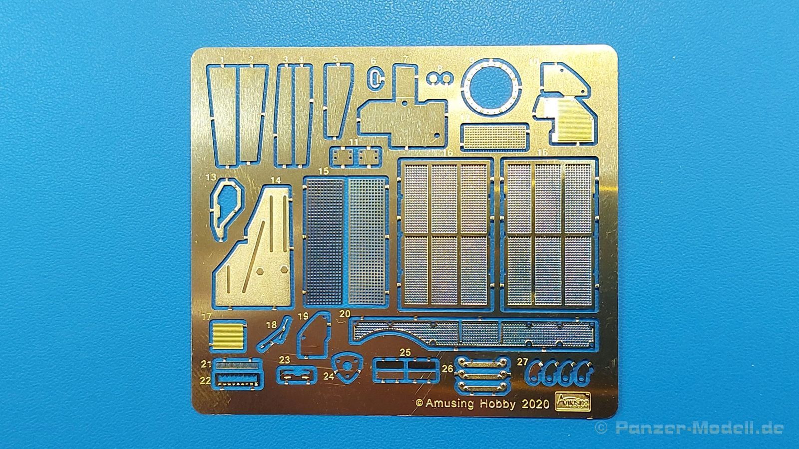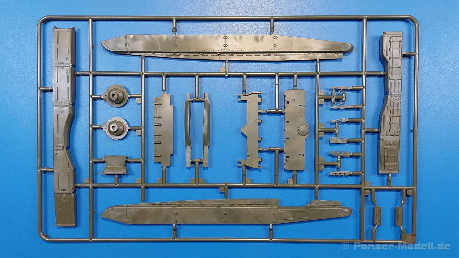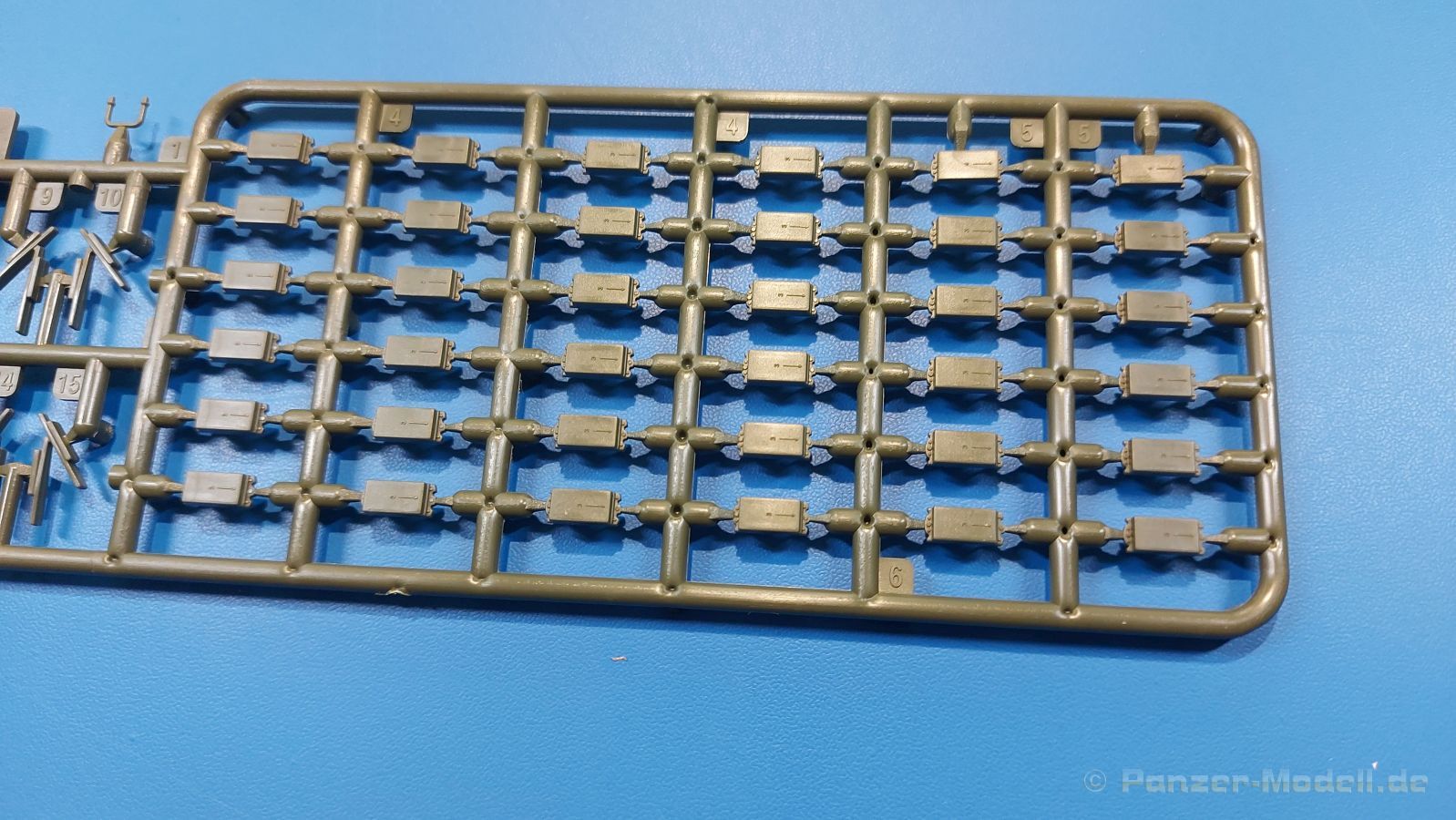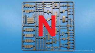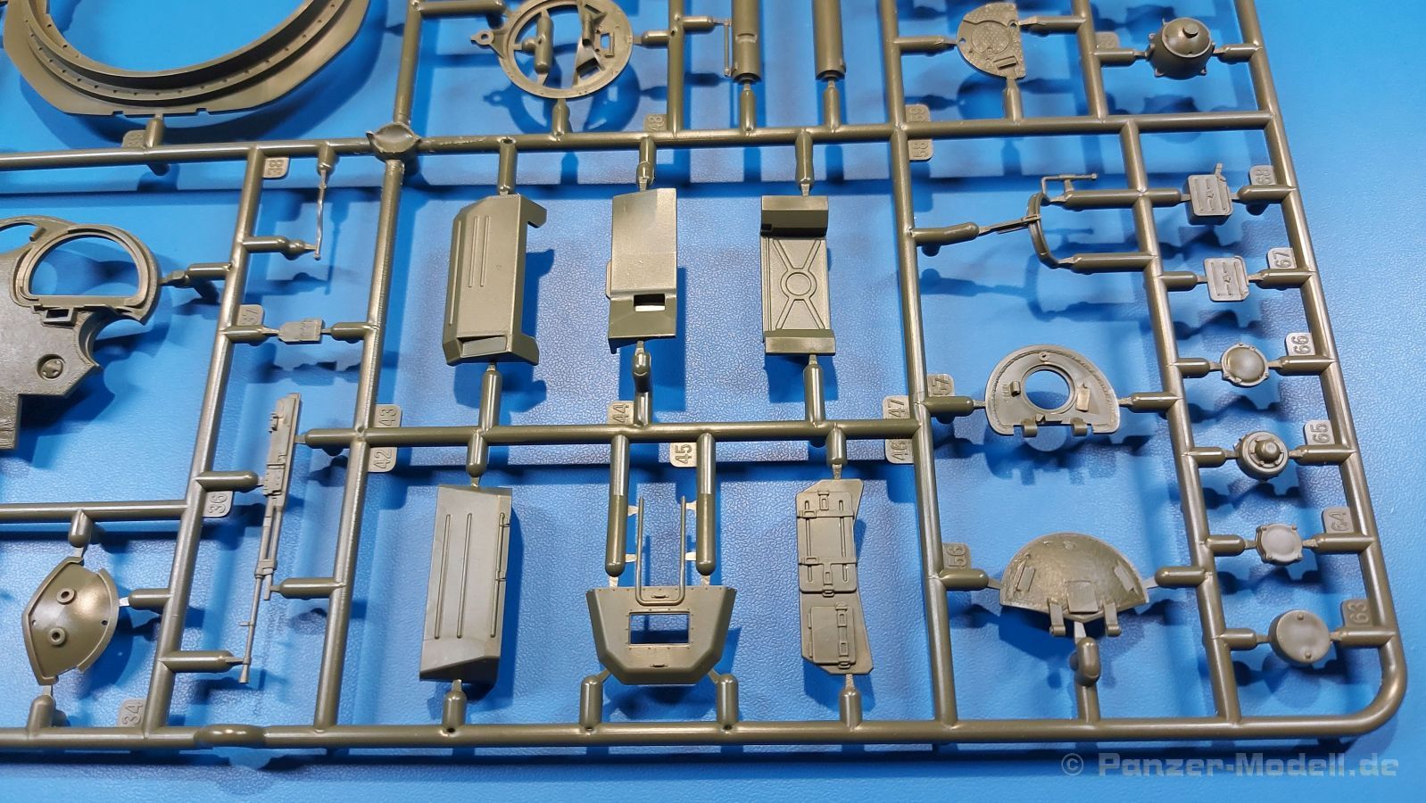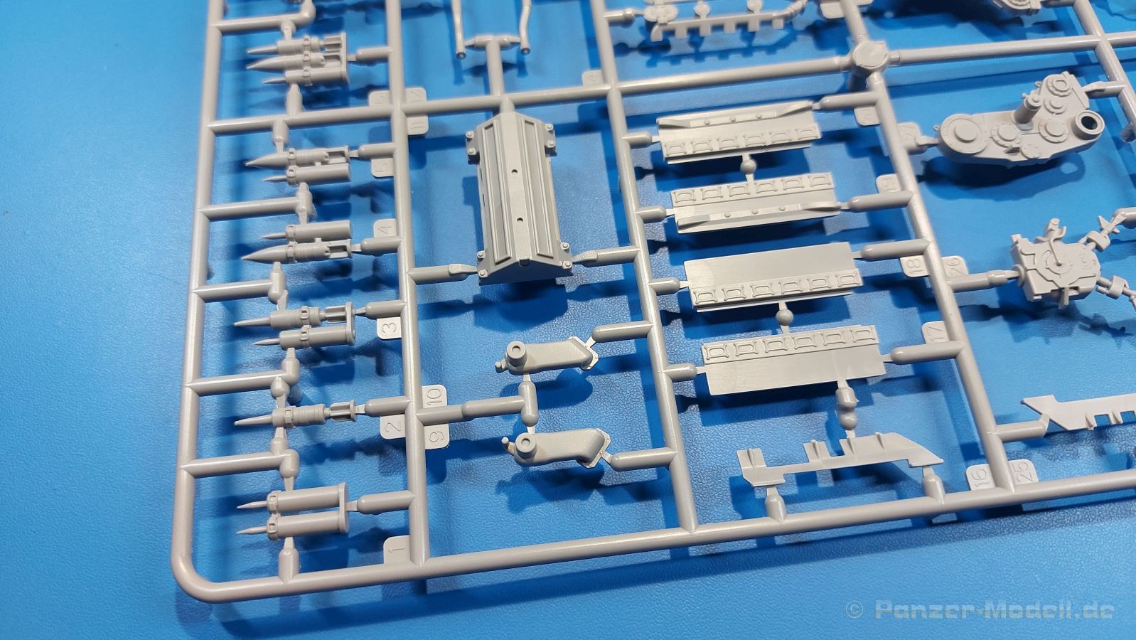 Der Bausatz: Nicht nur im Original gibt es jede Menge T-72. Modellbauer können sich sicherlich nicht über Mangel an entsprechenden Modellen beschweren. Amusing Hobby hat dem ganzen noch einen draufgesetzt und den ersten T-72 mit vollständiger Inneneinrichtung (Fahrer-, Motor- und Kampfraum inkl. Ladekarussel und -mechanismus) auf den Markt gebracht. Auch dieser T-72 AV Bausatz ist voll ausgestattet. Um die ganzen Spritzlinge aufzunehmen, ist der Karton mit 400 x 260 x 120 mm auch etwas größer ausgefallen. Er enthält 54 Spritzlinge (in olivgrün, hellgrau, braun und durchsichtig), die Unterwanne, Turm, 1 Metallfeder, 1 PE-Platine, 1 Kabel, 1 Draht, 1 Abziehbilderbogen und die Bauanleitung. Im Standard der heutigen Zeit ist die Qualität der Teile ausgezeichnet. Scharfe Details, teils kleine und feine Teile, kein Verzug oder Versatz vorhanden. Es gibt zwar Auswerferspuren, aber nur dort, wo sie nach dem Zusammenbau nicht mehr zu sehen sind. Einige hervorstehende Auswerferreste auf manchen Teilen, hier z.B. an den Innenseiten der Kettenschürzen und dem Grabschild, sollten aber entfernt werden, da die Teile sonst nicht korrekt montiert werden können. Das Klarsichtteile für die Scheinwerferscheiben sind schön geriffelt, die Gussstruktur am Turm ist glaubhaft wiedergegeben und wenn man genau hinsieht, sieht man Gussnummern an den Kettengliedern. Die Spritzlinge sind farblich getrennt - Olivgrün für den eigentlichen Panzer, Hellgrau für die Inneneinrichtung und Braun für die Kettenglieder und -bolzen. Schauen wir uns mal die Wanne an. Sie besteht aus einem Teil, das Unterboden und die Seitenteile beinhaltet. Grad der T-72-typische und auffällige Unterboden ist sehr gut dargestellt. Öffnungen für Wartungsdeckel und Notausstiegsluke sind vorhanden. Innen sind zwar mehrere Auswerferspuren zu sehen, aber diese werden wohl komplett von der Inneneinrichtung verdeckt. Die Inneneinrichtung ist ein Modell für sich. Beginnend beim Fahrerraum mit der gesamten Pedalerie, sämtlichen Instrumenten, dem hervorragenden Fahrersitz über die Munitionskästen, Staukästen, Feuerlöscher bis zum unglaublich gut dargestellten Karussell des Autoladers, in dem verschiedene Munitionssorten optional eingesetzt werden können, ist alles vorhanden. Auch im Heck ist der Dieselmotor mit Turboaufladung, sowie der Kühler (der Lüfterpropeller ist ein echter Hingucker!), die Treibstofftanks und das Getriebe vorhanden. Es sind ebenfalls Luftfilter, die Lichtmaschine, wichtige Leitungen und Verstrebungen dargestellt. Auch der Turm ist vollständig eingerichtet. Der Bau des Turmes beginnt mit dem Bau der 125mm Kanone 2A46(D-81). Hier werden zunächst der Verschluss und der Rest der Waffenanlage zusammengesetzt, dann folgen der Richtschützen- und der Kommandantensitz und diverse Anbauteile. Viele Teile der Ladeautomatik wollen auch zusammengesetzt werden. Der Turm besteht aus einer Innen-, einer Außenschale und einem Turmdrehkranz. Zusätzlich wird noch ein Teil des Turmdaches separat eingesetzt. So erreicht man einen ungeheuren Realismus in der Materialdicke. Zudem sind zum Beispiel alle Schutzpolsterungen und Nietungen genauestens dargestellt. Natürlich können alle Luken offen dargestellt werden, und die Maschinengewehre (Koaxial und Flugabwehr) sind mit offenen Rohrmündungen wiedergegeben. Die Optiken des Richtschützen und des Kommandanten, sowie die Funkanlage kann sich wirklich sehen lassen. Beim Fahrwerk werden die Drehstäbe (mit den angegossenen Schwingarmen) in die hervorragend wiedergegeben Unterwanne geklebt, und bleiben beweglich. Dadurch kann das Modell auch an unebene Untergründe angepasst werden, und macht in jedem Diorama eine gute Figur. Auch die Trieb-, Leiträder, Lauf- und Stützrollen sind sehr schön wiedergegeben und setzen sich erfreulicherweise aus nur wenigen Teilen zusammen, ohne hier an der Detaillierung zu sparen. Die Ketten sind als Einzelgliedketten ausgelegt. Schaut man sich die Glieder näher an, entdeckt man in den Riffeln der Außenseite feinste Gussnummern. Jede Seite benötigt fünfundneunzig Kettenglieder. Diese befinden sich an achtundzwanzig Spritzlingen zu je 8 Gliedern, die einzeln abgetrennt und versäubert werden wollen. Die Kette soll voll beweglich bleiben. Dies wird mithilfe der Bolzenlöcher in den Gliedern und separaten Bolzen erreicht. Die Kettenbolzen befinden sich an sieben eigenen Gussästen. Diese können zu Gruppen aus je zwei Bolzen bzw. vier Bolzen ausgeschnitten werden und mit Hilfe einer Montagehilfe, in welche die einzelnen Kettenglieder eingelegt werden, in die Bohrungen der einzelnen Glieder eingesetzt werden. Der Kettenbau wird sicherlich einen gewissen Teil der Arbeit an diesem Bausatz ausmachen. Die Heckplatte hat bereits einen großen Wartungsdeckel mit fünf Schraubenköpfen angegossen. Zwei Ersatzkettenglieder plus deren Halterungen und zwei Bergehaken bringt man beidseitig des Wartungsdeckels an. Der typische Bergebalken fehlt natürlich auch nicht. Er zeigt Trocknungsrisse des Holzes, aber kaum eine Maserung. An den oberen Rand kommen die Halterungen für die Kraftstofffässer. Die typischen Heckfässer sind im Slide-Mould-Verfahren hergestellt, haben bereits die Haltebänder und Leitungsanschlüsse bereits angegossen und werden nur mit den Seitenteilen komplettiert. Die typischen Treibstoffleitungen, welche zum Motor führen, werden mit Hilfe einer Spiralfeder mit eingelegtem Draht simuliert. Die Bugplatte besteht aus drei Platten - Innenplatte mit Elementen der Inneneinrichtung, der eigentlich Panzerplatte und einer Zusatzpanzerplatte. Auf diese Zusatzpanzerplatte werden die Kacheln der Reaktivpanzerung, bestehend aus Einzel- und Gruppenelementen, aufgesetzt. Die Fahrscheinwerfer sind ausgehöhlt und bekommen geriffelte Klarsichtgläser. Die Scheinwerferhalterung sind etwas „komisch“ aufgeteilt. Man klebt die geteilten Gestänge stumpf aufeinander. Die Kettenbleche sind bereits an der Unterwanne angegossen. Es kommen einige Verst