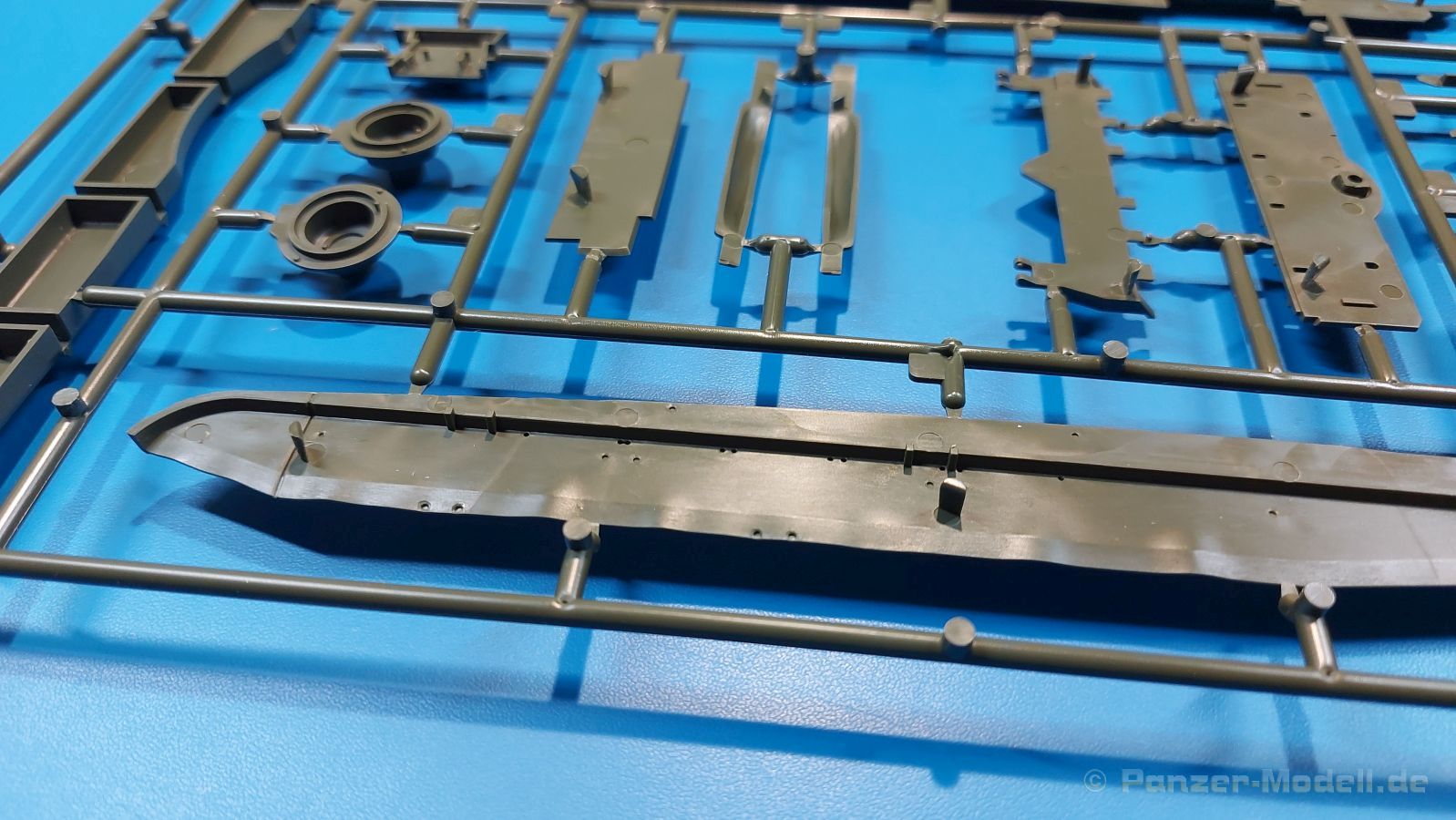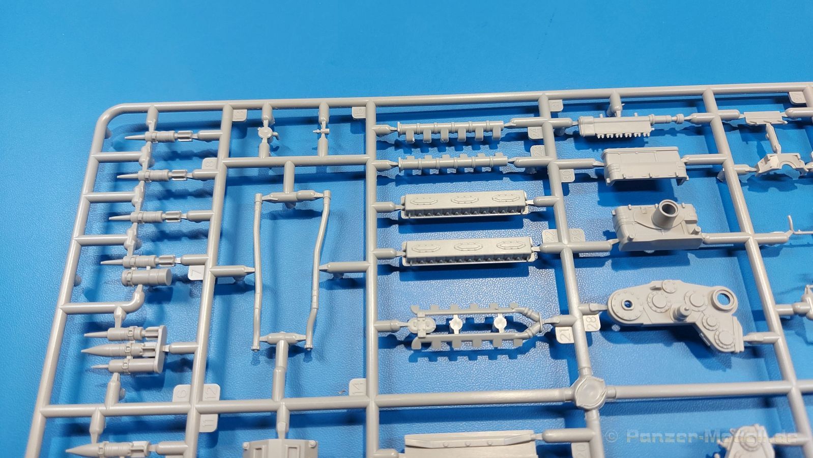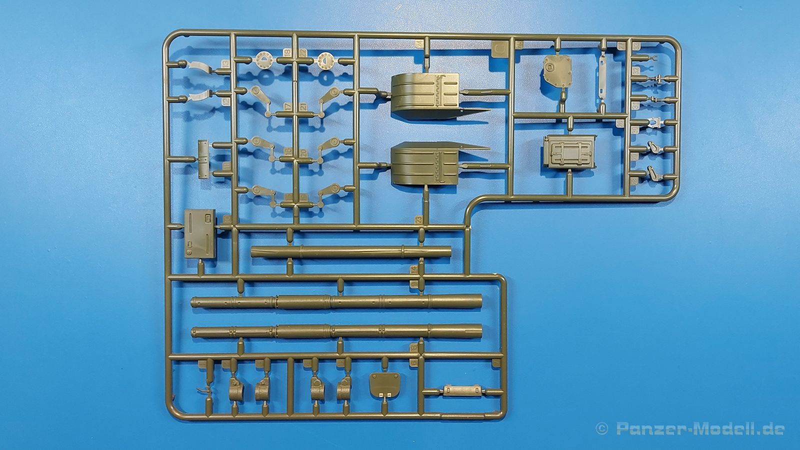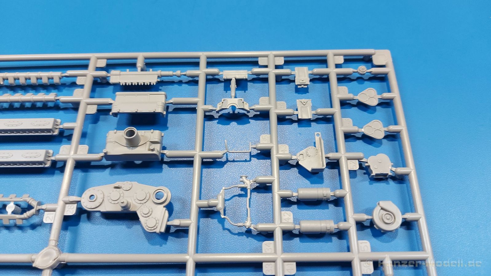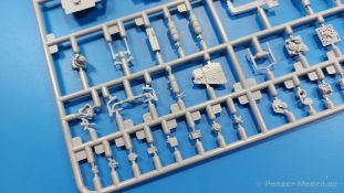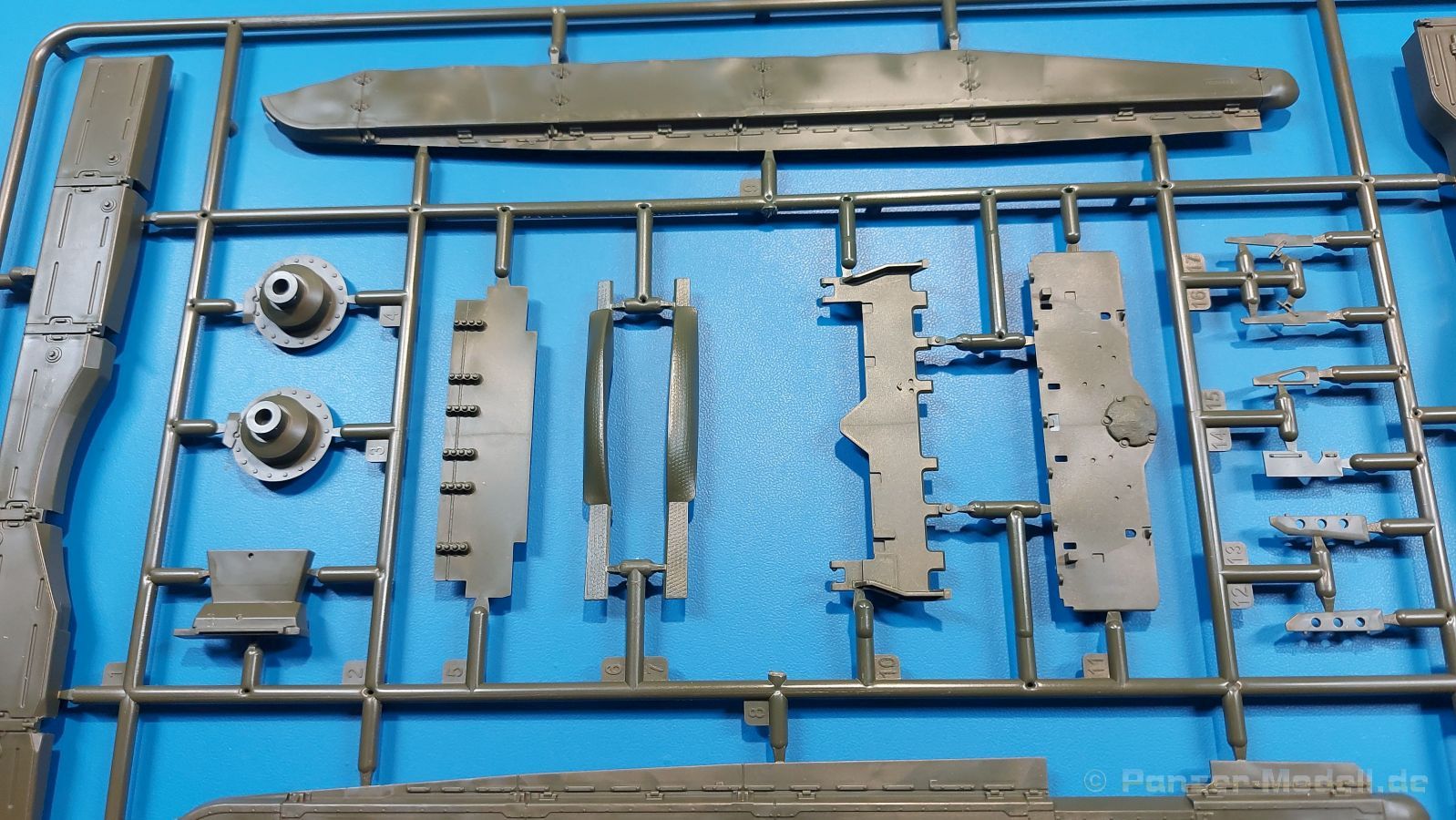 Der Bausatz: Nicht nur im Original gibt es jede Menge T-72. Modellbauer können sich sicherlich nicht über Mangel an entsprechenden Modellen beschweren. Amusing Hobby hat dem ganzen noch einen draufgesetzt und den ersten T-72 mit vollständiger Inneneinrichtung (Fahrer-, Motor- und Kampfraum inkl. Ladekarussel und -mechanismus) auf den Markt gebracht. Auch dieser T-72 AV Bausatz ist voll ausgestattet. Um die ganzen Spritzlinge aufzunehmen, ist der Karton mit 400 x 260 x 120 mm auch etwas größer ausgefallen. Er enthält 54 Spritzlinge (in olivgrün, hellgrau, braun und durchsichtig), die Unterwanne, Turm, 1 Metallfeder, 1 PE-Platine, 1 Kabel, 1 Draht, 1 Abziehbilderbogen und die Bauanleitung. Im Standard der heutigen Zeit ist die Qualität der Teile ausgezeichnet. Scharfe Details, teils kleine und feine Teile, kein Verzug oder Versatz vorhanden. Es gibt zwar Auswerferspuren, aber nur dort, wo sie nach dem Zusammenbau nicht mehr zu sehen sind. Einige hervorstehende Auswerferreste auf manchen Teilen, hier z.B. an den Innenseiten der Kettenschürzen und dem Grabschild, sollten aber entfernt werden, da die Teile sonst nicht korrekt montiert werden können. Das Klarsichtteile für die Scheinwerferscheiben sind schön geriffelt, die Gussstruktur am Turm ist glaubhaft wiedergegeben und wenn man genau hinsieht, sieht man Gussnummern an den Kettengliedern. Die Spritzlinge sind farblich getrennt - Olivgrün für den eigentlichen Panzer, Hellgrau für die Inneneinrichtung und Braun für die Kettenglieder und -bolzen. Schauen wir uns mal die Wanne an. Sie besteht aus einem Teil, das Unterboden und die Seitenteile beinhaltet. Grad der T-72-typische und auffällige Unterboden ist sehr gut dargestellt. Öffnungen für Wartungsdeckel und Notausstiegsluke sind vorhanden. Innen sind zwar mehrere Auswerferspuren zu sehen, aber diese werden wohl komplett von der Inneneinrichtung verdeckt. Die Inneneinrichtung ist ein Modell für sich. Beginnend beim Fahrerraum mit der gesamten Pedalerie, sämtlichen Instrumenten, dem hervorragenden Fahrersitz über die Munitionskästen, Staukästen, Feuerlöscher bis zum unglaublich gut dargestellten Karussell des Autoladers, in dem verschiedene Munitionssorten optional eingesetzt werden können, ist alles vorhanden. Auch im Heck ist der Dieselmotor mit Turboaufladung, sowie der Kühler (der Lüfterpropeller ist ein echter Hingucker!), die Treibstofftanks und das Getriebe vorhanden. Es sind ebenfalls Luftfilter, die Lichtmaschine, wichtige Leitungen und Verstrebungen dargestellt. Auch der Turm ist vollständig eingerichtet. Der Bau des Turmes beginnt mit dem Bau der 125mm Kanone 2A46(D-81). Hier werden zunächst der Verschluss und der Rest der Waffenanlage zusammengesetzt, dann folgen der Richtschützen- und der Kommandantensitz und diverse Anbauteile. Viele Teile der Ladeautomatik wollen auch zusammengesetzt werden. Der Turm besteht aus einer Innen-, einer Außenschale und einem Turmdrehkranz. Zusätzlich wird noch ein Teil des Turmdaches separat eingesetzt. So erreicht man einen ungeheuren Realismus in der Materialdicke. Zudem sind zum Beispiel alle Schutzpolsterungen und Nietungen genauestens dargestellt. Natürlich können alle Luken offen dargestellt werden, und die Maschinengewehre (Koaxial und Flugabwehr) sind mit offenen Rohrmündungen wiedergegeben. Die Optiken des Richtschützen und des Kommandanten, sowie die Funkanlage kann sich wirklich sehen lassen. Beim Fahrwerk werden die Drehstäbe (mit den angegossenen Schwingarmen) in die hervorragend wiedergegeben Unterwanne geklebt, und bleiben beweglich. Dadurch kann das Modell auch an unebene Untergründe angepasst werden, und macht in jedem Diorama eine gute Figur. Auch die Trieb-, Leiträder, Lauf- und Stützrollen sind sehr schön wiedergegeben und setzen sich erfreulicherweise aus nur wenigen Teilen zusammen, ohne hier an der Detaillierung zu sparen. Die Ketten sind als Einzelgliedketten ausgelegt. Schaut man sich die Glieder näher an, entdeckt man in den Riffeln der Außenseite feinste Gussnummern. Jede Seite benötigt fünfundneunzig Kettenglieder. Diese befinden sich an achtundzwanzig Spritzlingen zu je 8 Gliedern, die einzeln abgetrennt und versäubert werden wollen. Die Kette soll voll beweglich bleiben. Dies wird mithilfe der Bolzenlöcher in den Gliedern und separaten Bolzen erreicht. Die Kettenbolzen befinden sich an sieben eigenen Gussästen. Diese können zu Gruppen aus je zwei Bolzen bzw. vier Bolzen ausgeschnitten werden und mit Hilfe einer Montagehilfe, in welche die einzelnen Kettenglieder eingelegt werden, in die Bohrungen der einzelnen Glieder eingesetzt werden. Der Kettenbau wird sicherlich einen gewissen Teil der Arbeit an diesem Bausatz ausmachen. Die Heckplatte hat bereits einen großen Wartungsdeckel mit fünf Schraubenköpfen angegossen. Zwei Ersatzkettenglieder plus deren Halterungen und zwei Bergehaken bringt man beidseitig des Wartungsdeckels an. Der typische Bergebalken fehlt natürlich auch nicht. Er zeigt Trocknungsrisse des Holzes, aber kaum eine Maserung. An den oberen Rand kommen die Halterungen für die Kraftstofffässer. Die typischen Heckfässer sind im Slide-Mould-Verfahren hergestellt, haben bereits die Haltebänder und Leitungsanschlüsse bereits angegossen und werden nur mit den Seitenteilen komplettiert. Die typischen Treibstoffleitungen, welche zum Motor führen, werden mit Hilfe einer Spiralfeder mit eingelegtem Draht simuliert. Die Bugplatte besteht aus drei Platten - Innenplatte mit Elementen der Inneneinrichtung, der eigentlich Panzerplatte und einer Zusatzpanzerplatte. Auf diese Zusatzpanzerplatte werden die Kacheln der Reaktivpanzerung, bestehend aus Einzel- und Gruppenelementen, aufgesetzt. Die Fahrscheinwerfer sind ausgehöhlt und bekommen geriffelte Klarsichtgläser. Die Scheinwerferhalterung sind etwas „komisch“ aufgeteilt. Man klebt die geteilten Gestänge stumpf aufeinander. Die Kettenbleche sind bereits an der Unterwanne angegossen. Es kommen einige Verst