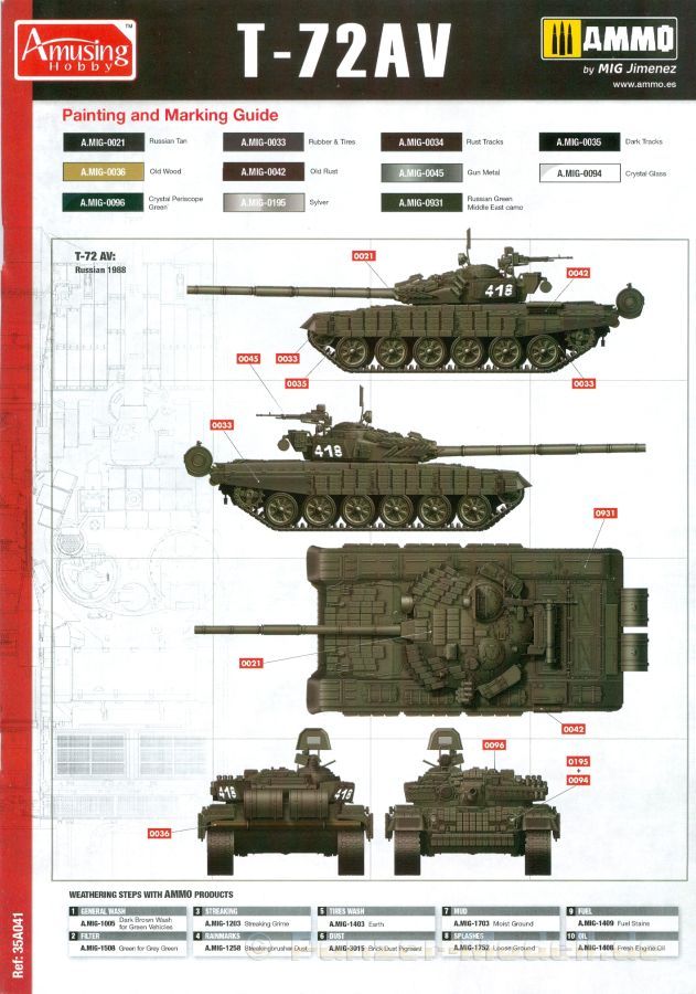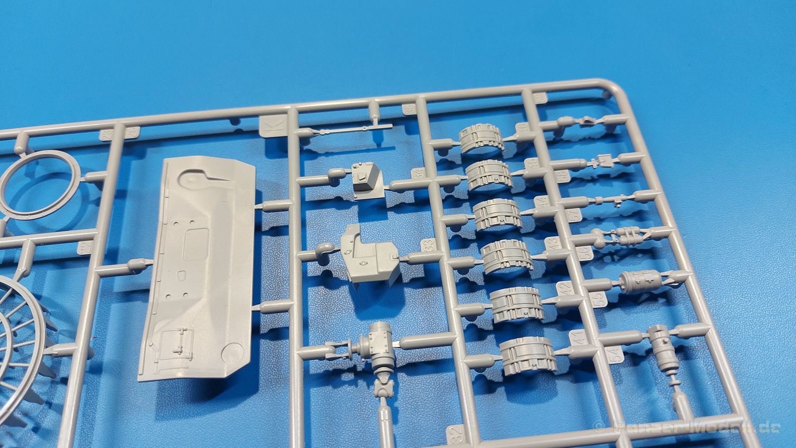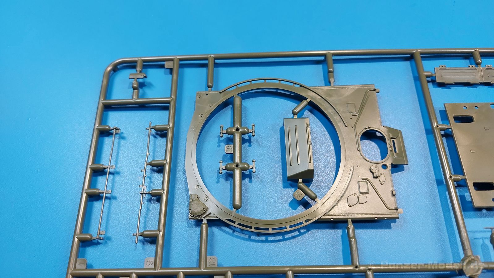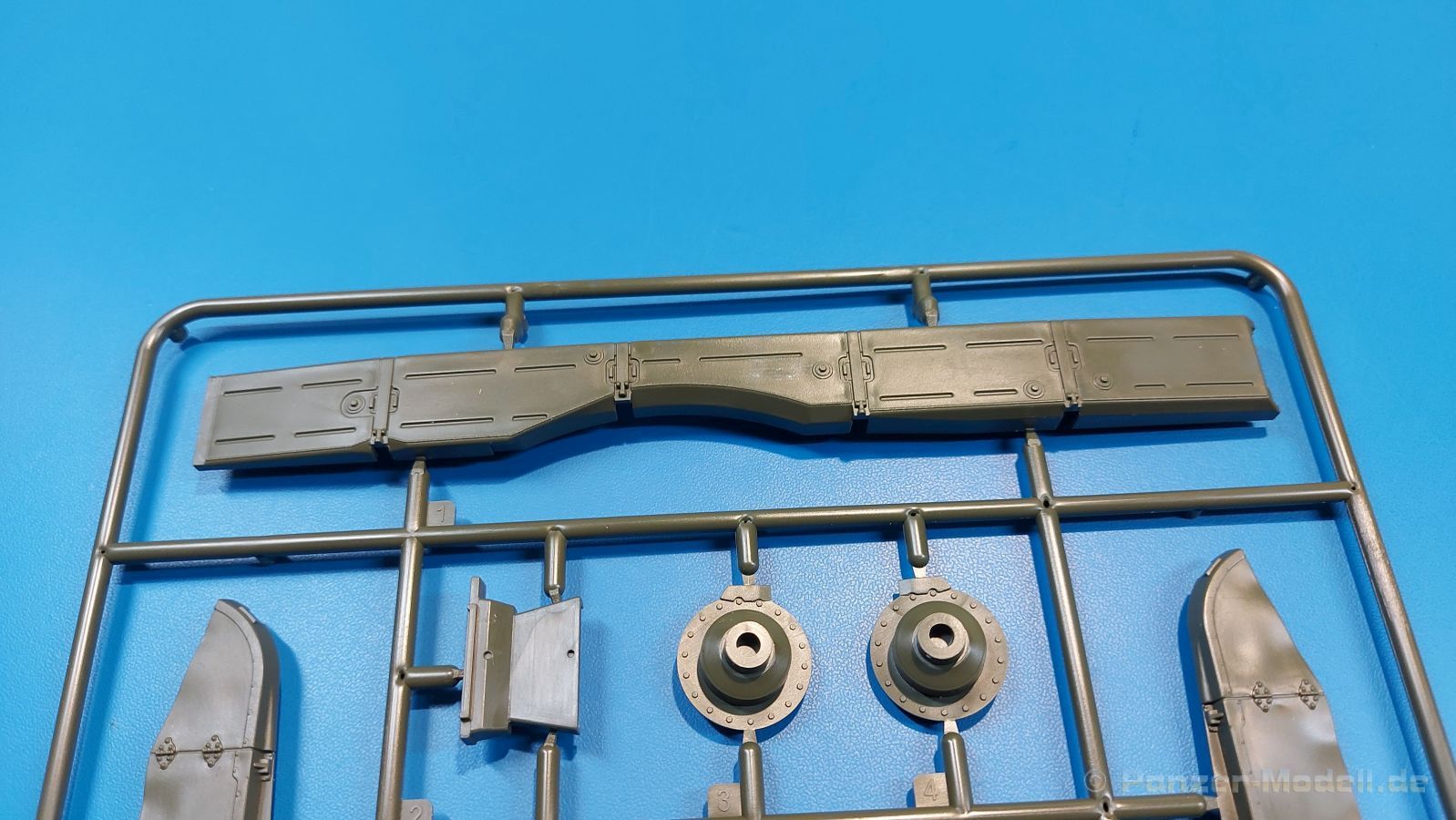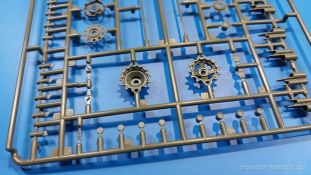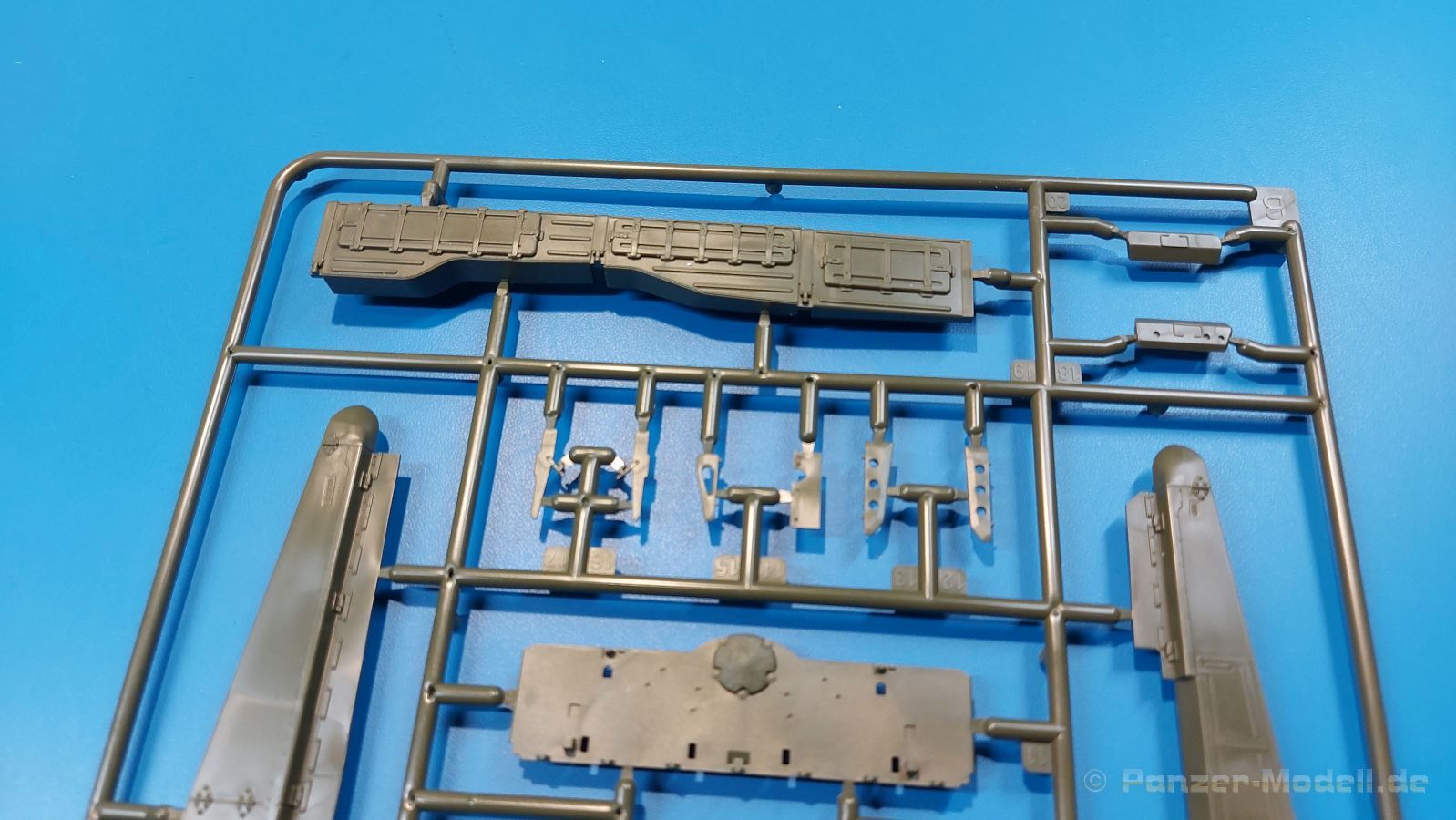 Der Bausatz: Nicht nur im Original gibt es jede Menge T-72. Modellbauer können sich sicherlich nicht über Mangel an entsprechenden Modellen beschweren. Amusing Hobby hat dem ganzen noch einen draufgesetzt und den ersten T-72 mit vollständiger Inneneinrichtung (Fahrer-, Motor- und Kampfraum inkl. Ladekarussel und -mechanismus) auf den Markt gebracht. Auch dieser T-72 AV Bausatz ist voll ausgestattet. Um die ganzen Spritzlinge aufzunehmen, ist der Karton mit 400 x 260 x 120 mm auch etwas größer ausgefallen. Er enthält 54 Spritzlinge (in olivgrün, hellgrau, braun und durchsichtig), die Unterwanne, Turm, 1 Metallfeder, 1 PE-Platine, 1 Kabel, 1 Draht, 1 Abziehbilderbogen und die Bauanleitung. Im Standard der heutigen Zeit ist die Qualität der Teile ausgezeichnet. Scharfe Details, teils kleine und feine Teile, kein Verzug oder Versatz vorhanden. Es gibt zwar Auswerferspuren, aber nur dort, wo sie nach dem Zusammenbau nicht mehr zu sehen sind. Einige hervorstehende Auswerferreste auf manchen Teilen, hier z.B. an den Innenseiten der Kettenschürzen und dem Grabschild, sollten aber entfernt werden, da die Teile sonst nicht korrekt montiert werden können. Das Klarsichtteile für die Scheinwerferscheiben sind schön geriffelt, die Gussstruktur am Turm ist glaubhaft wiedergegeben und wenn man genau hinsieht, sieht man Gussnummern an den Kettengliedern. Die Spritzlinge sind farblich getrennt - Olivgrün für den eigentlichen Panzer, Hellgrau für die Inneneinrichtung und Braun für die Kettenglieder und -bolzen. Schauen wir uns mal die Wanne an. Sie besteht aus einem Teil, das Unterboden und die Seitenteile beinhaltet. Grad der T-72-typische und auffällige Unterboden ist sehr gut dargestellt. Öffnungen für Wartungsdeckel und Notausstiegsluke sind vorhanden. Innen sind zwar mehrere Auswerferspuren zu sehen, aber diese werden wohl komplett von der Inneneinrichtung verdeckt. Die Inneneinrichtung ist ein Modell für sich. Beginnend beim Fahrerraum mit der gesamten Pedalerie, sämtlichen Instrumenten, dem hervorragenden Fahrersitz über die Munitionskästen, Staukästen, Feuerlöscher bis zum unglaublich gut dargestellten Karussell des Autoladers, in dem verschiedene Munitionssorten optional eingesetzt werden können, ist alles vorhanden. Auch im Heck ist der Dieselmotor mit Turboaufladung, sowie der Kühler (der Lüfterpropeller ist ein echter Hingucker!), die Treibstofftanks und das Getriebe vorhanden. Es sind ebenfalls Luftfilter, die Lichtmaschine, wichtige Leitungen und Verstrebungen dargestellt. Auch der Turm ist vollständig eingerichtet. Der Bau des Turmes beginnt mit dem Bau der 125mm Kanone 2A46(D-81). Hier werden zunächst der Verschluss und der Rest der Waffenanlage zusammengesetzt, dann folgen der Richtschützen- und der Kommandantensitz und diverse Anbauteile. Viele Teile der Ladeautomatik wollen auch zusammengesetzt werden. Der Turm besteht aus einer Innen-, einer Außenschale und einem Turmdrehkranz. Zusätzlich wird noch ein Teil des Turmdaches separat eingesetzt. So erreicht man einen ungeheuren Realismus in der Materialdicke. Zudem sind zum Beispiel alle Schutzpolsterungen und Nietungen genauestens dargestellt. Natürlich können alle Luken offen dargestellt werden, und die Maschinengewehre (Koaxial und Flugabwehr) sind mit offenen Rohrmündungen wiedergegeben. Die Optiken des Richtschützen und des Kommandanten, sowie die Funkanlage kann sich wirklich sehen lassen. Beim Fahrwerk werden die Drehstäbe (mit den angegossenen Schwingarmen) in die hervorragend wiedergegeben Unterwanne geklebt, und bleiben beweglich. Dadurch kann das Modell auch an unebene Untergründe angepasst werden, und macht in jedem Diorama eine gute Figur. Auch die Trieb-, Leiträder, Lauf- und Stützrollen sind sehr schön wiedergegeben und setzen sich erfreulicherweise aus nur wenigen Teilen zusammen, ohne hier an der Detaillierung zu sparen. Die Ketten sind als Einzelgliedketten ausgelegt. Schaut man sich die Glieder näher an, entdeckt man in den Riffeln der Außenseite feinste Gussnummern. Jede Seite benötigt fünfundneunzig Kettenglieder. Diese befinden sich an achtundzwanzig Spritzlingen zu je 8 Gliedern, die einzeln abgetrennt und versäubert werden wollen. Die Kette soll voll beweglich bleiben. Dies wird mithilfe der Bolzenlöcher in den Gliedern und separaten Bolzen erreicht. Die Kettenbolzen befinden sich an sieben eigenen Gussästen. Diese können zu Gruppen aus je zwei Bolzen bzw. vier Bolzen ausgeschnitten werden und mit Hilfe einer Montagehilfe, in welche die einzelnen Kettenglieder eingelegt werden, in die Bohrungen der einzelnen Glieder eingesetzt werden. Der Kettenbau wird sicherlich einen gewissen Teil der Arbeit an diesem Bausatz ausmachen. Die Heckplatte hat bereits einen großen Wartungsdeckel mit fünf Schraubenköpfen angegossen. Zwei Ersatzkettenglieder plus deren Halterungen und zwei Bergehaken bringt man beidseitig des Wartungsdeckels an. Der typische Bergebalken fehlt natürlich auch nicht. Er zeigt Trocknungsrisse des Holzes, aber kaum eine Maserung. An den oberen Rand kommen die Halterungen für die Kraftstofffässer. Die typischen Heckfässer sind im Slide-Mould-Verfahren hergestellt, haben bereits die Haltebänder und Leitungsanschlüsse bereits angegossen und werden nur mit den Seitenteilen komplettiert. Die typischen Treibstoffleitungen, welche zum Motor führen, werden mit Hilfe einer Spiralfeder mit eingelegtem Draht simuliert. Die Bugplatte besteht aus drei Platten - Innenplatte mit Elementen der Inneneinrichtung, der eigentlich Panzerplatte und einer Zusatzpanzerplatte. Auf diese Zusatzpanzerplatte werden die Kacheln der Reaktivpanzerung, bestehend aus Einzel- und Gruppenelementen, aufgesetzt. Die Fahrscheinwerfer sind ausgehöhlt und bekommen geriffelte Klarsichtgläser. Die Scheinwerferhalterung sind etwas „komisch“ aufgeteilt. Man klebt die geteilten Gestänge stumpf aufeinander. Die Kettenbleche sind bereits an der Unterwanne angegossen. Es kommen einige Verst