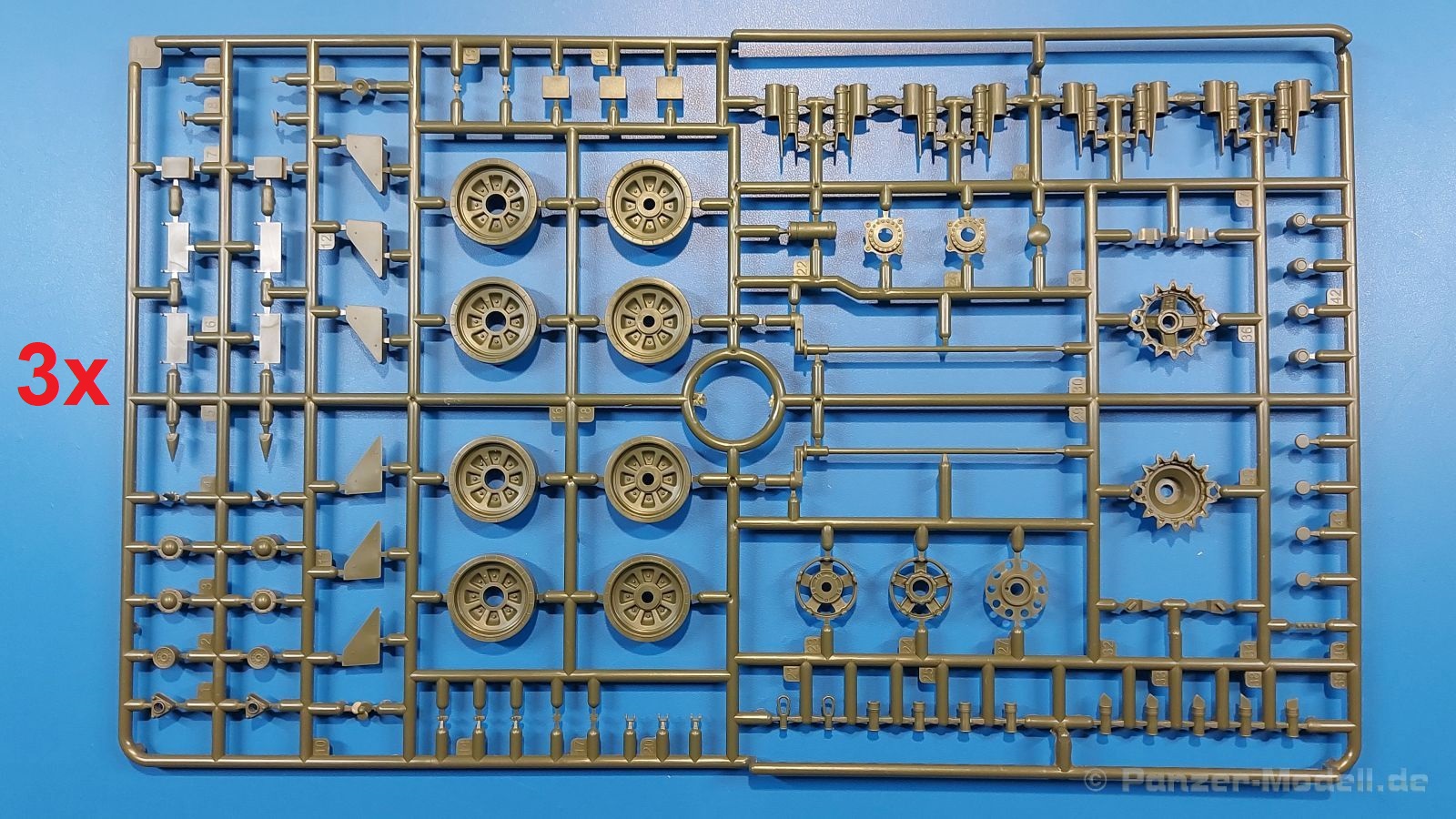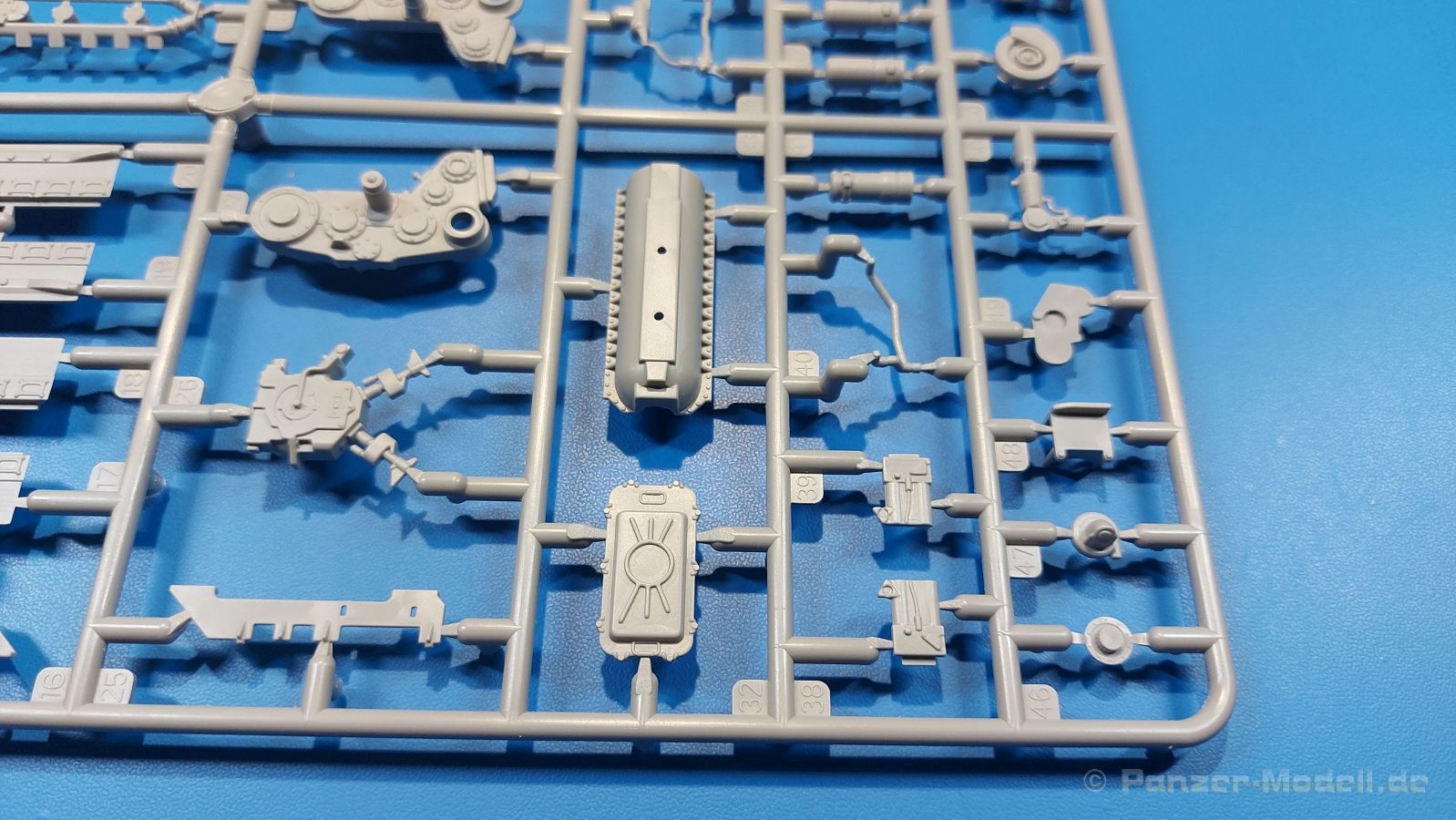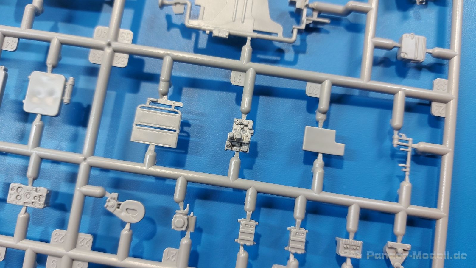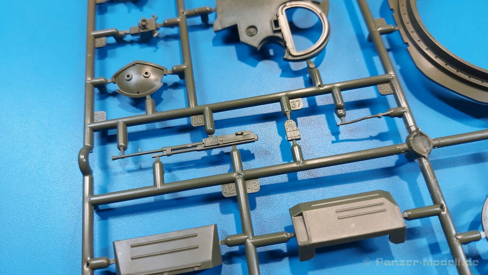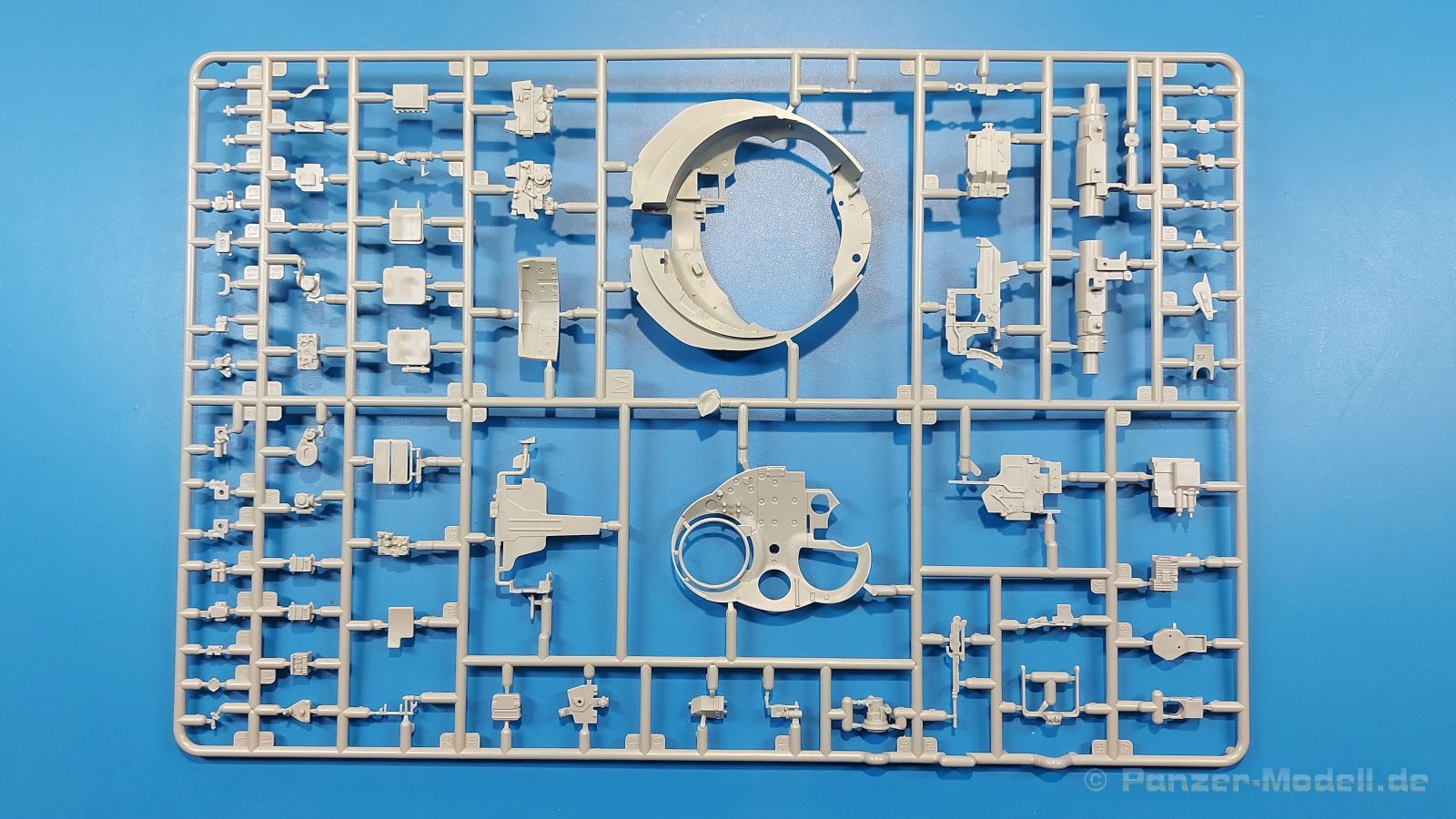 Der Bausatz: Nicht nur im Original gibt es jede Menge T-72. Modellbauer können sich sicherlich nicht über Mangel an entsprechenden Modellen beschweren. Amusing Hobby hat dem ganzen noch einen draufgesetzt und den ersten T-72 mit vollständiger Inneneinrichtung (Fahrer-, Motor- und Kampfraum inkl. Ladekarussel und -mechanismus) auf den Markt gebracht. Auch dieser T-72 AV Bausatz ist voll ausgestattet. Um die ganzen Spritzlinge aufzunehmen, ist der Karton mit 400 x 260 x 120 mm auch etwas größer ausgefallen. Er enthält 54 Spritzlinge (in olivgrün, hellgrau, braun und durchsichtig), die Unterwanne, Turm, 1 Metallfeder, 1 PE-Platine, 1 Kabel, 1 Draht, 1 Abziehbilderbogen und die Bauanleitung. Im Standard der heutigen Zeit ist die Qualität der Teile ausgezeichnet. Scharfe Details, teils kleine und feine Teile, kein Verzug oder Versatz vorhanden. Es gibt zwar Auswerferspuren, aber nur dort, wo sie nach dem Zusammenbau nicht mehr zu sehen sind. Einige hervorstehende Auswerferreste auf manchen Teilen, hier z.B. an den Innenseiten der Kettenschürzen und dem Grabschild, sollten aber entfernt werden, da die Teile sonst nicht korrekt montiert werden können. Das Klarsichtteile für die Scheinwerferscheiben sind schön geriffelt, die Gussstruktur am Turm ist glaubhaft wiedergegeben und wenn man genau hinsieht, sieht man Gussnummern an den Kettengliedern. Die Spritzlinge sind farblich getrennt - Olivgrün für den eigentlichen Panzer, Hellgrau für die Inneneinrichtung und Braun für die Kettenglieder und -bolzen. Schauen wir uns mal die Wanne an. Sie besteht aus einem Teil, das Unterboden und die Seitenteile beinhaltet. Grad der T-72-typische und auffällige Unterboden ist sehr gut dargestellt. Öffnungen für Wartungsdeckel und Notausstiegsluke sind vorhanden. Innen sind zwar mehrere Auswerferspuren zu sehen, aber diese werden wohl komplett von der Inneneinrichtung verdeckt. Die Inneneinrichtung ist ein Modell für sich. Beginnend beim Fahrerraum mit der gesamten Pedalerie, sämtlichen Instrumenten, dem hervorragenden Fahrersitz über die Munitionskästen, Staukästen, Feuerlöscher bis zum unglaublich gut dargestellten Karussell des Autoladers, in dem verschiedene Munitionssorten optional eingesetzt werden können, ist alles vorhanden. Auch im Heck ist der Dieselmotor mit Turboaufladung, sowie der Kühler (der Lüfterpropeller ist ein echter Hingucker!), die Treibstofftanks und das Getriebe vorhanden. Es sind ebenfalls Luftfilter, die Lichtmaschine, wichtige Leitungen und Verstrebungen dargestellt. Auch der Turm ist vollständig eingerichtet. Der Bau des Turmes beginnt mit dem Bau der 125mm Kanone 2A46(D-81). Hier werden zunächst der Verschluss und der Rest der Waffenanlage zusammengesetzt, dann folgen der Richtschützen- und der Kommandantensitz und diverse Anbauteile. Viele Teile der Ladeautomatik wollen auch zusammengesetzt werden. Der Turm besteht aus einer Innen-, einer Außenschale und einem Turmdrehkranz. Zusätzlich wird noch ein Teil des Turmdaches separat eingesetzt. So erreicht man einen ungeheuren Realismus in der Materialdicke. Zudem sind zum Beispiel alle Schutzpolsterungen und Nietungen genauestens dargestellt. Natürlich können alle Luken offen dargestellt werden, und die Maschinengewehre (Koaxial und Flugabwehr) sind mit offenen Rohrmündungen wiedergegeben. Die Optiken des Richtschützen und des Kommandanten, sowie die Funkanlage kann sich wirklich sehen lassen. Beim Fahrwerk werden die Drehstäbe (mit den angegossenen Schwingarmen) in die hervorragend wiedergegeben Unterwanne geklebt, und bleiben beweglich. Dadurch kann das Modell auch an unebene Untergründe angepasst werden, und macht in jedem Diorama eine gute Figur. Auch die Trieb-, Leiträder, Lauf- und Stützrollen sind sehr schön wiedergegeben und setzen sich erfreulicherweise aus nur wenigen Teilen zusammen, ohne hier an der Detaillierung zu sparen. Die Ketten sind als Einzelgliedketten ausgelegt. Schaut man sich die Glieder näher an, entdeckt man in den Riffeln der Außenseite feinste Gussnummern. Jede Seite benötigt fünfundneunzig Kettenglieder. Diese befinden sich an achtundzwanzig Spritzlingen zu je 8 Gliedern, die einzeln abgetrennt und versäubert werden wollen. Die Kette soll voll beweglich bleiben. Dies wird mithilfe der Bolzenlöcher in den Gliedern und separaten Bolzen erreicht. Die Kettenbolzen befinden sich an sieben eigenen Gussästen. Diese können zu Gruppen aus je zwei Bolzen bzw. vier Bolzen ausgeschnitten werden und mit Hilfe einer Montagehilfe, in welche die einzelnen Kettenglieder eingelegt werden, in die Bohrungen der einzelnen Glieder eingesetzt werden. Der Kettenbau wird sicherlich einen gewissen Teil der Arbeit an diesem Bausatz ausmachen. Die Heckplatte hat bereits einen großen Wartungsdeckel mit fünf Schraubenköpfen angegossen. Zwei Ersatzkettenglieder plus deren Halterungen und zwei Bergehaken bringt man beidseitig des Wartungsdeckels an. Der typische Bergebalken fehlt natürlich auch nicht. Er zeigt Trocknungsrisse des Holzes, aber kaum eine Maserung. An den oberen Rand kommen die Halterungen für die Kraftstofffässer. Die typischen Heckfässer sind im Slide-Mould-Verfahren hergestellt, haben bereits die Haltebänder und Leitungsanschlüsse bereits angegossen und werden nur mit den Seitenteilen komplettiert. Die typischen Treibstoffleitungen, welche zum Motor führen, werden mit Hilfe einer Spiralfeder mit eingelegtem Draht simuliert. Die Bugplatte besteht aus drei Platten - Innenplatte mit Elementen der Inneneinrichtung, der eigentlich Panzerplatte und einer Zusatzpanzerplatte. Auf diese Zusatzpanzerplatte werden die Kacheln der Reaktivpanzerung, bestehend aus Einzel- und Gruppenelementen, aufgesetzt. Die Fahrscheinwerfer sind ausgehöhlt und bekommen geriffelte Klarsichtgläser. Die Scheinwerferhalterung sind etwas „komisch“ aufgeteilt. Man klebt die geteilten Gestänge stumpf aufeinander. Die Kettenbleche sind bereits an der Unterwanne angegossen. Es kommen einige Verst