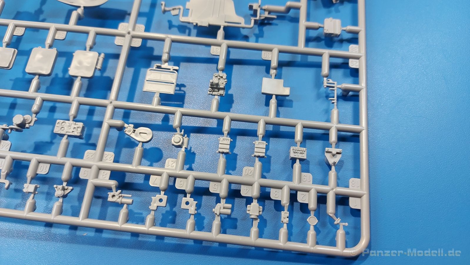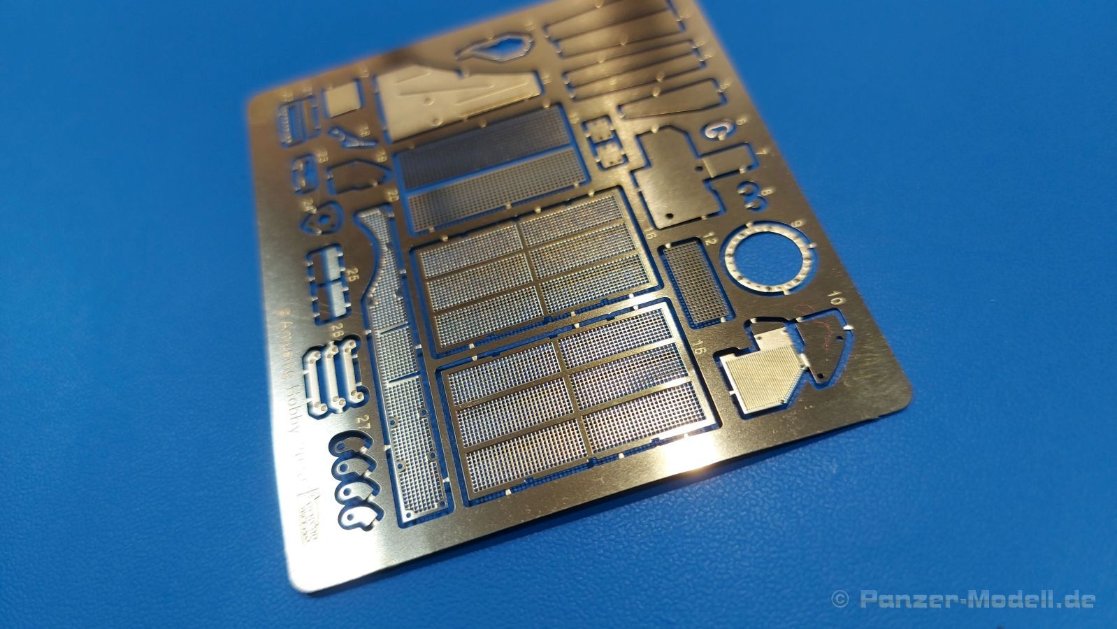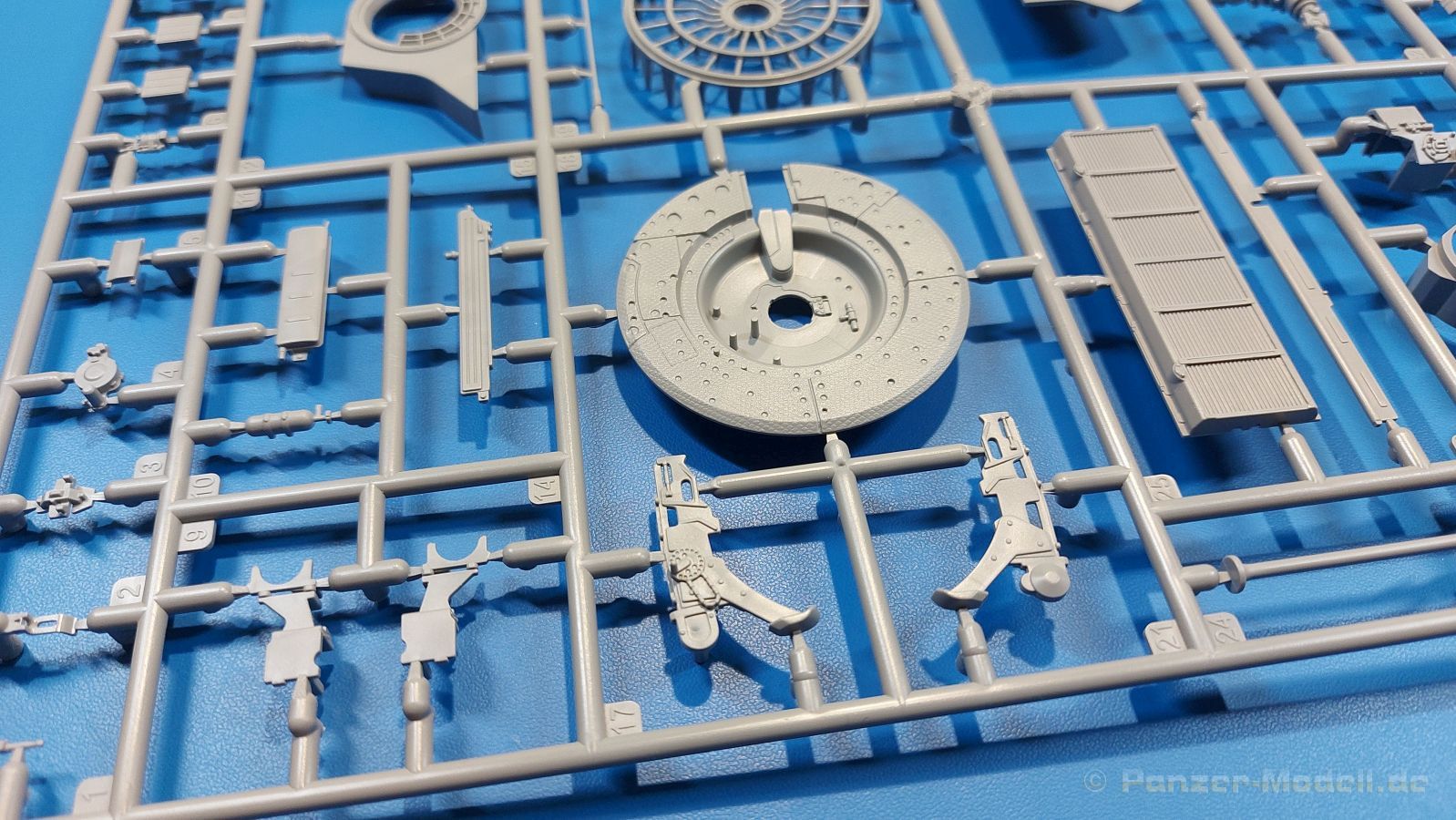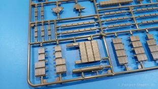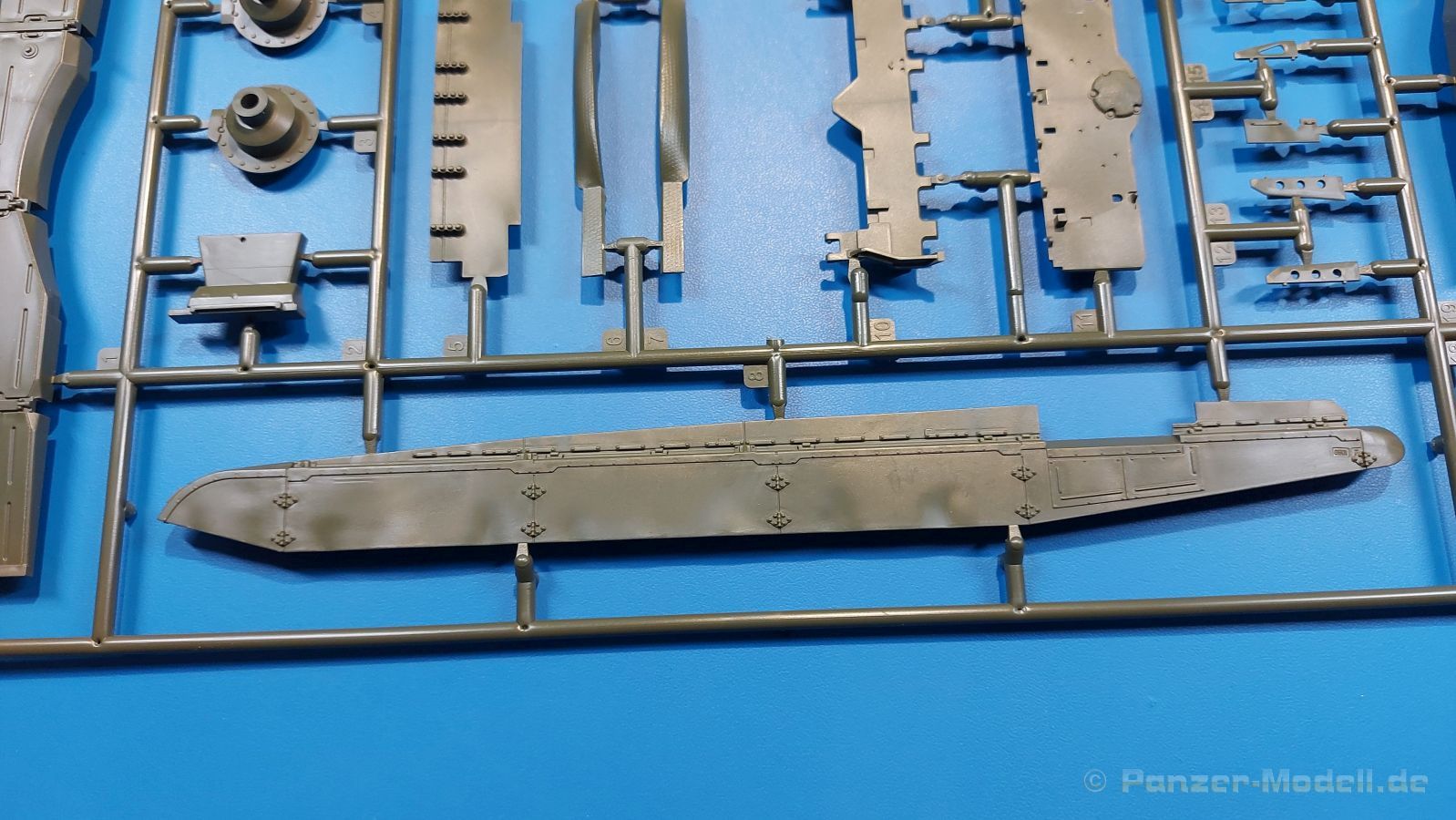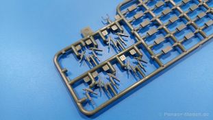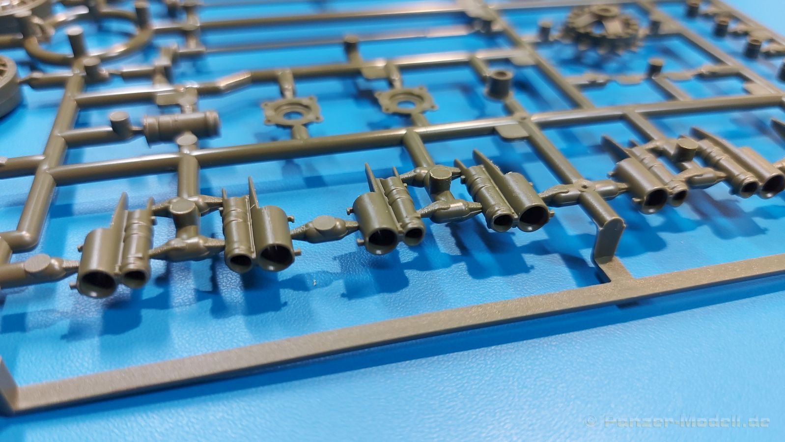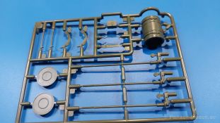 Der Bausatz: Nicht nur im Original gibt es jede Menge T-72. Modellbauer können sich sicherlich nicht über Mangel an entsprechenden Modellen beschweren. Amusing Hobby hat dem ganzen noch einen draufgesetzt und den ersten T-72 mit vollständiger Inneneinrichtung (Fahrer-, Motor- und Kampfraum inkl. Ladekarussel und -mechanismus) auf den Markt gebracht. Auch dieser T-72 AV Bausatz ist voll ausgestattet. Um die ganzen Spritzlinge aufzunehmen, ist der Karton mit 400 x 260 x 120 mm auch etwas größer ausgefallen. Er enthält 54 Spritzlinge (in olivgrün, hellgrau, braun und durchsichtig), die Unterwanne, Turm, 1 Metallfeder, 1 PE-Platine, 1 Kabel, 1 Draht, 1 Abziehbilderbogen und die Bauanleitung. Im Standard der heutigen Zeit ist die Qualität der Teile ausgezeichnet. Scharfe Details, teils kleine und feine Teile, kein Verzug oder Versatz vorhanden. Es gibt zwar Auswerferspuren, aber nur dort, wo sie nach dem Zusammenbau nicht mehr zu sehen sind. Einige hervorstehende Auswerferreste auf manchen Teilen, hier z.B. an den Innenseiten der Kettenschürzen und dem Grabschild, sollten aber entfernt werden, da die Teile sonst nicht korrekt montiert werden können. Das Klarsichtteile für die Scheinwerferscheiben sind schön geriffelt, die Gussstruktur am Turm ist glaubhaft wiedergegeben und wenn man genau hinsieht, sieht man Gussnummern an den Kettengliedern. Die Spritzlinge sind farblich getrennt - Olivgrün für den eigentlichen Panzer, Hellgrau für die Inneneinrichtung und Braun für die Kettenglieder und -bolzen. Schauen wir uns mal die Wanne an. Sie besteht aus einem Teil, das Unterboden und die Seitenteile beinhaltet. Grad der T-72-typische und auffällige Unterboden ist sehr gut dargestellt. Öffnungen für Wartungsdeckel und Notausstiegsluke sind vorhanden. Innen sind zwar mehrere Auswerferspuren zu sehen, aber diese werden wohl komplett von der Inneneinrichtung verdeckt. Die Inneneinrichtung ist ein Modell für sich. Beginnend beim Fahrerraum mit der gesamten Pedalerie, sämtlichen Instrumenten, dem hervorragenden Fahrersitz über die Munitionskästen, Staukästen, Feuerlöscher bis zum unglaublich gut dargestellten Karussell des Autoladers, in dem verschiedene Munitionssorten optional eingesetzt werden können, ist alles vorhanden. Auch im Heck ist der Dieselmotor mit Turboaufladung, sowie der Kühler (der Lüfterpropeller ist ein echter Hingucker!), die Treibstofftanks und das Getriebe vorhanden. Es sind ebenfalls Luftfilter, die Lichtmaschine, wichtige Leitungen und Verstrebungen dargestellt. Auch der Turm ist vollständig eingerichtet. Der Bau des Turmes beginnt mit dem Bau der 125mm Kanone 2A46(D-81). Hier werden zunächst der Verschluss und der Rest der Waffenanlage zusammengesetzt, dann folgen der Richtschützen- und der Kommandantensitz und diverse Anbauteile. Viele Teile der Ladeautomatik wollen auch zusammengesetzt werden. Der Turm besteht aus einer Innen-, einer Außenschale und einem Turmdrehkranz. Zusätzlich wird noch ein Teil des Turmdaches separat eingesetzt. So erreicht man einen ungeheuren Realismus in der Materialdicke. Zudem sind zum Beispiel alle Schutzpolsterungen und Nietungen genauestens dargestellt. Natürlich können alle Luken offen dargestellt werden, und die Maschinengewehre (Koaxial und Flugabwehr) sind mit offenen Rohrmündungen wiedergegeben. Die Optiken des Richtschützen und des Kommandanten, sowie die Funkanlage kann sich wirklich sehen lassen. Beim Fahrwerk werden die Drehstäbe (mit den angegossenen Schwingarmen) in die hervorragend wiedergegeben Unterwanne geklebt, und bleiben beweglich. Dadurch kann das Modell auch an unebene Untergründe angepasst werden, und macht in jedem Diorama eine gute Figur. Auch die Trieb-, Leiträder, Lauf- und Stützrollen sind sehr schön wiedergegeben und setzen sich erfreulicherweise aus nur wenigen Teilen zusammen, ohne hier an der Detaillierung zu sparen. Die Ketten sind als Einzelgliedketten ausgelegt. Schaut man sich die Glieder näher an, entdeckt man in den Riffeln der Außenseite feinste Gussnummern. Jede Seite benötigt fünfundneunzig Kettenglieder. Diese befinden sich an achtundzwanzig Spritzlingen zu je 8 Gliedern, die einzeln abgetrennt und versäubert werden wollen. Die Kette soll voll beweglich bleiben. Dies wird mithilfe der Bolzenlöcher in den Gliedern und separaten Bolzen erreicht. Die Kettenbolzen befinden sich an sieben eigenen Gussästen. Diese können zu Gruppen aus je zwei Bolzen bzw. vier Bolzen ausgeschnitten werden und mit Hilfe einer Montagehilfe, in welche die einzelnen Kettenglieder eingelegt werden, in die Bohrungen der einzelnen Glieder eingesetzt werden. Der Kettenbau wird sicherlich einen gewissen Teil der Arbeit an diesem Bausatz ausmachen. Die Heckplatte hat bereits einen großen Wartungsdeckel mit fünf Schraubenköpfen angegossen. Zwei Ersatzkettenglieder plus deren Halterungen und zwei Bergehaken bringt man beidseitig des Wartungsdeckels an. Der typische Bergebalken fehlt natürlich auch nicht. Er zeigt Trocknungsrisse des Holzes, aber kaum eine Maserung. An den oberen Rand kommen die Halterungen für die Kraftstofffässer. Die typischen Heckfässer sind im Slide-Mould-Verfahren hergestellt, haben bereits die Haltebänder und Leitungsanschlüsse bereits angegossen und werden nur mit den Seitenteilen komplettiert. Die typischen Treibstoffleitungen, welche zum Motor führen, werden mit Hilfe einer Spiralfeder mit eingelegtem Draht simuliert. Die Bugplatte besteht aus drei Platten - Innenplatte mit Elementen der Inneneinrichtung, der eigentlich Panzerplatte und einer Zusatzpanzerplatte. Auf diese Zusatzpanzerplatte werden die Kacheln der Reaktivpanzerung, bestehend aus Einzel- und Gruppenelementen, aufgesetzt. Die Fahrscheinwerfer sind ausgehöhlt und bekommen geriffelte Klarsichtgläser. Die Scheinwerferhalterung sind etwas „komisch“ aufgeteilt. Man klebt die geteilten Gestänge stumpf aufeinander. Die Kettenbleche sind bereits an der Unterwanne angegossen. Es kommen einige Verst