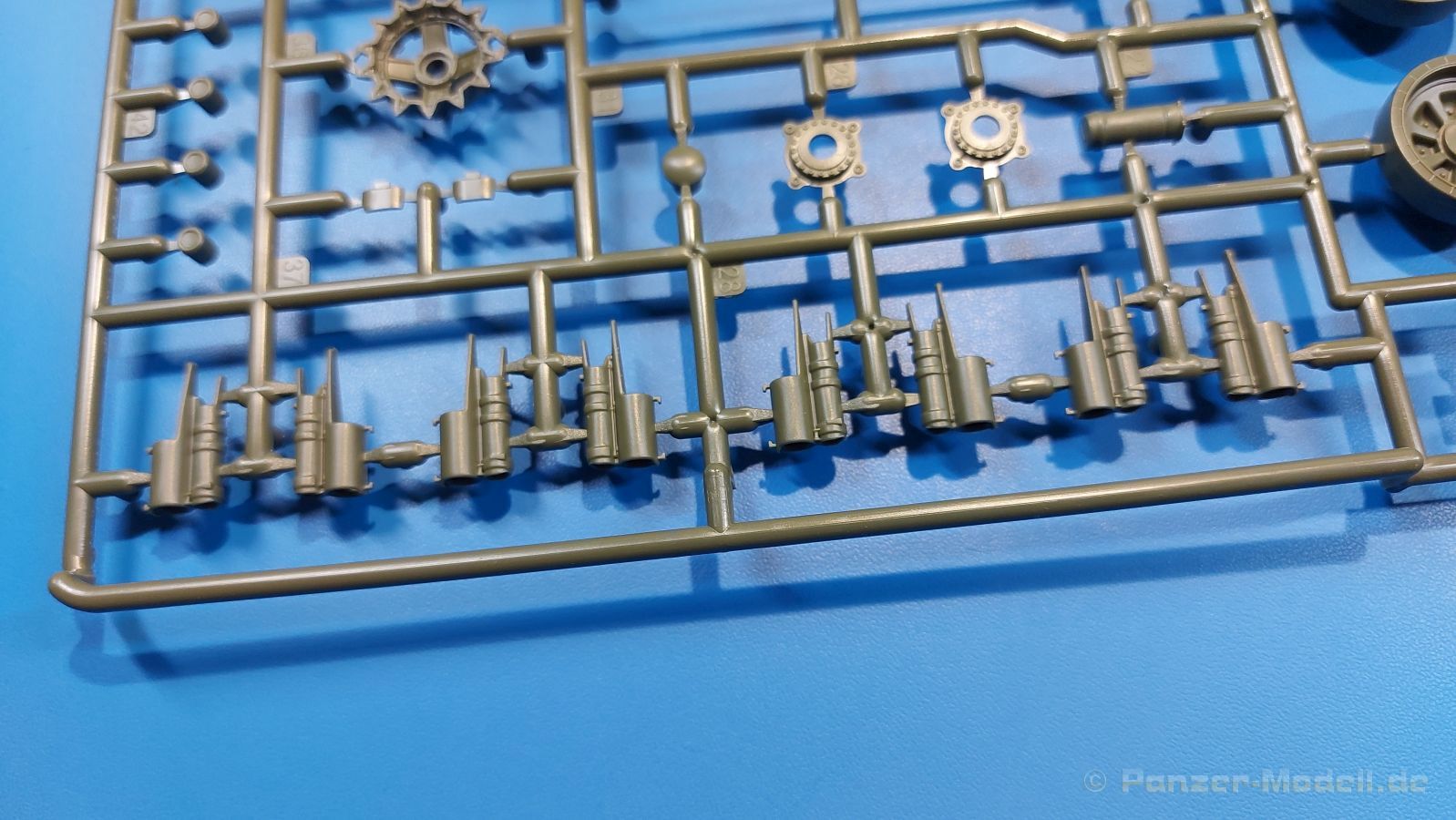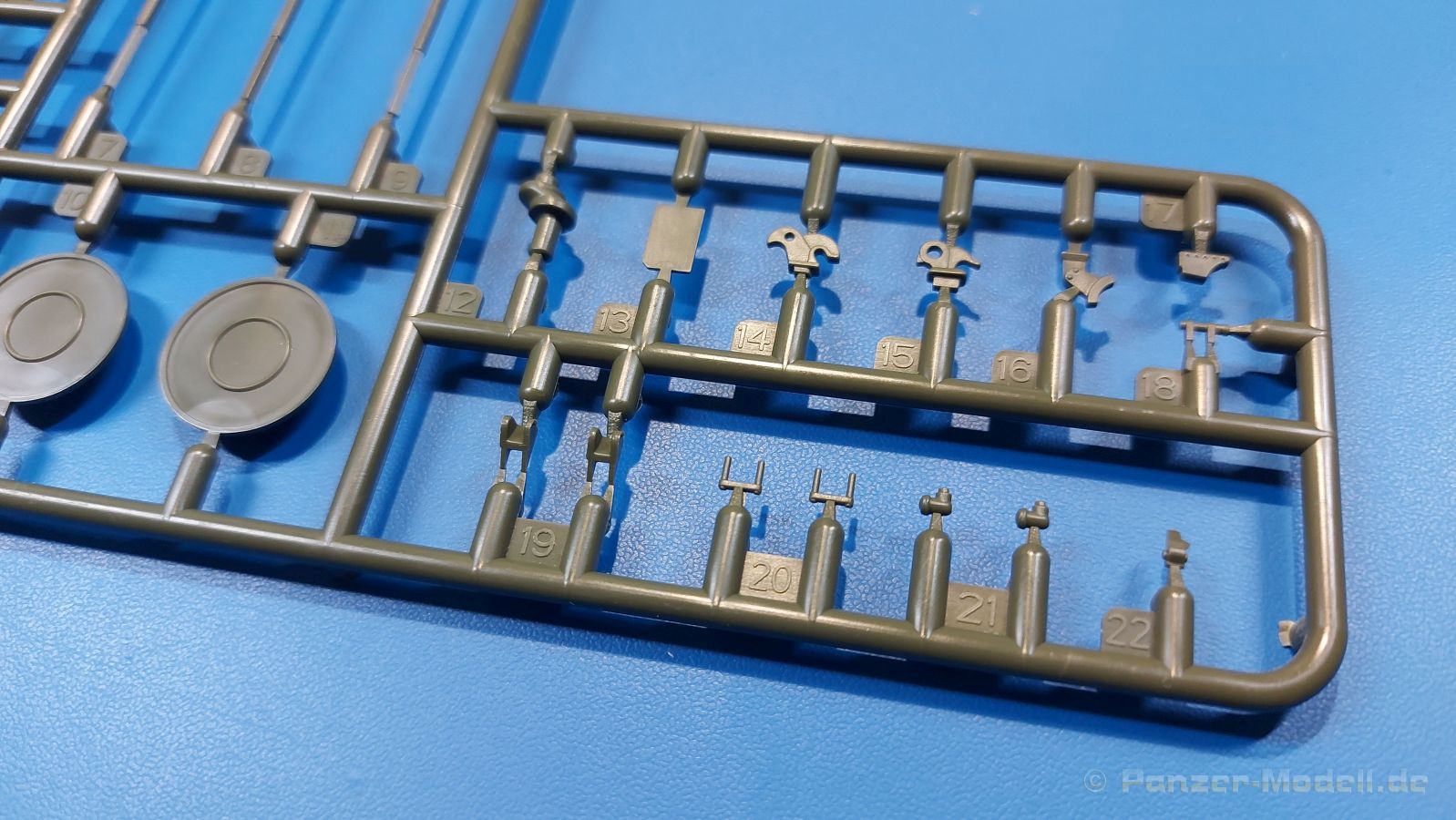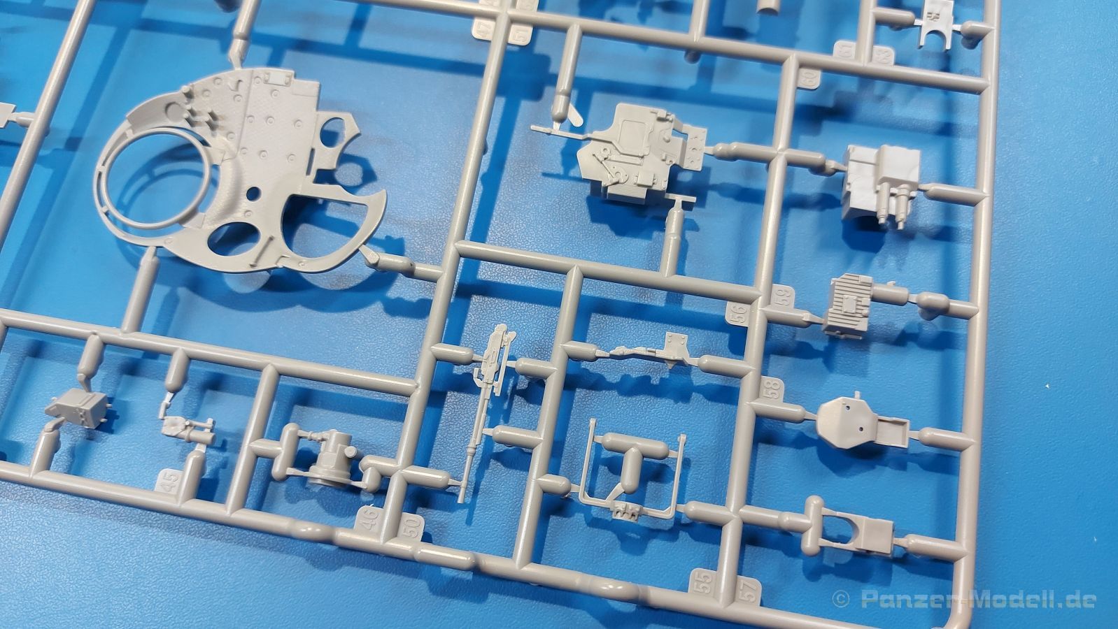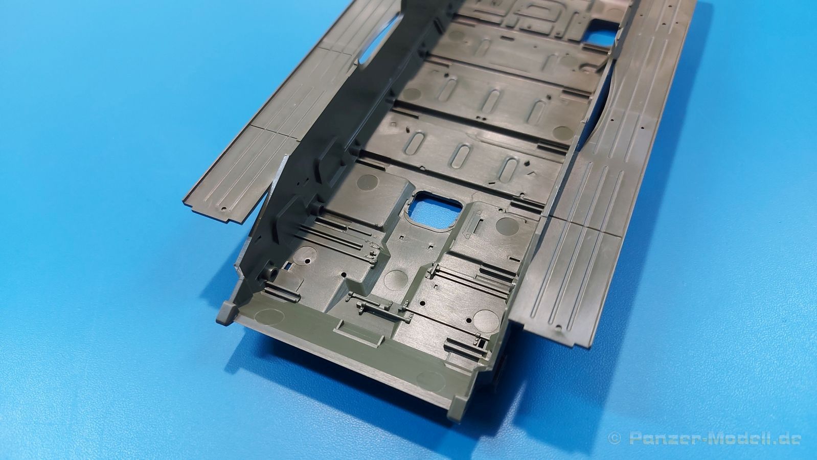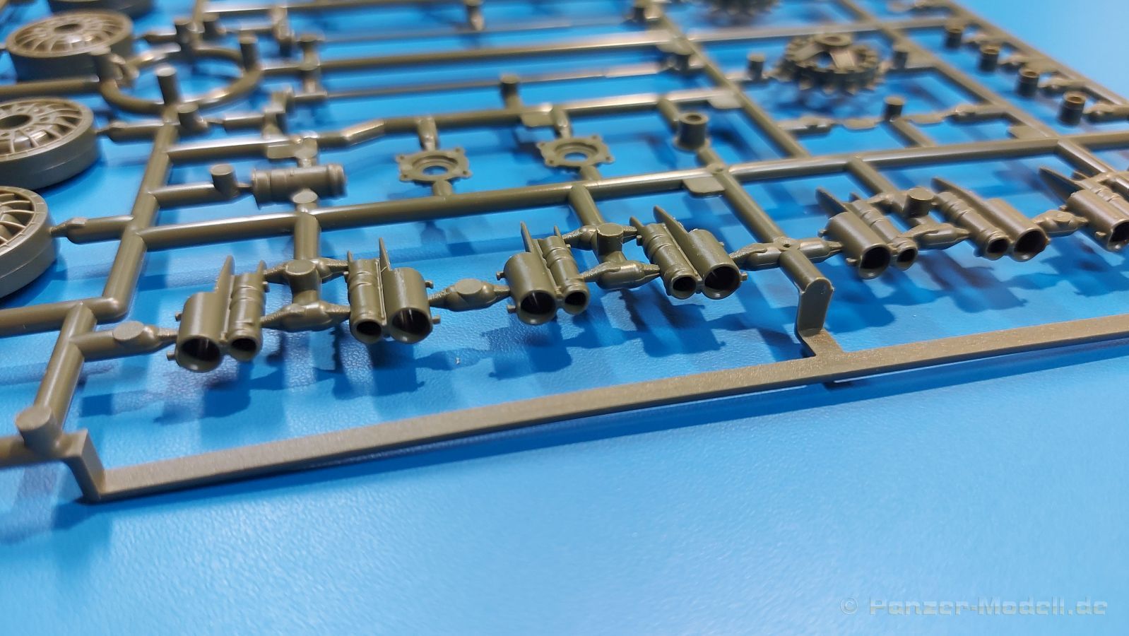 Der Bausatz: Nicht nur im Original gibt es jede Menge T-72. Modellbauer können sich sicherlich nicht über Mangel an entsprechenden Modellen beschweren. Amusing Hobby hat dem ganzen noch einen draufgesetzt und den ersten T-72 mit vollständiger Inneneinrichtung (Fahrer-, Motor- und Kampfraum inkl. Ladekarussel und -mechanismus) auf den Markt gebracht. Auch dieser T-72 AV Bausatz ist voll ausgestattet. Um die ganzen Spritzlinge aufzunehmen, ist der Karton mit 400 x 260 x 120 mm auch etwas größer ausgefallen. Er enthält 54 Spritzlinge (in olivgrün, hellgrau, braun und durchsichtig), die Unterwanne, Turm, 1 Metallfeder, 1 PE-Platine, 1 Kabel, 1 Draht, 1 Abziehbilderbogen und die Bauanleitung. Im Standard der heutigen Zeit ist die Qualität der Teile ausgezeichnet. Scharfe Details, teils kleine und feine Teile, kein Verzug oder Versatz vorhanden. Es gibt zwar Auswerferspuren, aber nur dort, wo sie nach dem Zusammenbau nicht mehr zu sehen sind. Einige hervorstehende Auswerferreste auf manchen Teilen, hier z.B. an den Innenseiten der Kettenschürzen und dem Grabschild, sollten aber entfernt werden, da die Teile sonst nicht korrekt montiert werden können. Das Klarsichtteile für die Scheinwerferscheiben sind schön geriffelt, die Gussstruktur am Turm ist glaubhaft wiedergegeben und wenn man genau hinsieht, sieht man Gussnummern an den Kettengliedern. Die Spritzlinge sind farblich getrennt - Olivgrün für den eigentlichen Panzer, Hellgrau für die Inneneinrichtung und Braun für die Kettenglieder und -bolzen. Schauen wir uns mal die Wanne an. Sie besteht aus einem Teil, das Unterboden und die Seitenteile beinhaltet. Grad der T-72-typische und auffällige Unterboden ist sehr gut dargestellt. Öffnungen für Wartungsdeckel und Notausstiegsluke sind vorhanden. Innen sind zwar mehrere Auswerferspuren zu sehen, aber diese werden wohl komplett von der Inneneinrichtung verdeckt. Die Inneneinrichtung ist ein Modell für sich. Beginnend beim Fahrerraum mit der gesamten Pedalerie, sämtlichen Instrumenten, dem hervorragenden Fahrersitz über die Munitionskästen, Staukästen, Feuerlöscher bis zum unglaublich gut dargestellten Karussell des Autoladers, in dem verschiedene Munitionssorten optional eingesetzt werden können, ist alles vorhanden. Auch im Heck ist der Dieselmotor mit Turboaufladung, sowie der Kühler (der Lüfterpropeller ist ein echter Hingucker!), die Treibstofftanks und das Getriebe vorhanden. Es sind ebenfalls Luftfilter, die Lichtmaschine, wichtige Leitungen und Verstrebungen dargestellt. Auch der Turm ist vollständig eingerichtet. Der Bau des Turmes beginnt mit dem Bau der 125mm Kanone 2A46(D-81). Hier werden zunächst der Verschluss und der Rest der Waffenanlage zusammengesetzt, dann folgen der Richtschützen- und der Kommandantensitz und diverse Anbauteile. Viele Teile der Ladeautomatik wollen auch zusammengesetzt werden. Der Turm besteht aus einer Innen-, einer Außenschale und einem Turmdrehkranz. Zusätzlich wird noch ein Teil des Turmdaches separat eingesetzt. So erreicht man einen ungeheuren Realismus in der Materialdicke. Zudem sind zum Beispiel alle Schutzpolsterungen und Nietungen genauestens dargestellt. Natürlich können alle Luken offen dargestellt werden, und die Maschinengewehre (Koaxial und Flugabwehr) sind mit offenen Rohrmündungen wiedergegeben. Die Optiken des Richtschützen und des Kommandanten, sowie die Funkanlage kann sich wirklich sehen lassen. Beim Fahrwerk werden die Drehstäbe (mit den angegossenen Schwingarmen) in die hervorragend wiedergegeben Unterwanne geklebt, und bleiben beweglich. Dadurch kann das Modell auch an unebene Untergründe angepasst werden, und macht in jedem Diorama eine gute Figur. Auch die Trieb-, Leiträder, Lauf- und Stützrollen sind sehr schön wiedergegeben und setzen sich erfreulicherweise aus nur wenigen Teilen zusammen, ohne hier an der Detaillierung zu sparen. Die Ketten sind als Einzelgliedketten ausgelegt. Schaut man sich die Glieder näher an, entdeckt man in den Riffeln der Außenseite feinste Gussnummern. Jede Seite benötigt fünfundneunzig Kettenglieder. Diese befinden sich an achtundzwanzig Spritzlingen zu je 8 Gliedern, die einzeln abgetrennt und versäubert werden wollen. Die Kette soll voll beweglich bleiben. Dies wird mithilfe der Bolzenlöcher in den Gliedern und separaten Bolzen erreicht. Die Kettenbolzen befinden sich an sieben eigenen Gussästen. Diese können zu Gruppen aus je zwei Bolzen bzw. vier Bolzen ausgeschnitten werden und mit Hilfe einer Montagehilfe, in welche die einzelnen Kettenglieder eingelegt werden, in die Bohrungen der einzelnen Glieder eingesetzt werden. Der Kettenbau wird sicherlich einen gewissen Teil der Arbeit an diesem Bausatz ausmachen. Die Heckplatte hat bereits einen großen Wartungsdeckel mit fünf Schraubenköpfen angegossen. Zwei Ersatzkettenglieder plus deren Halterungen und zwei Bergehaken bringt man beidseitig des Wartungsdeckels an. Der typische Bergebalken fehlt natürlich auch nicht. Er zeigt Trocknungsrisse des Holzes, aber kaum eine Maserung. An den oberen Rand kommen die Halterungen für die Kraftstofffässer. Die typischen Heckfässer sind im Slide-Mould-Verfahren hergestellt, haben bereits die Haltebänder und Leitungsanschlüsse bereits angegossen und werden nur mit den Seitenteilen komplettiert. Die typischen Treibstoffleitungen, welche zum Motor führen, werden mit Hilfe einer Spiralfeder mit eingelegtem Draht simuliert. Die Bugplatte besteht aus drei Platten - Innenplatte mit Elementen der Inneneinrichtung, der eigentlich Panzerplatte und einer Zusatzpanzerplatte. Auf diese Zusatzpanzerplatte werden die Kacheln der Reaktivpanzerung, bestehend aus Einzel- und Gruppenelementen, aufgesetzt. Die Fahrscheinwerfer sind ausgehöhlt und bekommen geriffelte Klarsichtgläser. Die Scheinwerferhalterung sind etwas „komisch“ aufgeteilt. Man klebt die geteilten Gestänge stumpf aufeinander. Die Kettenbleche sind bereits an der Unterwanne angegossen. Es kommen einige Verst