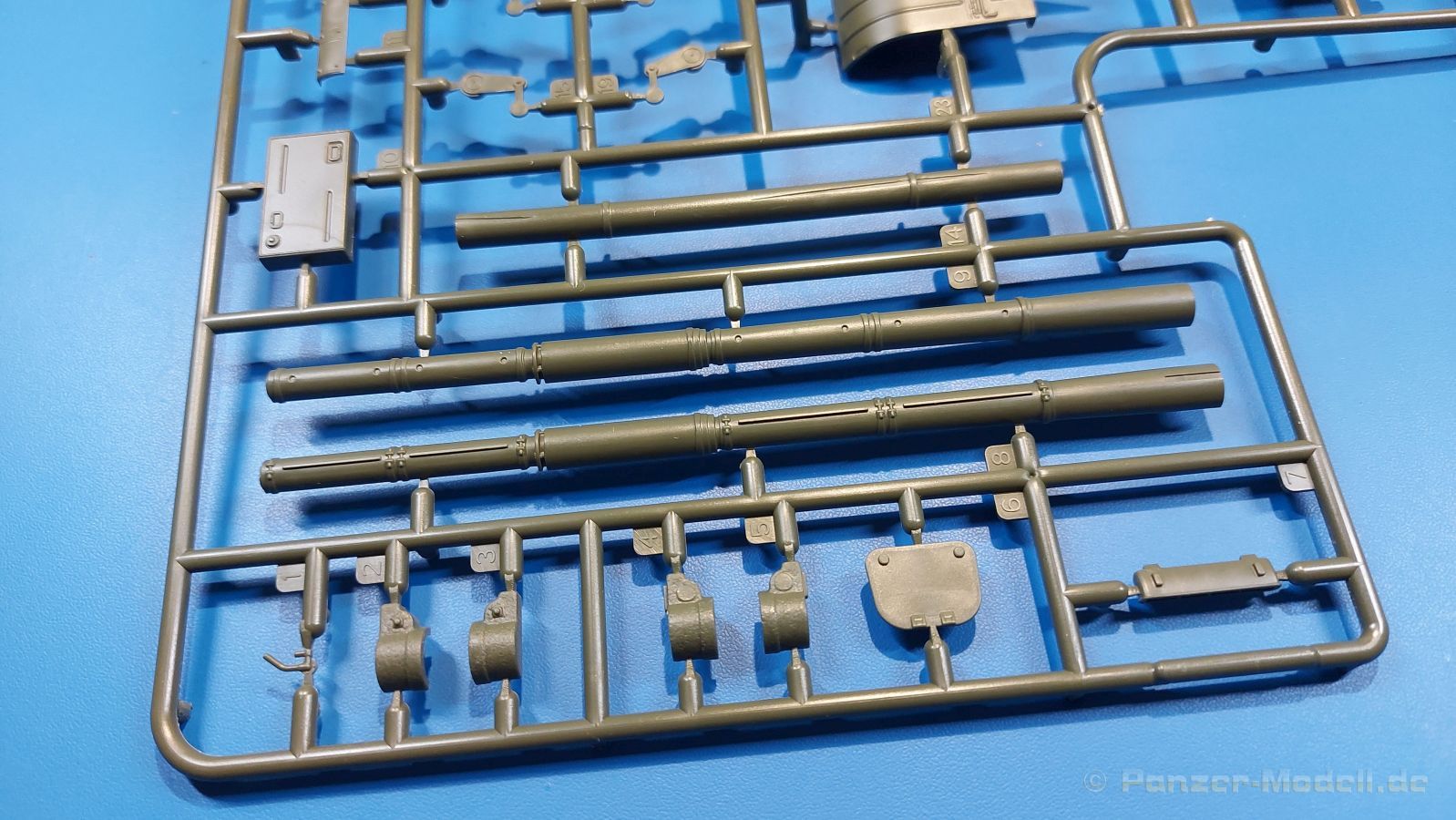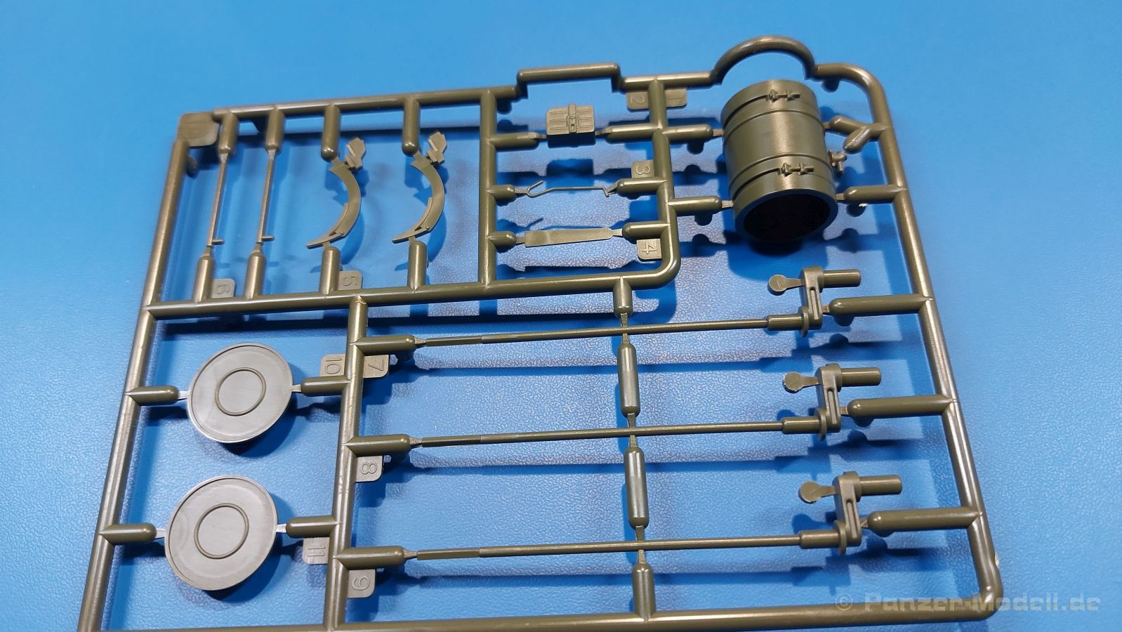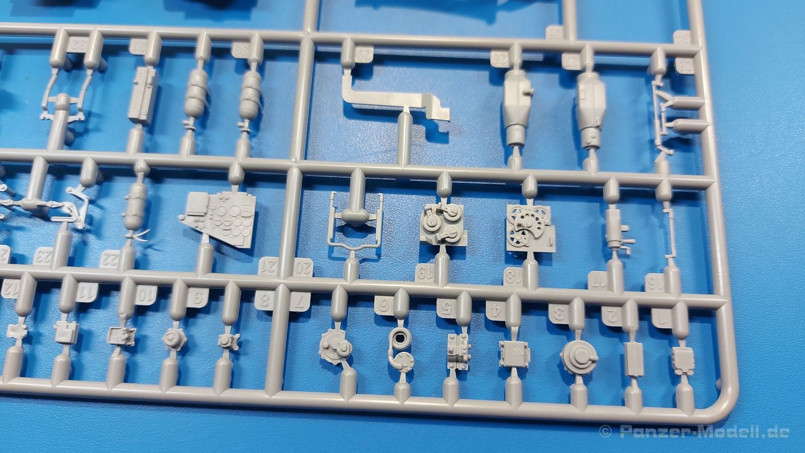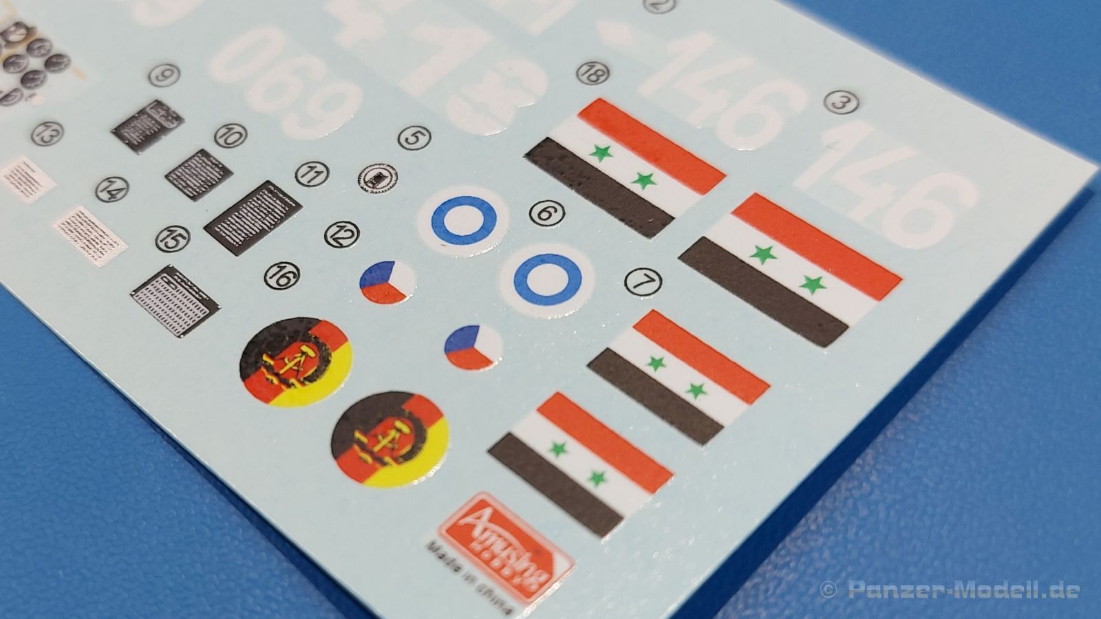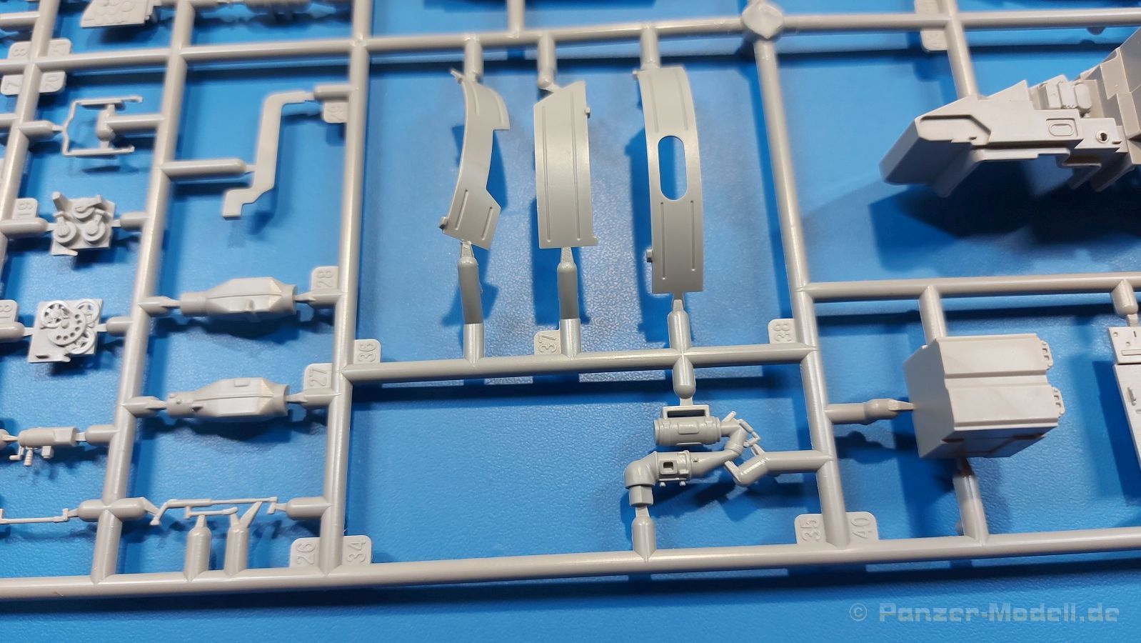 Der Bausatz: Nicht nur im Original gibt es jede Menge T-72. Modellbauer können sich sicherlich nicht über Mangel an entsprechenden Modellen beschweren. Amusing Hobby hat dem ganzen noch einen draufgesetzt und den ersten T-72 mit vollständiger Inneneinrichtung (Fahrer-, Motor- und Kampfraum inkl. Ladekarussel und -mechanismus) auf den Markt gebracht. Auch dieser T-72 AV Bausatz ist voll ausgestattet. Um die ganzen Spritzlinge aufzunehmen, ist der Karton mit 400 x 260 x 120 mm auch etwas größer ausgefallen. Er enthält 54 Spritzlinge (in olivgrün, hellgrau, braun und durchsichtig), die Unterwanne, Turm, 1 Metallfeder, 1 PE-Platine, 1 Kabel, 1 Draht, 1 Abziehbilderbogen und die Bauanleitung. Im Standard der heutigen Zeit ist die Qualität der Teile ausgezeichnet. Scharfe Details, teils kleine und feine Teile, kein Verzug oder Versatz vorhanden. Es gibt zwar Auswerferspuren, aber nur dort, wo sie nach dem Zusammenbau nicht mehr zu sehen sind. Einige hervorstehende Auswerferreste auf manchen Teilen, hier z.B. an den Innenseiten der Kettenschürzen und dem Grabschild, sollten aber entfernt werden, da die Teile sonst nicht korrekt montiert werden können. Das Klarsichtteile für die Scheinwerferscheiben sind schön geriffelt, die Gussstruktur am Turm ist glaubhaft wiedergegeben und wenn man genau hinsieht, sieht man Gussnummern an den Kettengliedern. Die Spritzlinge sind farblich getrennt - Olivgrün für den eigentlichen Panzer, Hellgrau für die Inneneinrichtung und Braun für die Kettenglieder und -bolzen. Schauen wir uns mal die Wanne an. Sie besteht aus einem Teil, das Unterboden und die Seitenteile beinhaltet. Grad der T-72-typische und auffällige Unterboden ist sehr gut dargestellt. Öffnungen für Wartungsdeckel und Notausstiegsluke sind vorhanden. Innen sind zwar mehrere Auswerferspuren zu sehen, aber diese werden wohl komplett von der Inneneinrichtung verdeckt. Die Inneneinrichtung ist ein Modell für sich. Beginnend beim Fahrerraum mit der gesamten Pedalerie, sämtlichen Instrumenten, dem hervorragenden Fahrersitz über die Munitionskästen, Staukästen, Feuerlöscher bis zum unglaublich gut dargestellten Karussell des Autoladers, in dem verschiedene Munitionssorten optional eingesetzt werden können, ist alles vorhanden. Auch im Heck ist der Dieselmotor mit Turboaufladung, sowie der Kühler (der Lüfterpropeller ist ein echter Hingucker!), die Treibstofftanks und das Getriebe vorhanden. Es sind ebenfalls Luftfilter, die Lichtmaschine, wichtige Leitungen und Verstrebungen dargestellt. Auch der Turm ist vollständig eingerichtet. Der Bau des Turmes beginnt mit dem Bau der 125mm Kanone 2A46(D-81). Hier werden zunächst der Verschluss und der Rest der Waffenanlage zusammengesetzt, dann folgen der Richtschützen- und der Kommandantensitz und diverse Anbauteile. Viele Teile der Ladeautomatik wollen auch zusammengesetzt werden. Der Turm besteht aus einer Innen-, einer Außenschale und einem Turmdrehkranz. Zusätzlich wird noch ein Teil des Turmdaches separat eingesetzt. So erreicht man einen ungeheuren Realismus in der Materialdicke. Zudem sind zum Beispiel alle Schutzpolsterungen und Nietungen genauestens dargestellt. Natürlich können alle Luken offen dargestellt werden, und die Maschinengewehre (Koaxial und Flugabwehr) sind mit offenen Rohrmündungen wiedergegeben. Die Optiken des Richtschützen und des Kommandanten, sowie die Funkanlage kann sich wirklich sehen lassen. Beim Fahrwerk werden die Drehstäbe (mit den angegossenen Schwingarmen) in die hervorragend wiedergegeben Unterwanne geklebt, und bleiben beweglich. Dadurch kann das Modell auch an unebene Untergründe angepasst werden, und macht in jedem Diorama eine gute Figur. Auch die Trieb-, Leiträder, Lauf- und Stützrollen sind sehr schön wiedergegeben und setzen sich erfreulicherweise aus nur wenigen Teilen zusammen, ohne hier an der Detaillierung zu sparen. Die Ketten sind als Einzelgliedketten ausgelegt. Schaut man sich die Glieder näher an, entdeckt man in den Riffeln der Außenseite feinste Gussnummern. Jede Seite benötigt fünfundneunzig Kettenglieder. Diese befinden sich an achtundzwanzig Spritzlingen zu je 8 Gliedern, die einzeln abgetrennt und versäubert werden wollen. Die Kette soll voll beweglich bleiben. Dies wird mithilfe der Bolzenlöcher in den Gliedern und separaten Bolzen erreicht. Die Kettenbolzen befinden sich an sieben eigenen Gussästen. Diese können zu Gruppen aus je zwei Bolzen bzw. vier Bolzen ausgeschnitten werden und mit Hilfe einer Montagehilfe, in welche die einzelnen Kettenglieder eingelegt werden, in die Bohrungen der einzelnen Glieder eingesetzt werden. Der Kettenbau wird sicherlich einen gewissen Teil der Arbeit an diesem Bausatz ausmachen. Die Heckplatte hat bereits einen großen Wartungsdeckel mit fünf Schraubenköpfen angegossen. Zwei Ersatzkettenglieder plus deren Halterungen und zwei Bergehaken bringt man beidseitig des Wartungsdeckels an. Der typische Bergebalken fehlt natürlich auch nicht. Er zeigt Trocknungsrisse des Holzes, aber kaum eine Maserung. An den oberen Rand kommen die Halterungen für die Kraftstofffässer. Die typischen Heckfässer sind im Slide-Mould-Verfahren hergestellt, haben bereits die Haltebänder und Leitungsanschlüsse bereits angegossen und werden nur mit den Seitenteilen komplettiert. Die typischen Treibstoffleitungen, welche zum Motor führen, werden mit Hilfe einer Spiralfeder mit eingelegtem Draht simuliert. Die Bugplatte besteht aus drei Platten - Innenplatte mit Elementen der Inneneinrichtung, der eigentlich Panzerplatte und einer Zusatzpanzerplatte. Auf diese Zusatzpanzerplatte werden die Kacheln der Reaktivpanzerung, bestehend aus Einzel- und Gruppenelementen, aufgesetzt. Die Fahrscheinwerfer sind ausgehöhlt und bekommen geriffelte Klarsichtgläser. Die Scheinwerferhalterung sind etwas „komisch“ aufgeteilt. Man klebt die geteilten Gestänge stumpf aufeinander. Die Kettenbleche sind bereits an der Unterwanne angegossen. Es kommen einige Verst