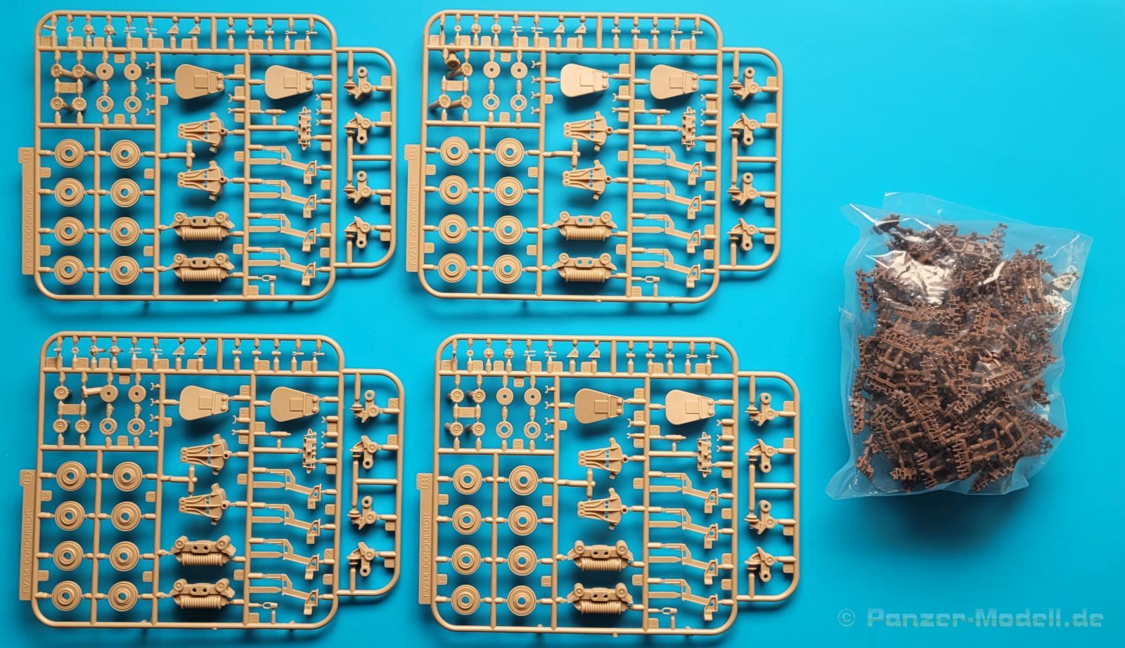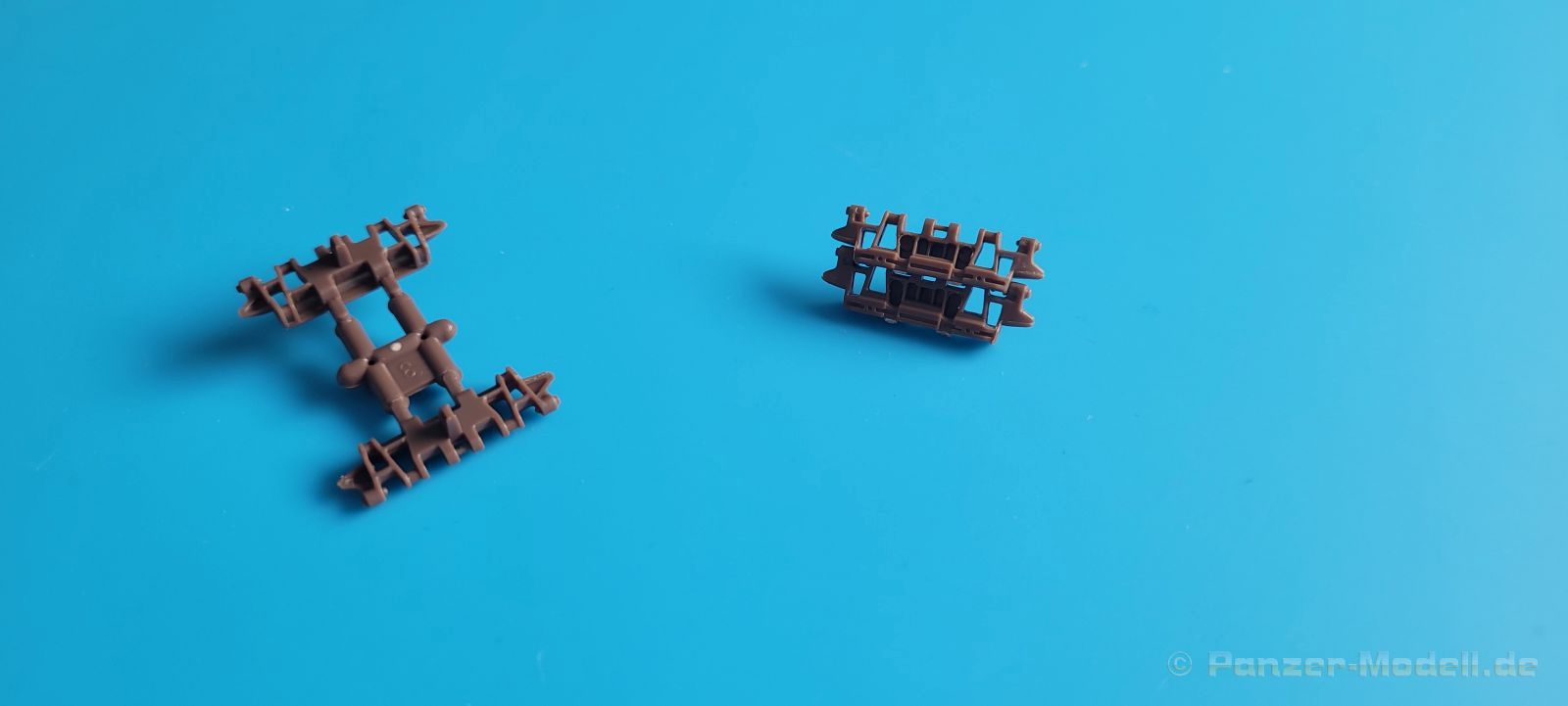 Erfreulicherweise befinden sich die Ketten separat verpackt in einem Beutel – bereits abgetrennt und versäubert und zum Bau bereit. Diese lassen sich dann einfach ohne zu kleben ineinander klicken - vorbildlich. Insgesamt machen die Ketten einen hervorragenden Eindruck und geben die Kette hervorragend wieder. Es werden pro Seite je 98 Kettenglieder zusammengefügt.