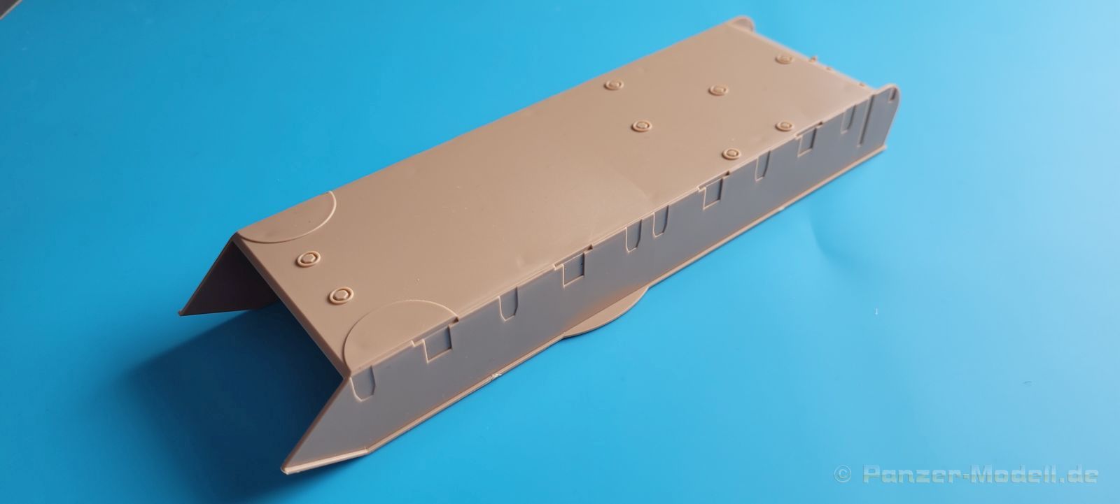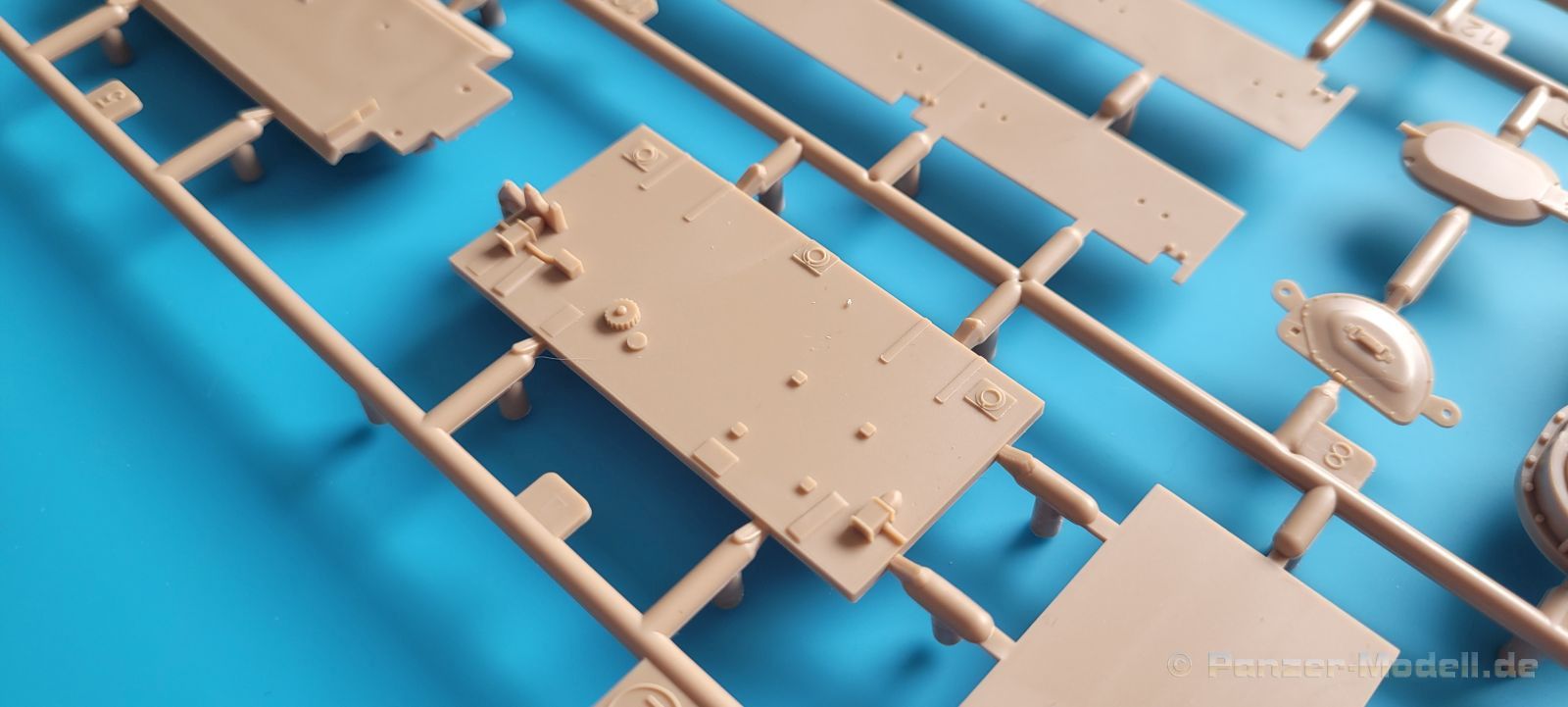 An der Wanne sind Klebepunkte für die Rollenwagen und die Kettenblechstützen vorhanden, ansonsten findet man mehrere gravierte Wartungsklappen an der Unterseite.