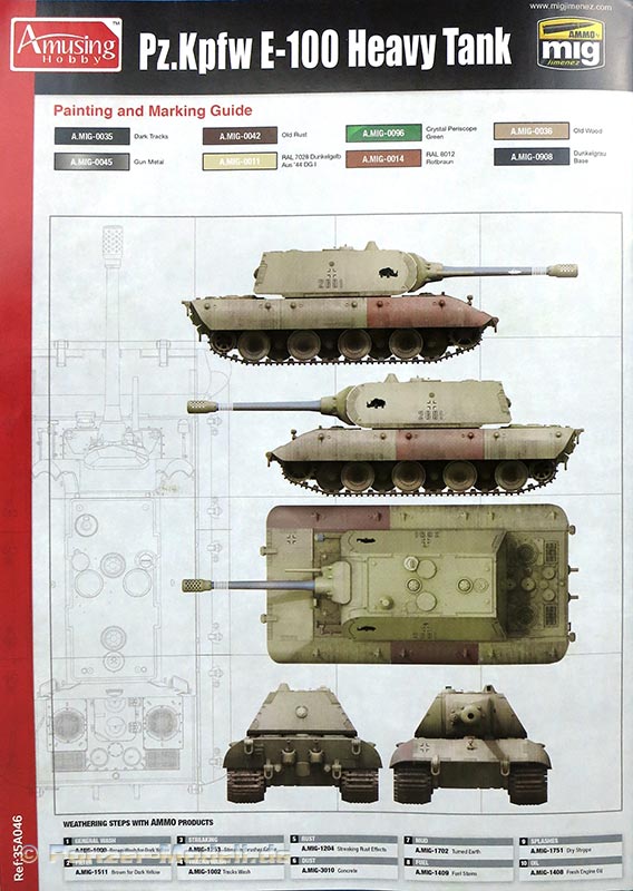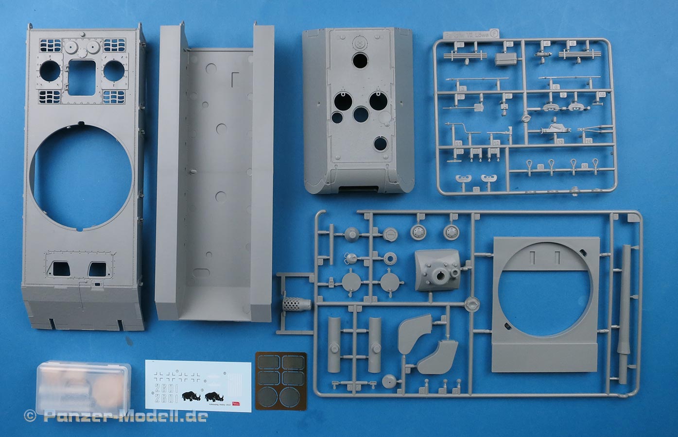Im Karton finden wir 5 graue, 4 rotbraune Spritzlinge, die Ober- und Unterwanne, das Turmoberteil, eine Platine PE Teile und ein Decalbogen. In der Erstauflage ist hier zusätzlich noch eine Box mit 3D Druckteilen und einem Messingrohr enthalten