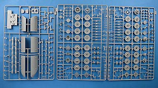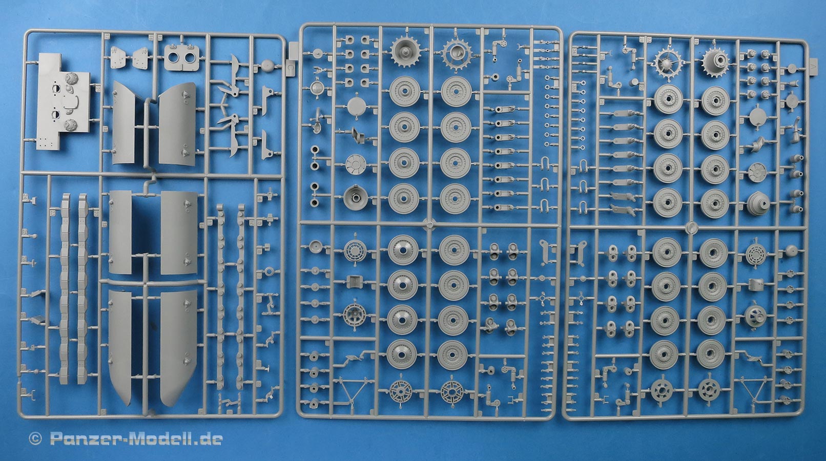 Die Unterwanne ist einteilig und macht einen guten Eindruck. Das Laufwerk baut sich aus angenehm wenigen Teilen zusammen - selbst die Federpakete sind jetzt allesamt in EINEM Teil auf einer Basis gespritzt. das erleichtert den Bau ungemein!