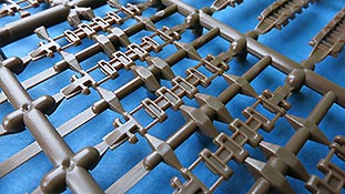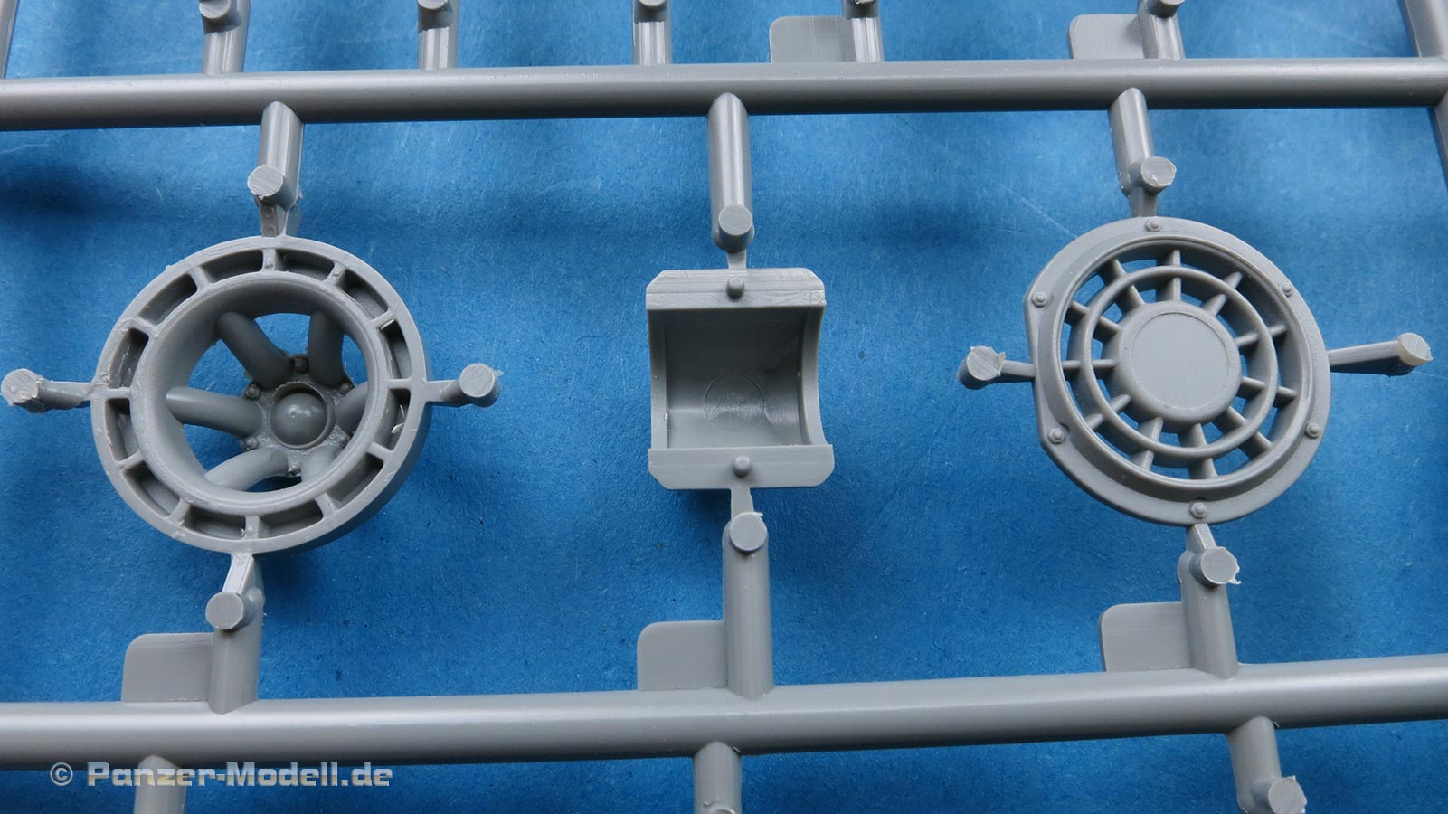 Die Bauteile des Bausatzes sehen ausgezeichnet aus und sind recht übersichtlich, was schnellen Bastelspaß verspricht. Der Guss der Teile ist einwandfrei ohne Auswerferstellen, Fischhäute oder verzogene Bauteile. Der Detailgrad ist sehr gut und zeigt saubere und feine Details.