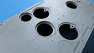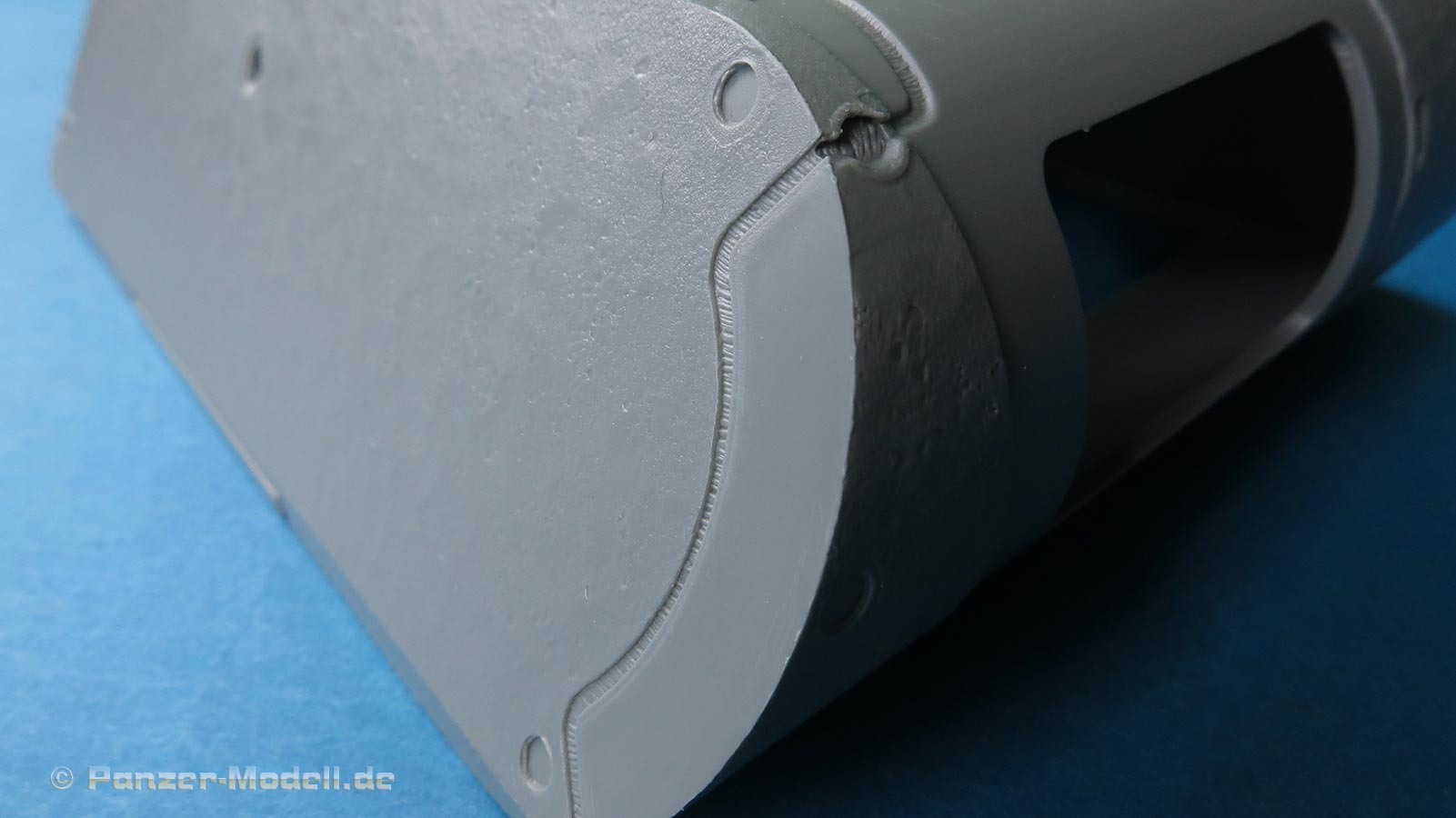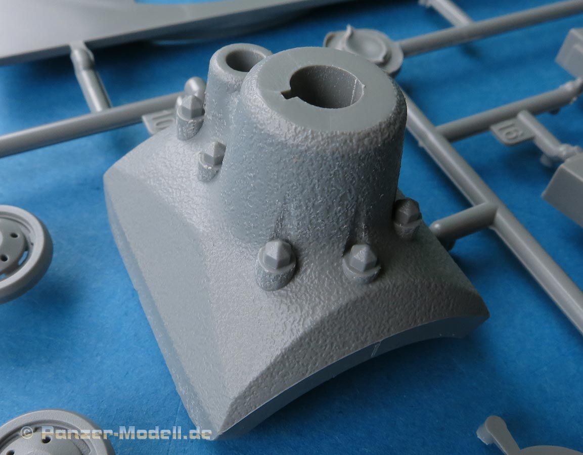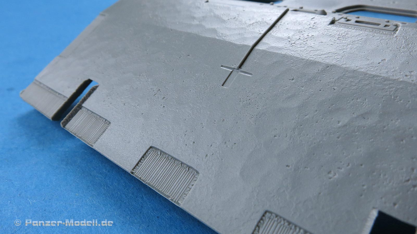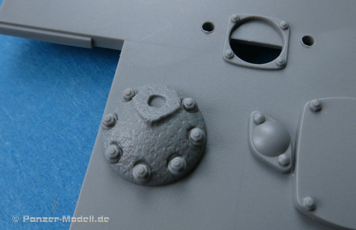 Die Oberwanne ist ebenfalls einteilig, wird aber mit diversen Anbauteilen vervollständigt. Auch hier alles sehr schön und sauber wiedergegeben - die Schweißnähte und die Schnittkanten der verzahnten Panzerplatten sind granatenstark.
