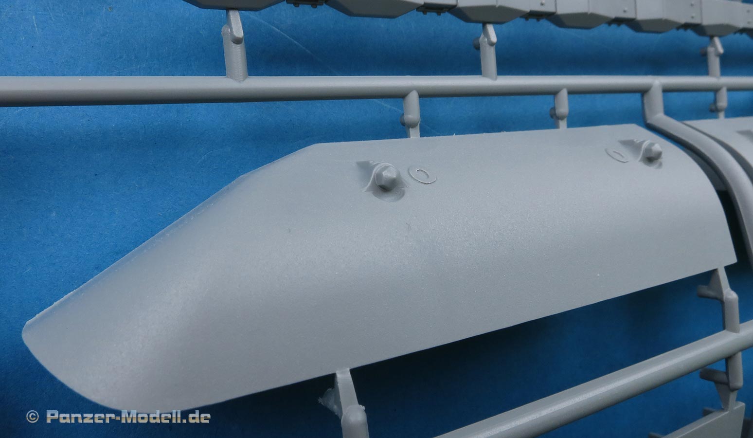 Die mächtigen Seitenschürzen liegen sauber und schön geformt in je 3 Segmenten pro Seite bei. Die Wannenseiten sind mit passenden Details versehen, sodass man das Modell sowohl mit als auch ohne Seitenschürzen darstellen kann.
