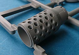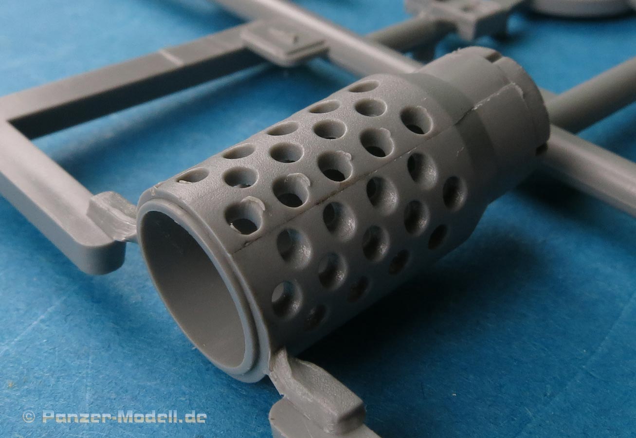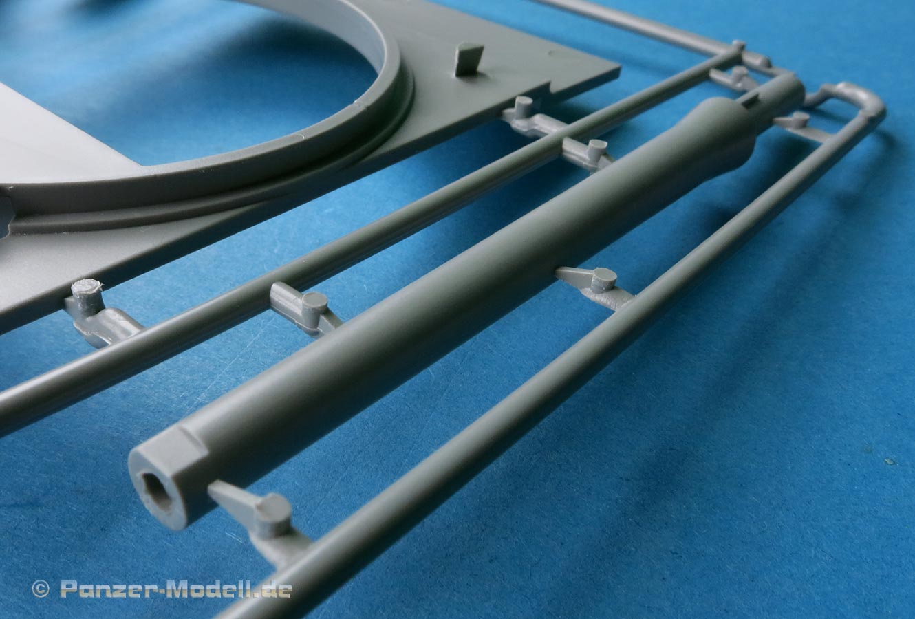 Das mächtige Kanonenrohr ist aus Plastik, aber erfreulicherweise in einem Stück gegossen. Es wird vorn nur noch mit einer Mündungsbremse abgeschlossen, die al Pfefferstreuermündungsbremse auch in sich auch einteilig ist und nur vorn von der Frontplatte abgedeckt wird. Es ist zwar noch eine Gussnaht sichtbar, aber die sollte man leicht versäubern können.