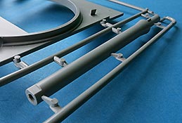 Es handelt sich hierbei einmal um eine deutsche Kommandantenkuppel, die rechts über der normalen Luke angebaut wird und um zwei Teile einer Optik und dazugehörigen FLa-Waffenistallation, vorn links im Turm wie sie zeichnerisch damals tatsächlich angedacht war. Für diese Fla-Waffe liegt auch ein Messingrohr bei.