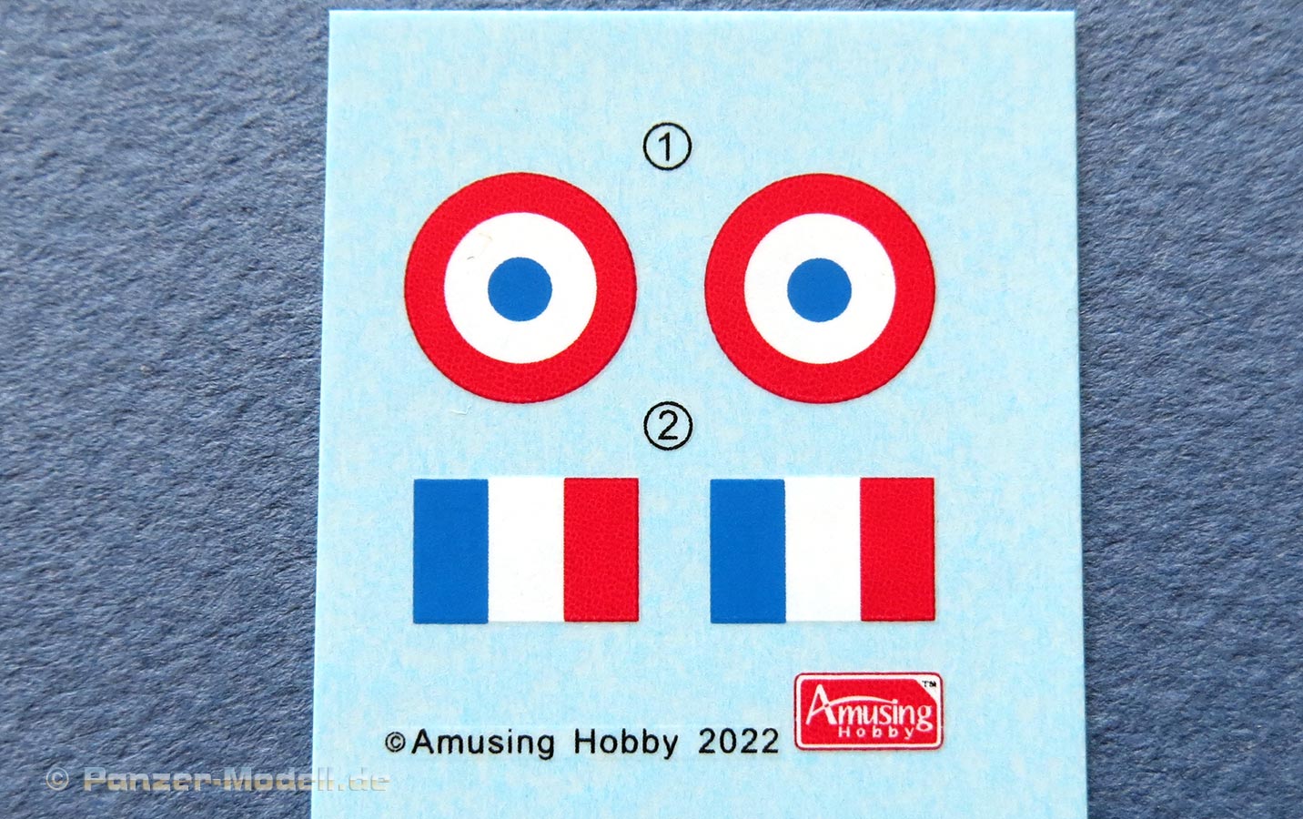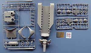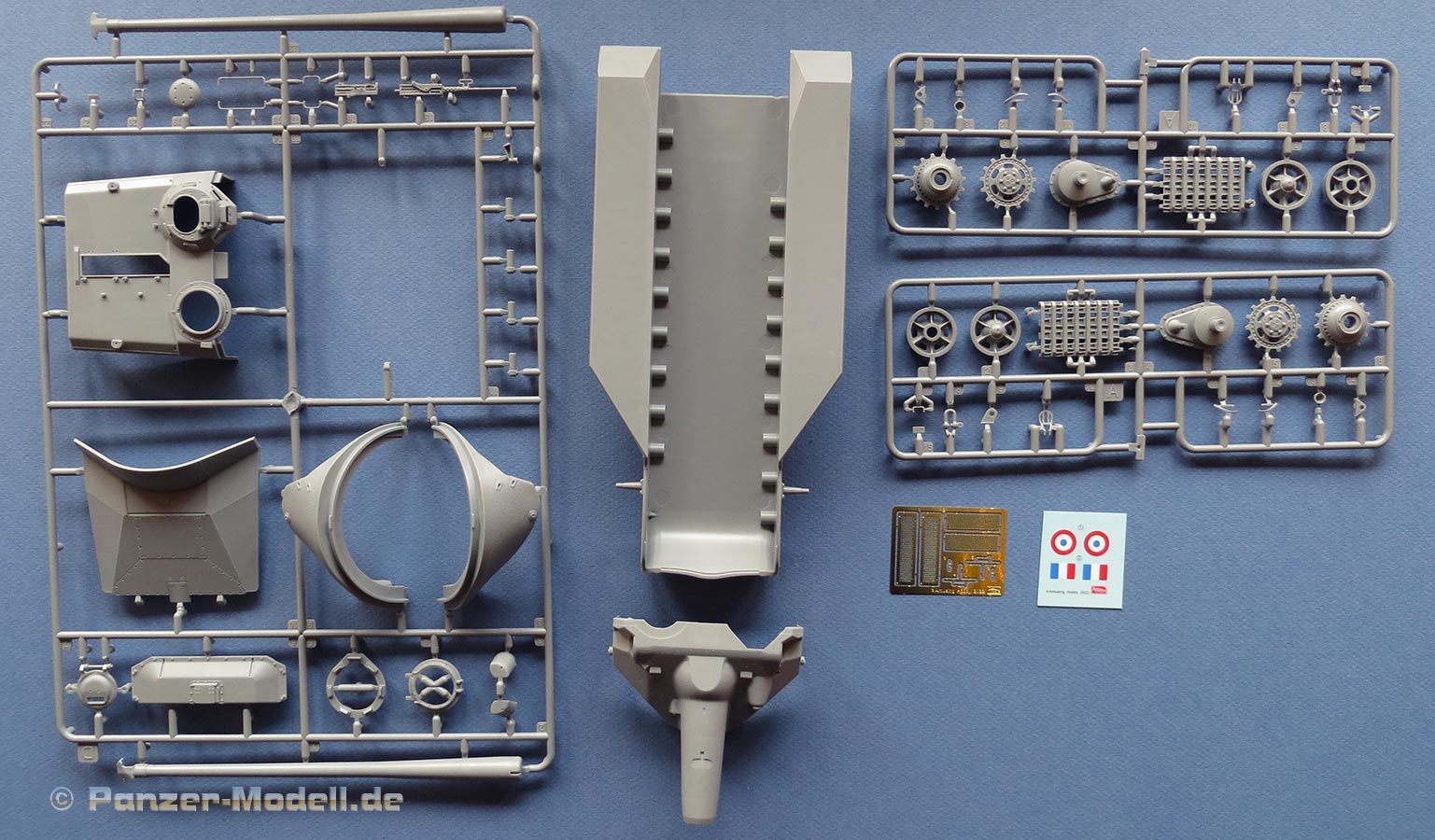 Wir finden hier 8 graue Spritzlinge, die Unterwanne, die Kanonenblende, eine PE Platine und ein Decalbogen.