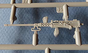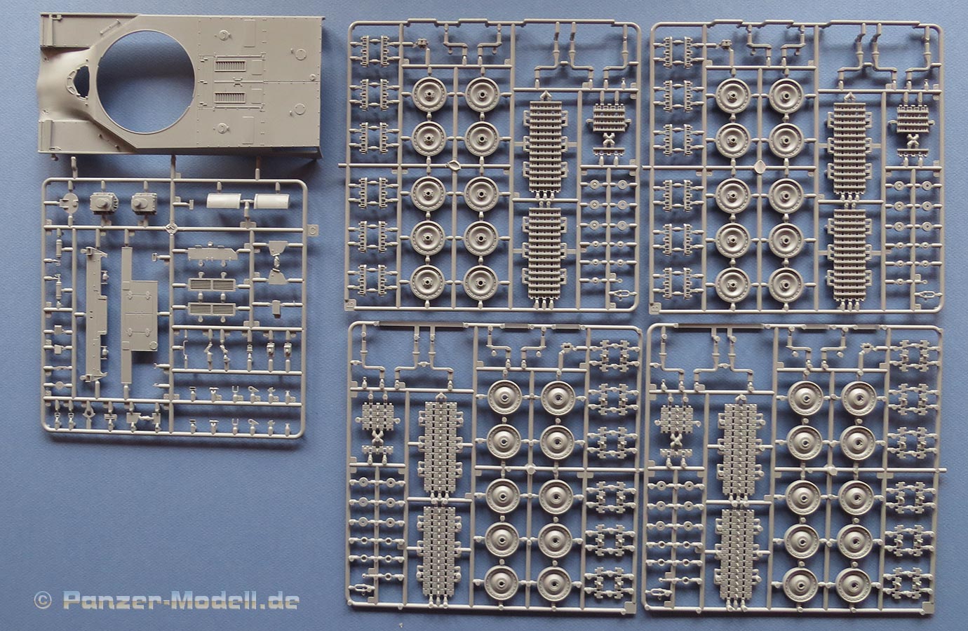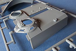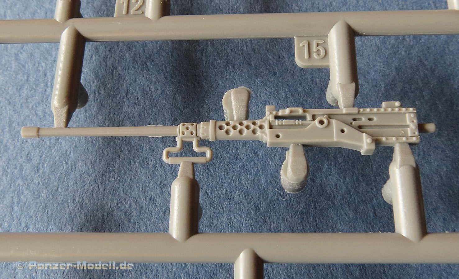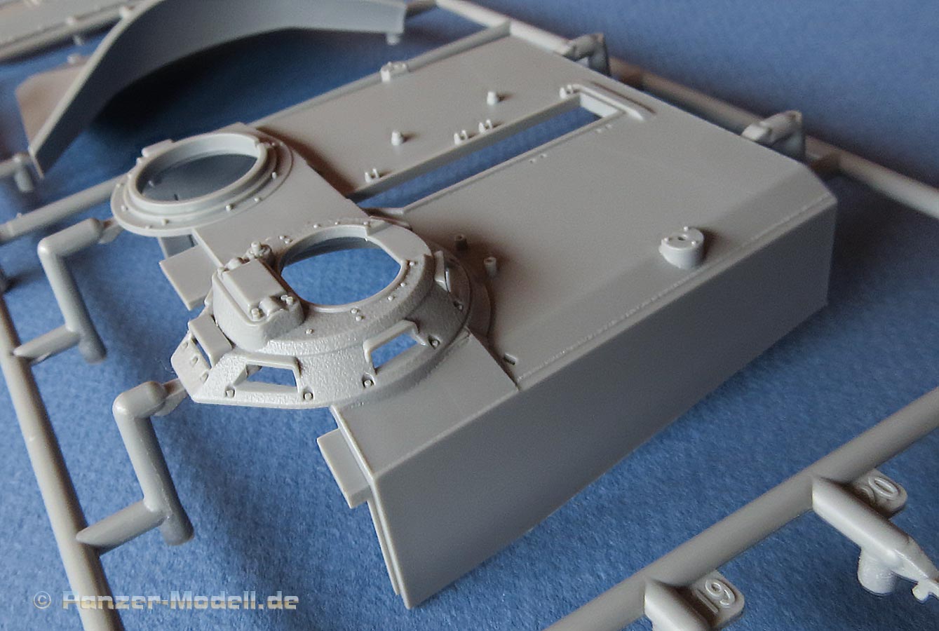 Der Turm setzt sich im Groben aus der Frontpartie/Kanonenblende und Ober- und Unterteil des Hecks zusammen. Auch hier erfreuen uns schöne Details an Schweißnähten, Scharnieren, Schraubenköpfen. Besonders erstaunlich ist die bereits in einem Teil angespritzte Kommandantenkuppel. Die beiden Luken lassen sich offen oder geschlossen bauen. An der rechten Luke kann noch ein 0.5cal MG angebaut werden, das in Spritzguss beiliegend einen sehr guten und feinen Eindruck macht.