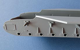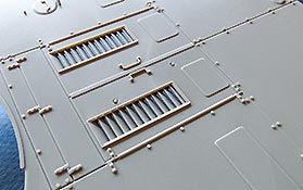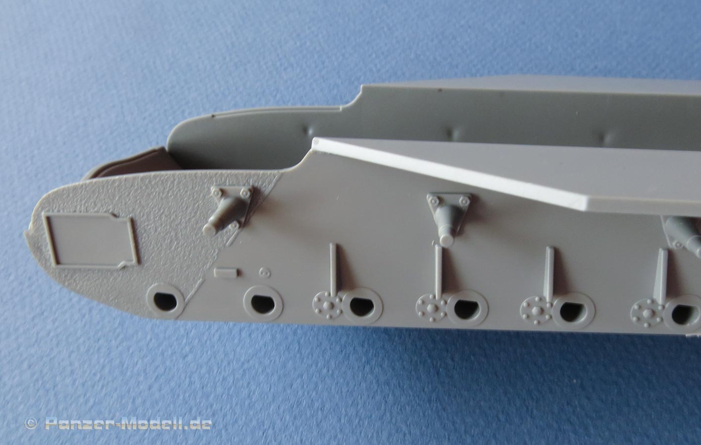Die Oberwanne ist einteilig gespritzt und weist im Bugbereich eine raue Gussstruktur auf. Am Motordeck werden einige Details und Lüftergitter (u.a. aus PE Gittern) ergänzt.