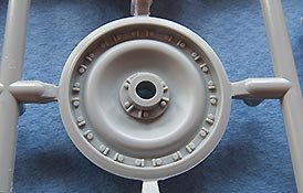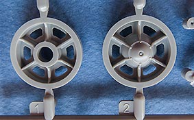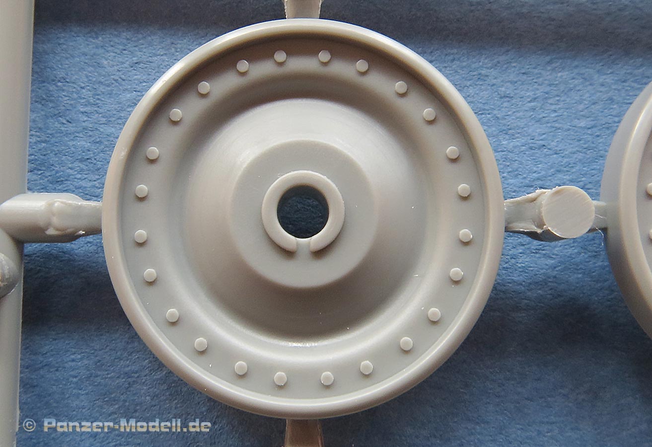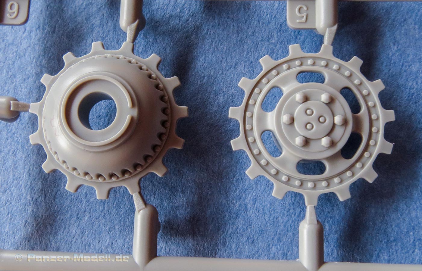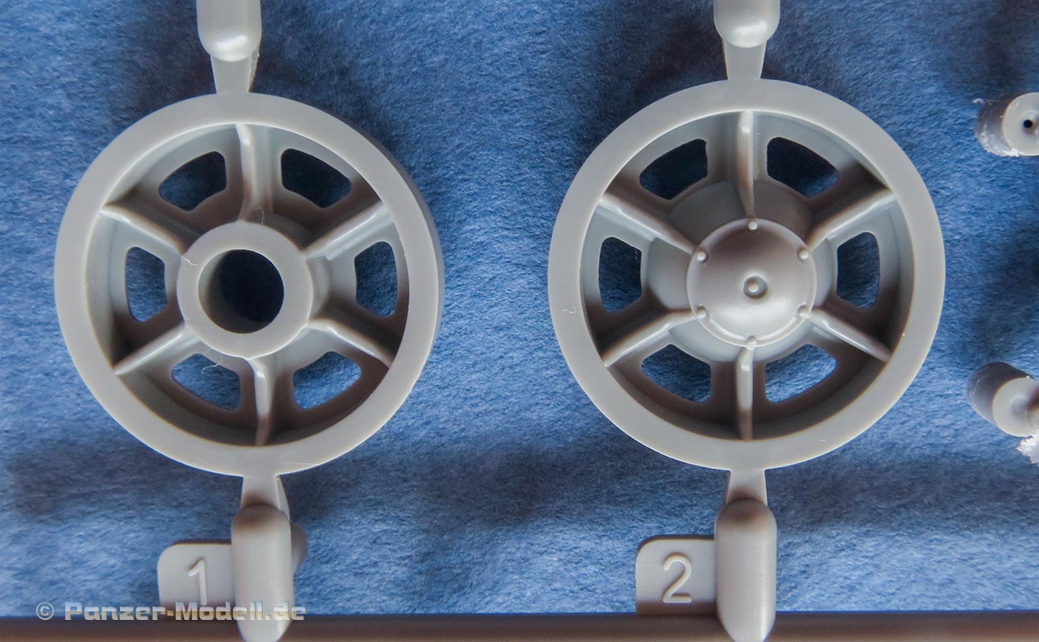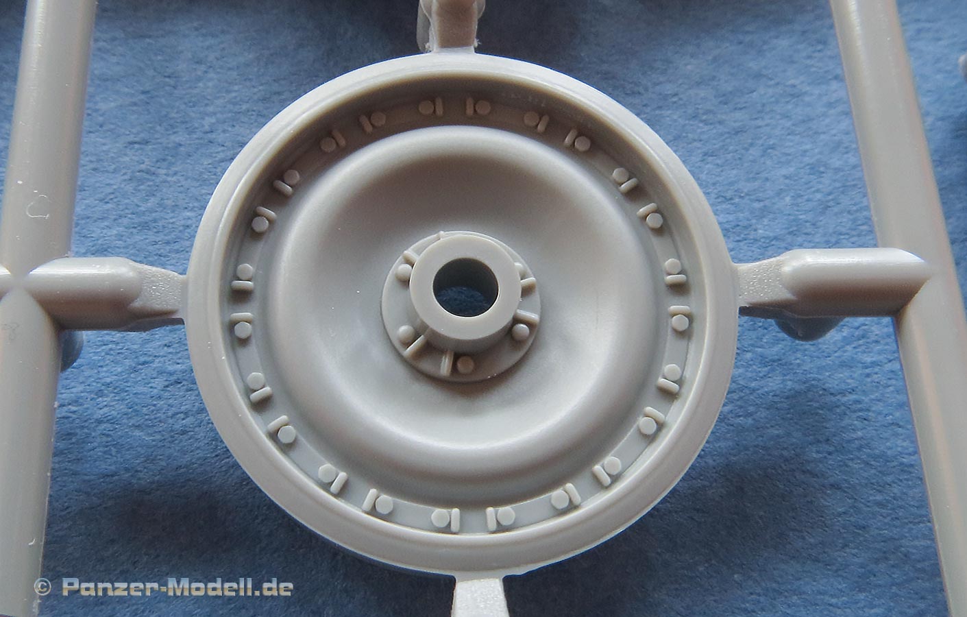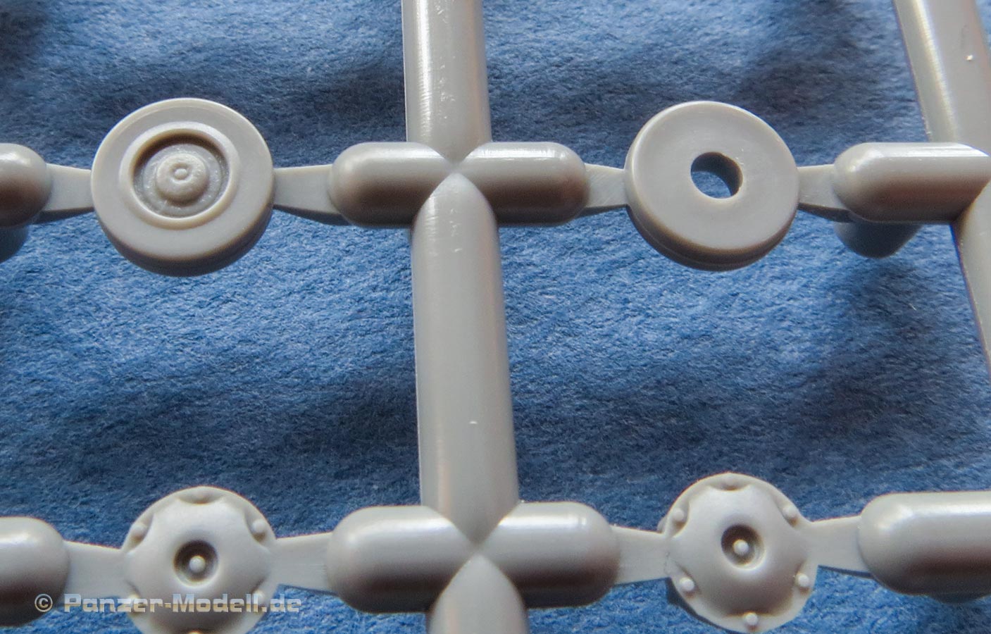 Die Laufrollen sehen sehr gut und sauber gespritzt aus, gerade mit den ganzen Muttern und feinen Details mit der Felgenwölbung und dem abgesetzten Rand. Pro Station wird eine Doppellaufrolle zusammengebaut, die dann abwechselnd überlappend angebaut werden.