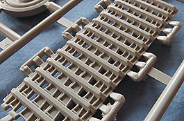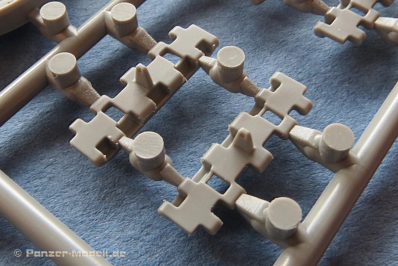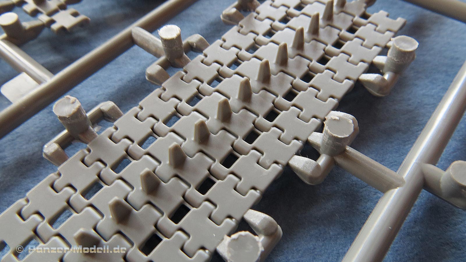 Die Details der Kette sind schön gemacht und vor allem die Glieder sauber gespritzt mit klaren Abgrenzugen auf der Laufflächenseite der Glieder im Strang und ohne Auswerfermarken. Die Führungszähne sind bereits mit angespritzt.