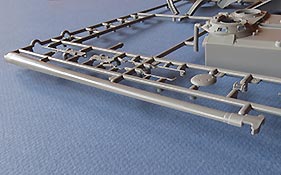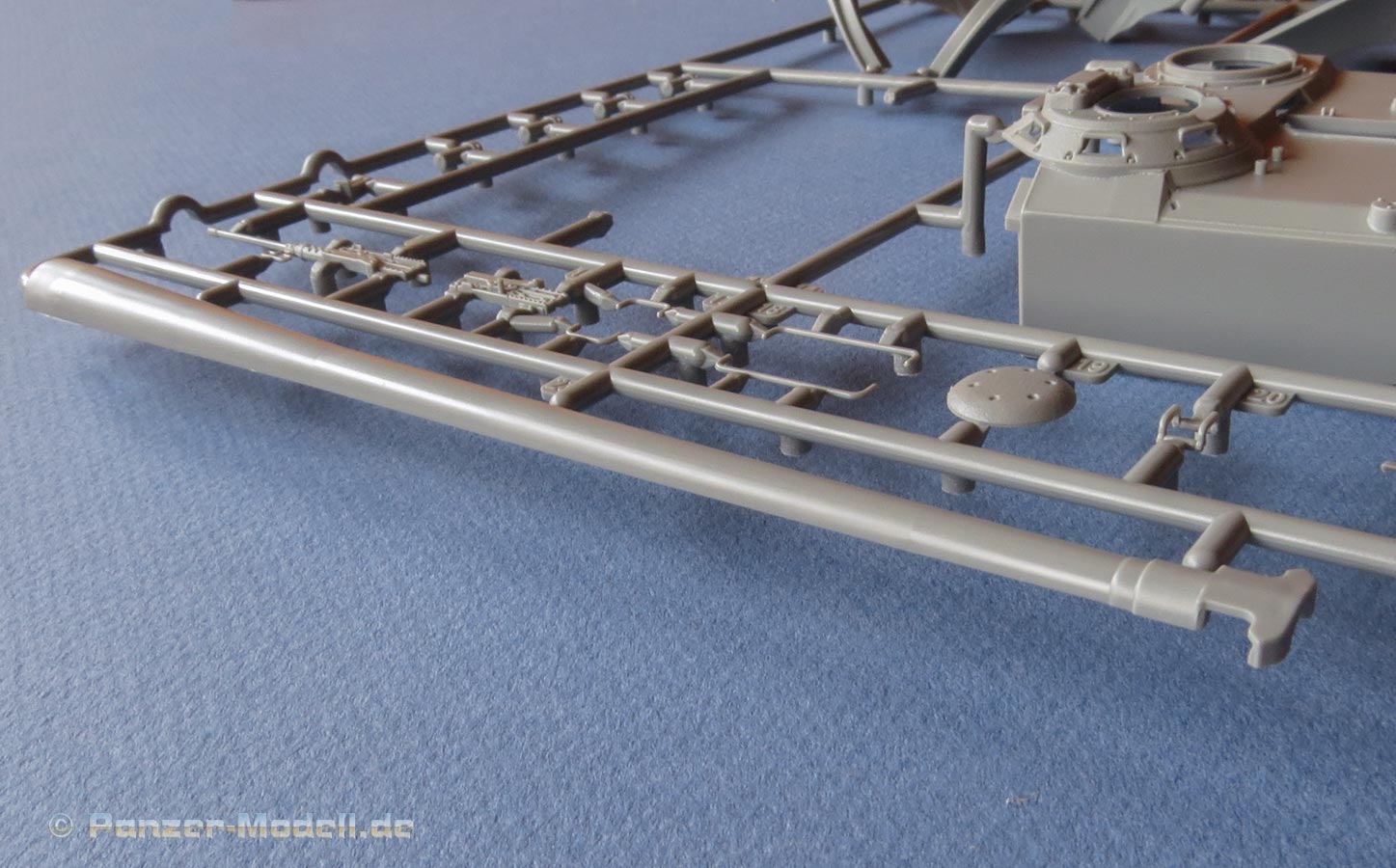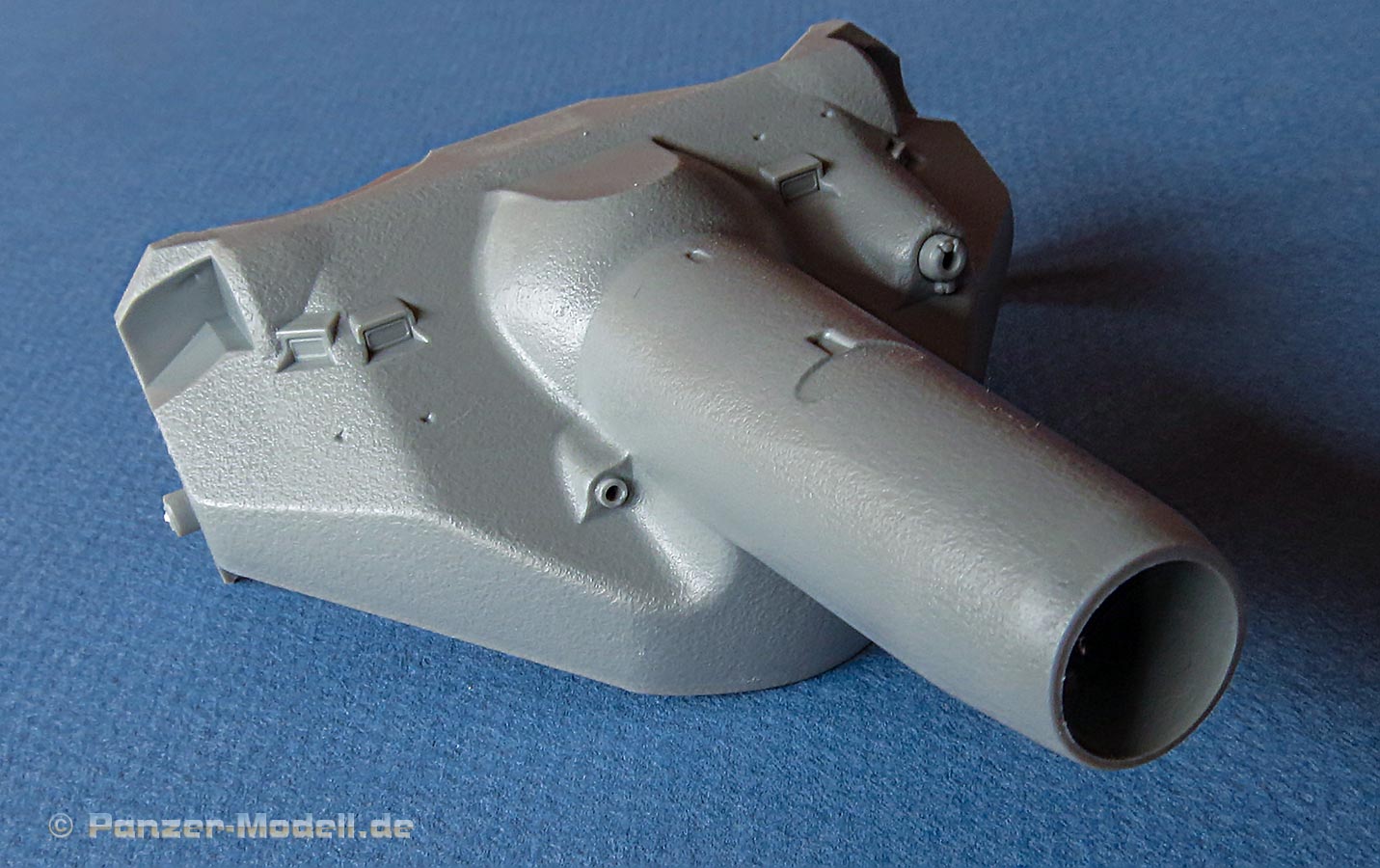 Ein kleiner Wermutstropfen ist die recht lange und große Kanone, die leider in zwei Längs-Halbteile aufgeteilt ist, inklusive der Mündungsbremse. So gibt es einiges zu versäubern um die Naht unsichtbar zu machen. Ein einteiliges Rohr wäre sicher schöner gewesen.