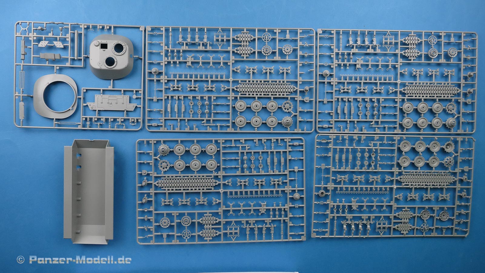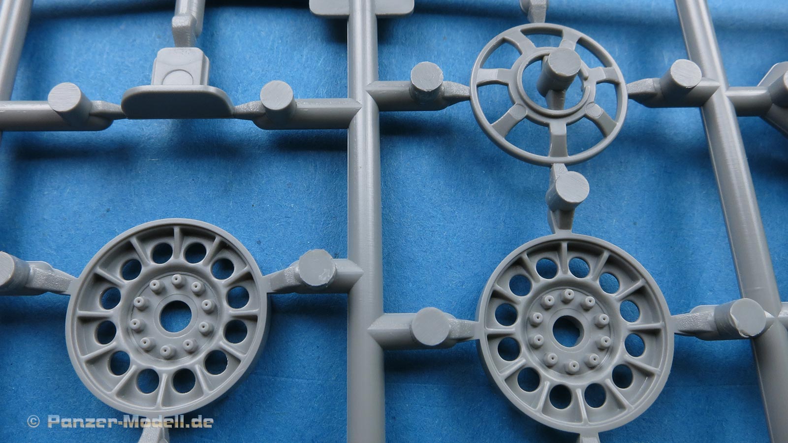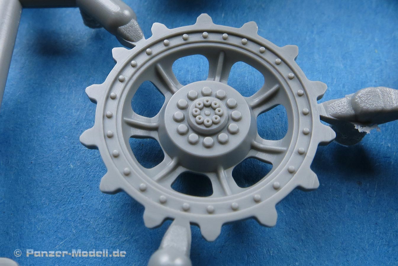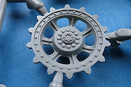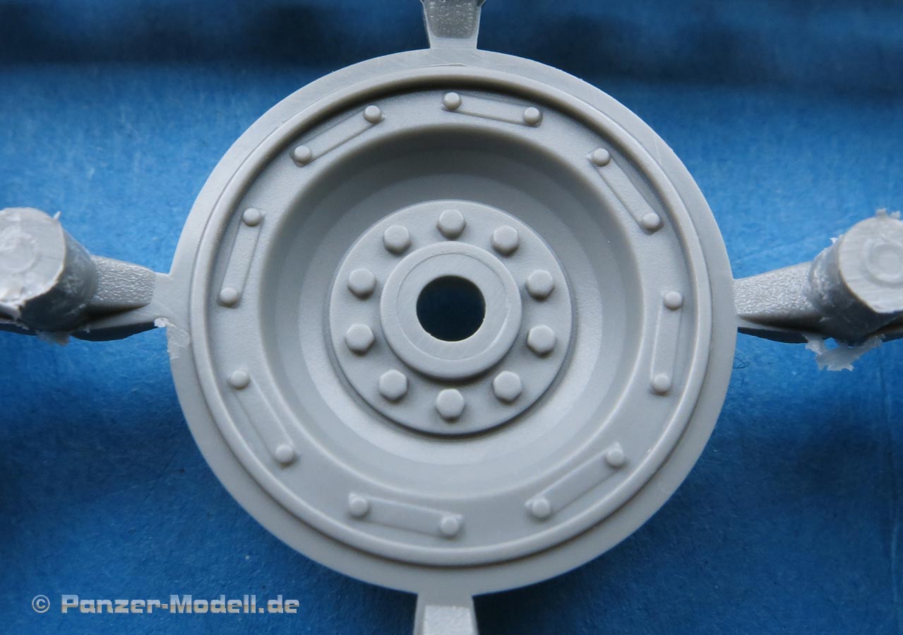 Auch die Trieb- und Leiträder, sowie Lauf- und Stützrollen sind sehr schön wiedergegeben und setzen sich erfreulicherweise aus nur wenigen Teilen zusammen. Gerade die Laufrollen erfreuen uns mit feinen Details auf jeweils beiden Seiten.