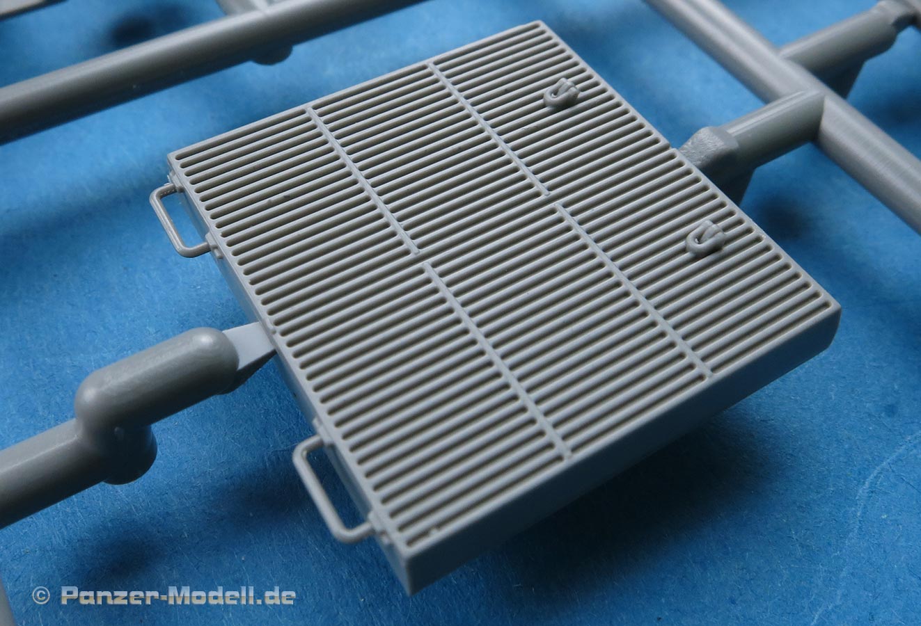 Die Detaillierung am gesamten Bausatz bewegt sich auf sehr hohem Niveau. Einige der Details werden auch durch die beiliegenden, nicht optionalen Fotoätzteile, dargestellt - zum Beispiel die Kettchen für die Nebelbecher oder der Halter für die Ersatzkettenglieder.