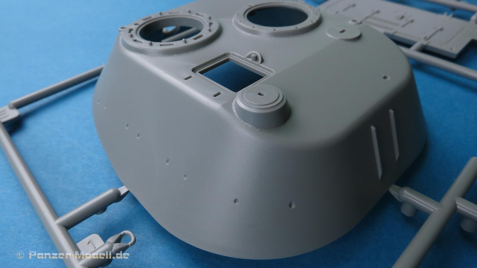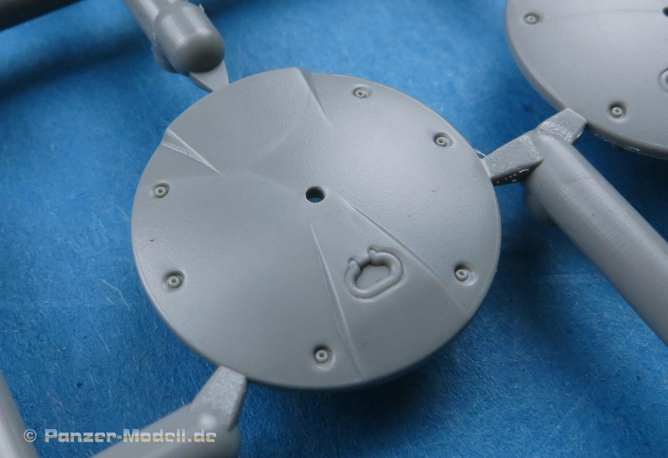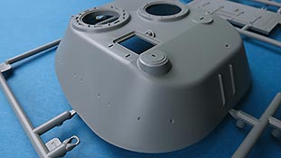 Der Turm setzt sich im Groben aus Ober und Unterteil zusammen und macht den Bau dadurch relativ einfach. Die Details am Turm sind ebenfalls recht gefällig - auch hier finden sich sehr schöne und fein detaillierte Schweißnähnte. An den Seiten werden Handgriffe und auf dem Turmdach eine eckige Luke und zwei runde Luken mit Fla-MG Ring. Die Luken sind alle offen oder geschlossen baubar.