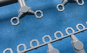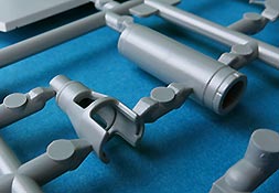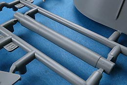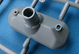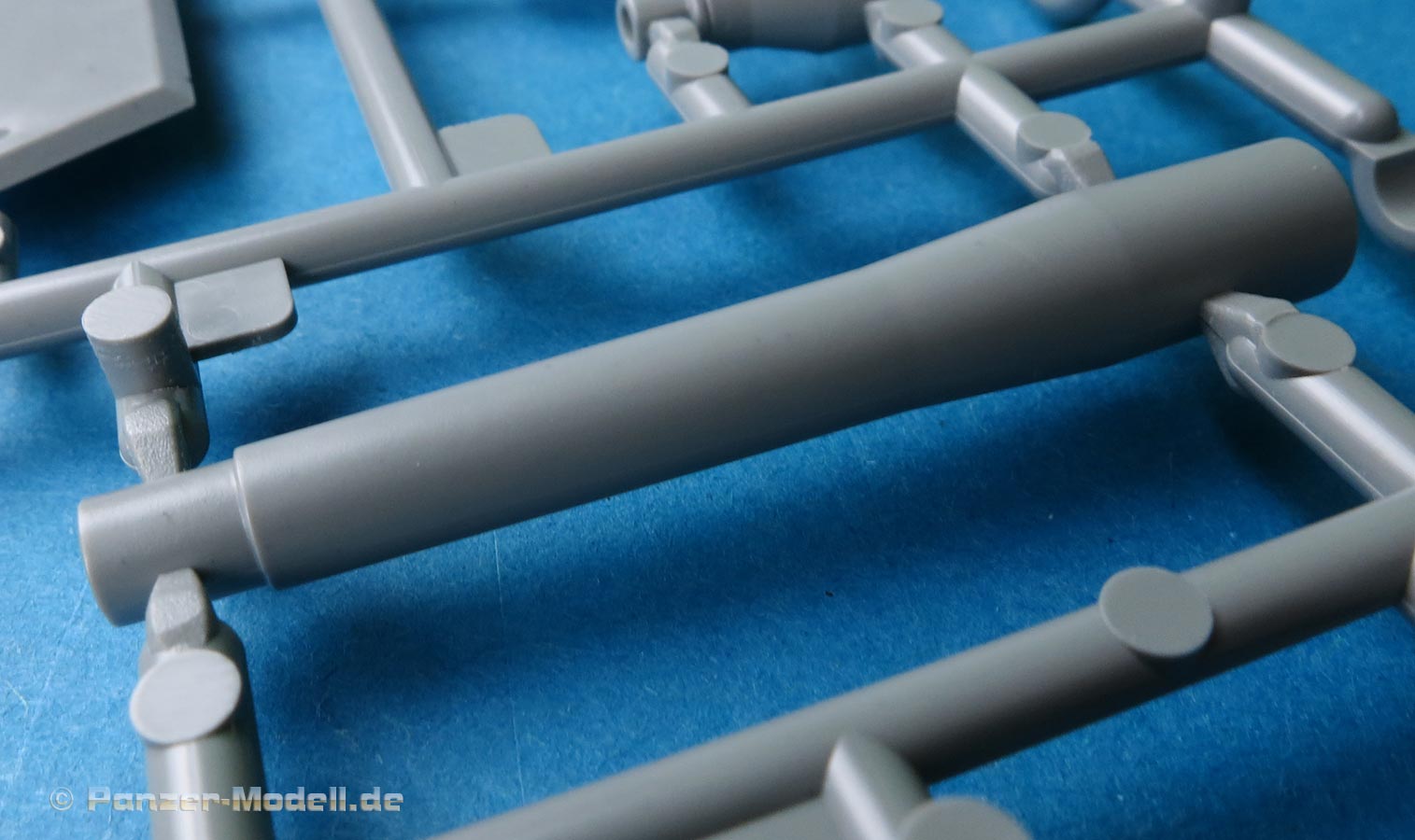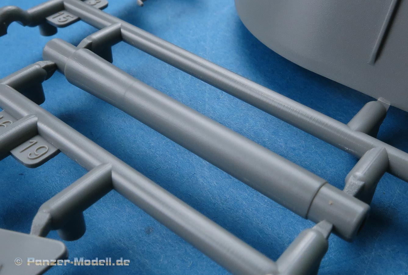Das Kanonenrohr ist mehrteilig mit Schiebeformen gespritzt und somit jeweils einteilig rund, mit auszusteckendem Rauchabsauger und einer separaten Mündungsbremse, die in sich aus mehreren Teile zusammenzubauen ist, aber eben zum Glück nicht aus Halbschalen.