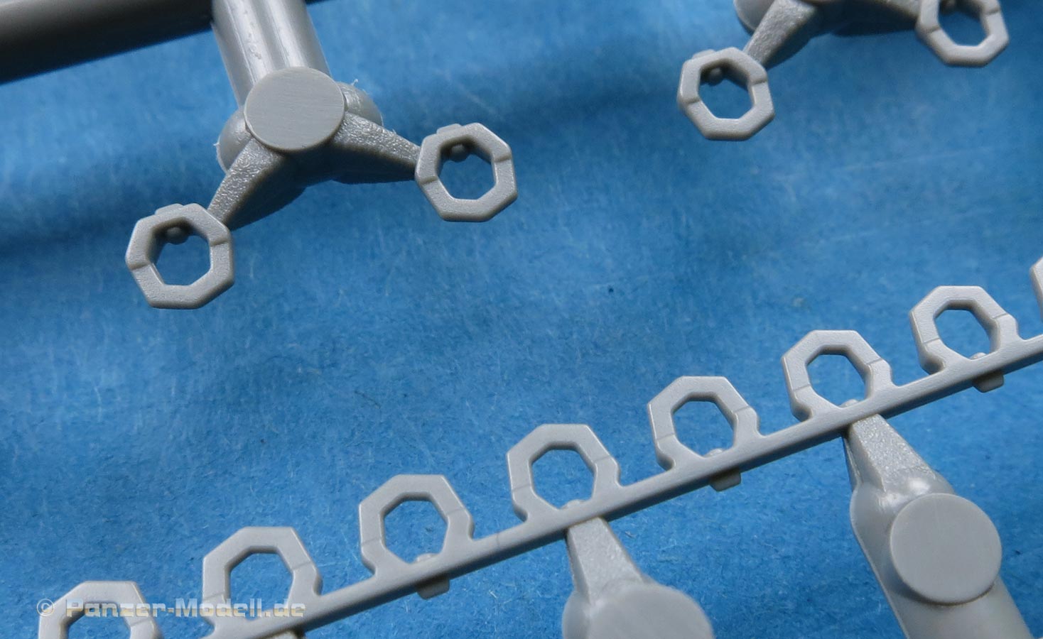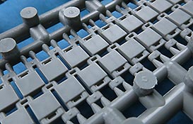 Die Schwingarme werden in die Unterwanne eingeklebt und arretiert, sie bleiben also nicht beweglich. Das ist aber auch nicht schlimm, denn die Ketten sind als Seglemtketten beigelegt und lassen damit auch kein artikuliertes Laufwerk zu. Neben den Strängen liegen auch Einzelglieder bei, die für die Umläufe um Leit und Treibrad gedacht sind. Diese Art der Ketten sind ein guter Kompromiss zu aufwändig zu bauenden Einzelgliederketten oder den bei vielen unbeliebten und oft weniger detaillierten Vinylketten. Die Qualität lässt aber keinen Raum zum Meckern - schöne Details der Endverbinder, saubere Laufflächen innen und außen ohne Sinkstellen oder Auswerfermarken! Die Führungszähne sind offen und von der korrekten Form und müssen noch einzeln an die Kettenglieder angeklebt werden, bzw. bei den Segmentsträngen auch nur als Einzelstück in einem langen Strang.