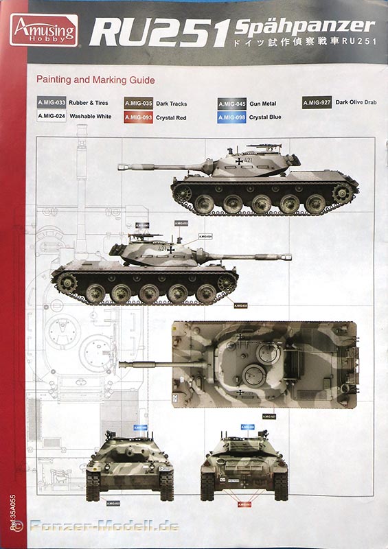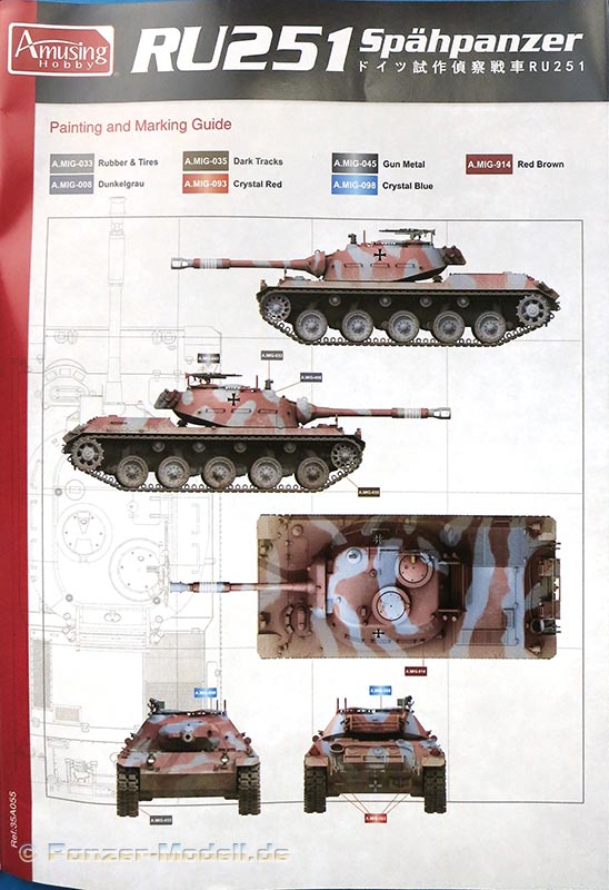 Für die Bemalung und Markierung sind am Ende der Bauanleitung zwei Bemalungsoptionen in Farbe als 5-Seitenansichten gedruckt.