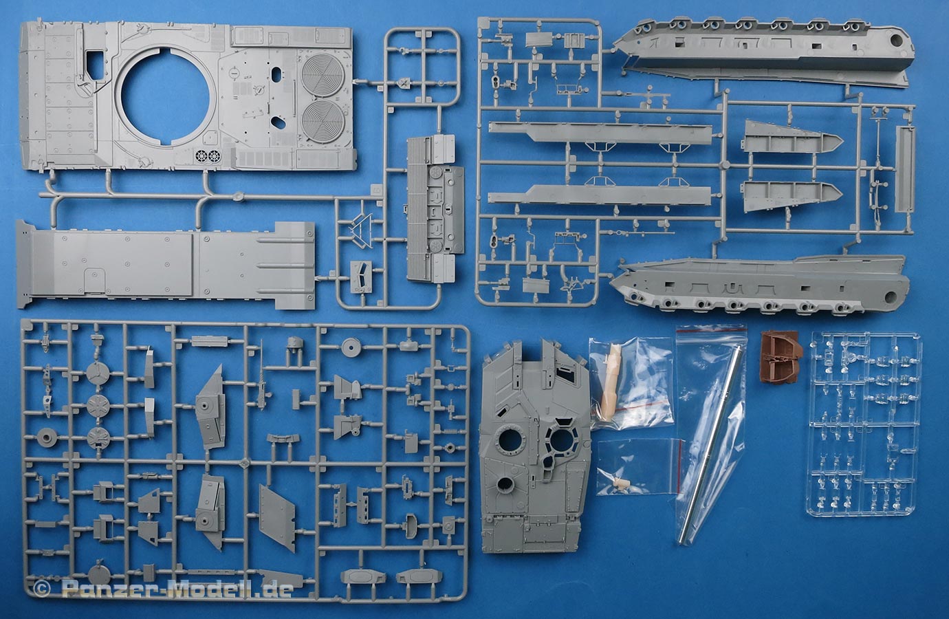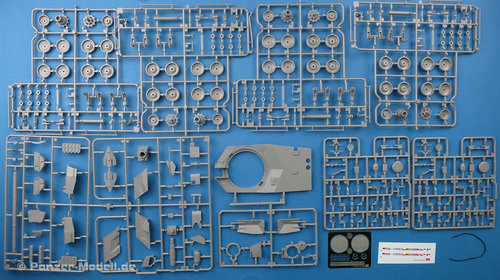Im recht vollen Bausatzkarton finden wir 11 graue Spritzlinge, 5 rotbraune Spritzlinge, einen transparenten Spritzling, das Turmoberteil, zwei 3D Druckteile, eine PE Platine, Kunststoffkabel und ein Decalbogen. Für die erste Produktion des Bausatzes liegt auch ein Metallrohr für die 120mm und 3D Druckteile als Kanonenbasis und Rauchabsauger, sowie die Mündung bei.