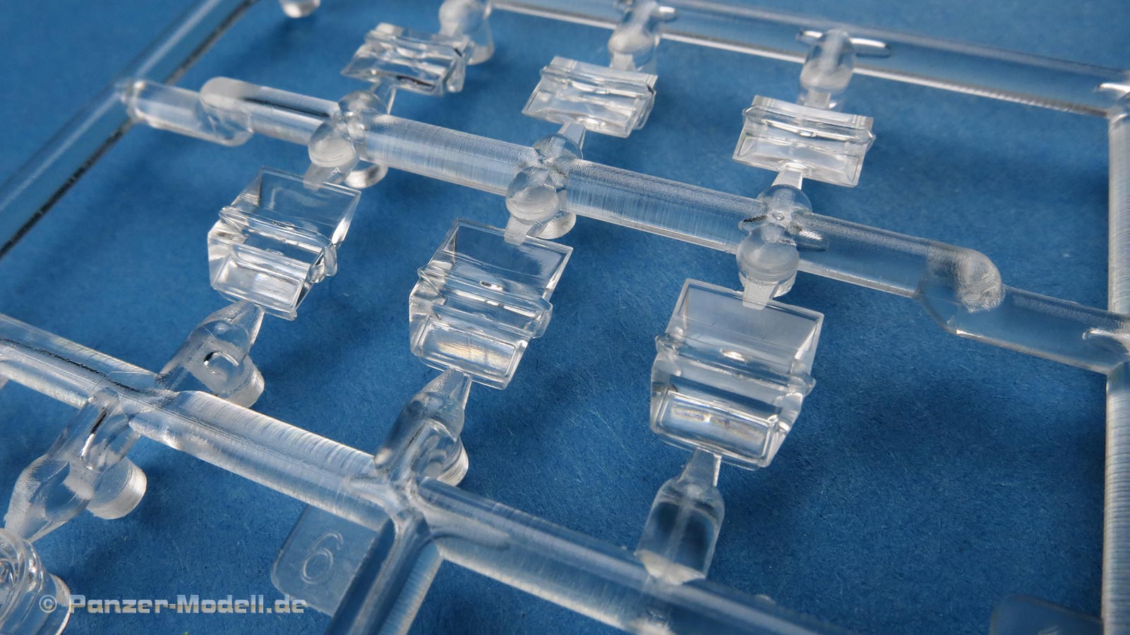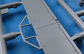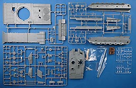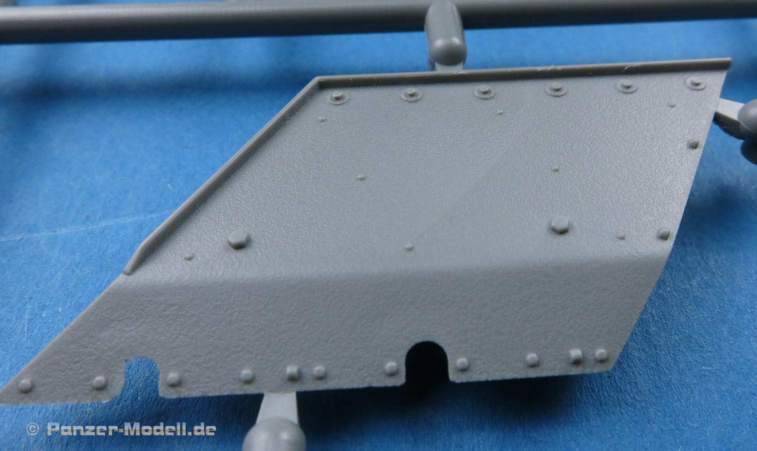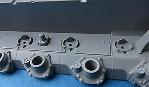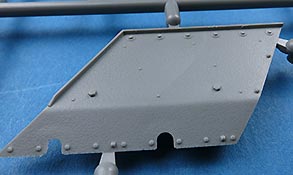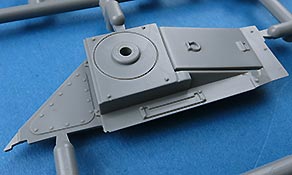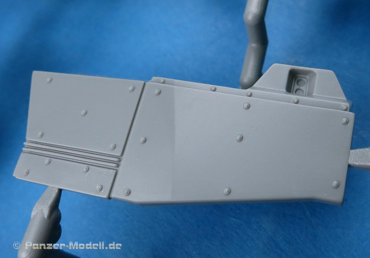 Die Unterwanne wird aus den Seitenteilen und der Bodenplatte zusammengesetzt, was zwar schwieriger und aufwändiger im Bau ist, da man sauber und spaltenfrei arbeiten muss, da sich nach oben hin nur alles weiter verzieht. Die bereits angespritzten Details sind aber sehr schön und auch die seitliche Zusatzpanzerung mit Befestigungsbolzen ist korrekt dargestellt.