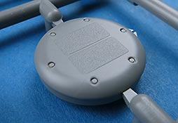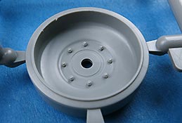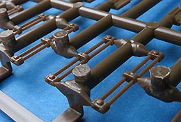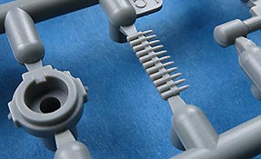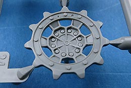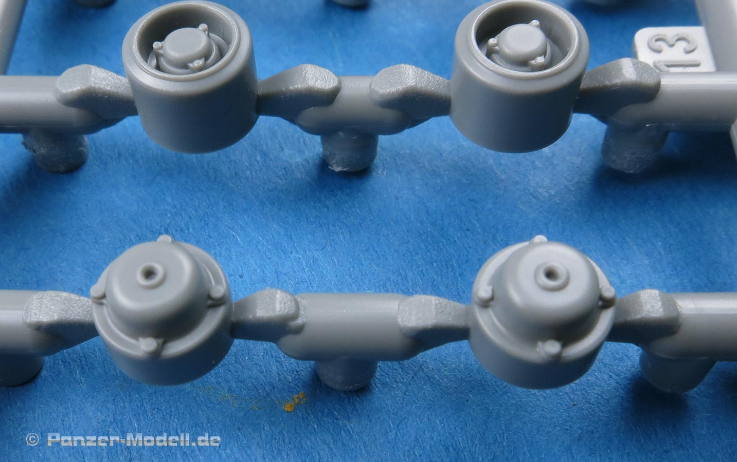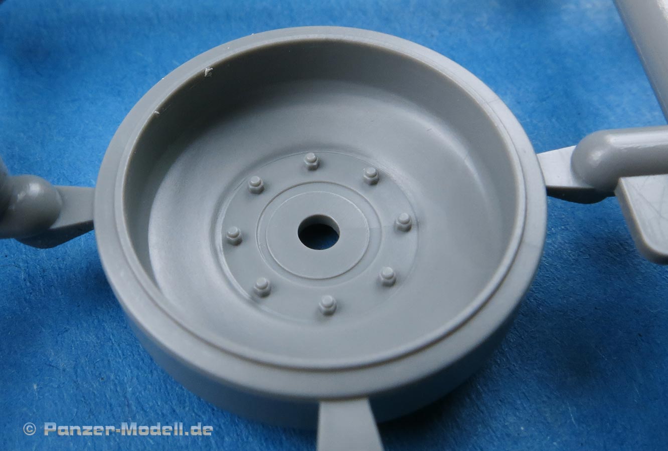 Die Laufrollen setzen sich aus zwei Laufrollen zu einer Doppellaufrolle zusammen - die Details mit den Radmutternbolzen und der scharfen Abgrenzung zur Gummierung ist sehr gut. Die Laufrollen wird beim Aufstecken auf die Schwingarme mit einer entsprechenden Nabe gesichert, die das Rad an sich drehbar macht, was angenehmen für die Bemalung der Gummierung ist.