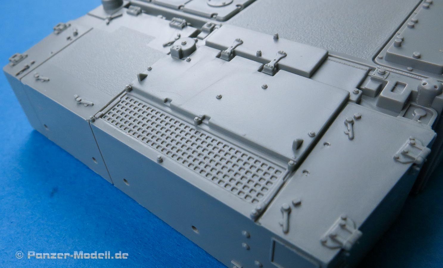 Die Heckplatte ist in punkto der Grätings vom neueren Typ der Leopard 2, denn die Beleuchtungsanlage wurde in die Grätings hochgezogen - eine Infanteriesprechbox hingegen hat diese Version nicht.