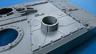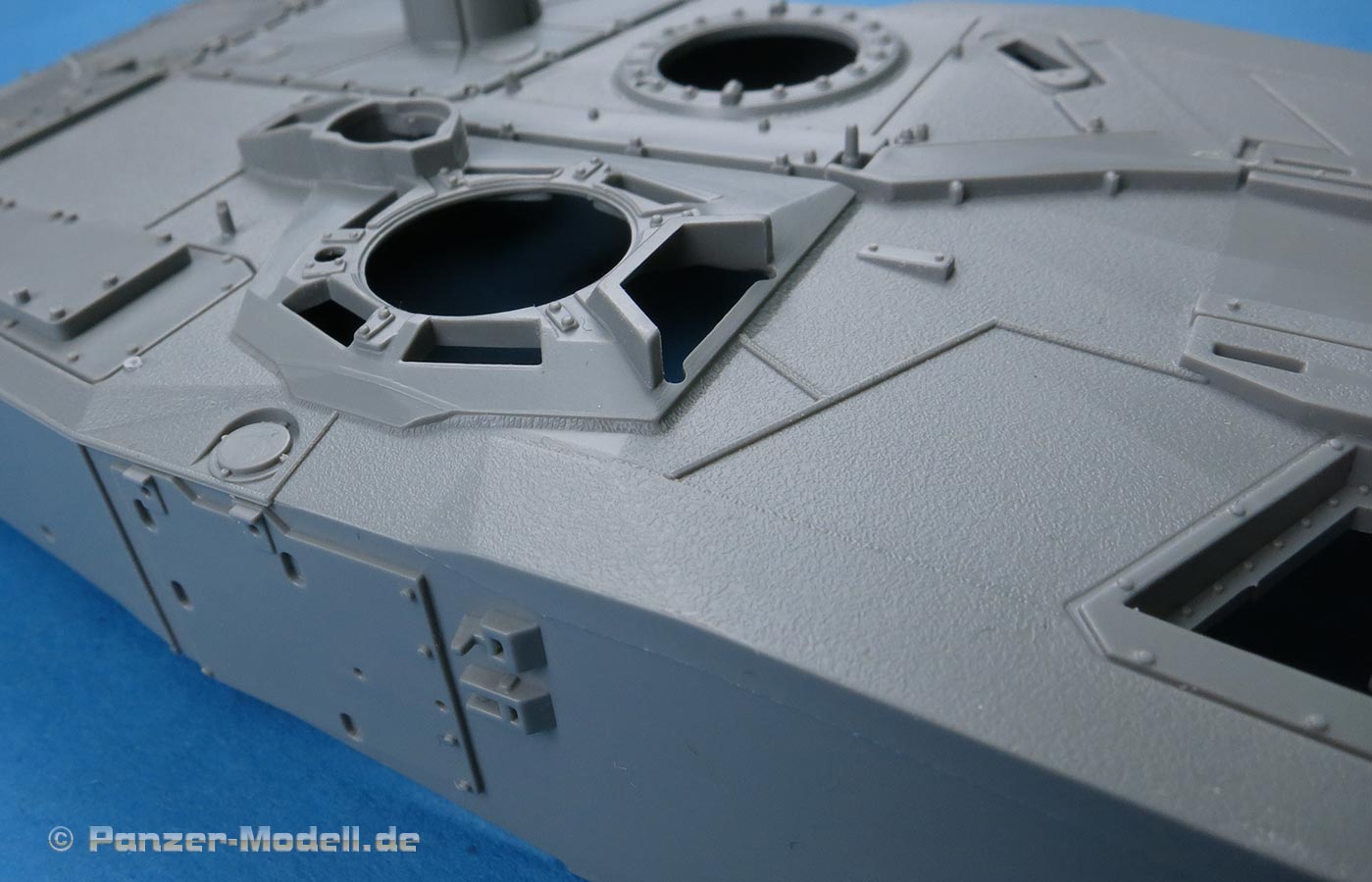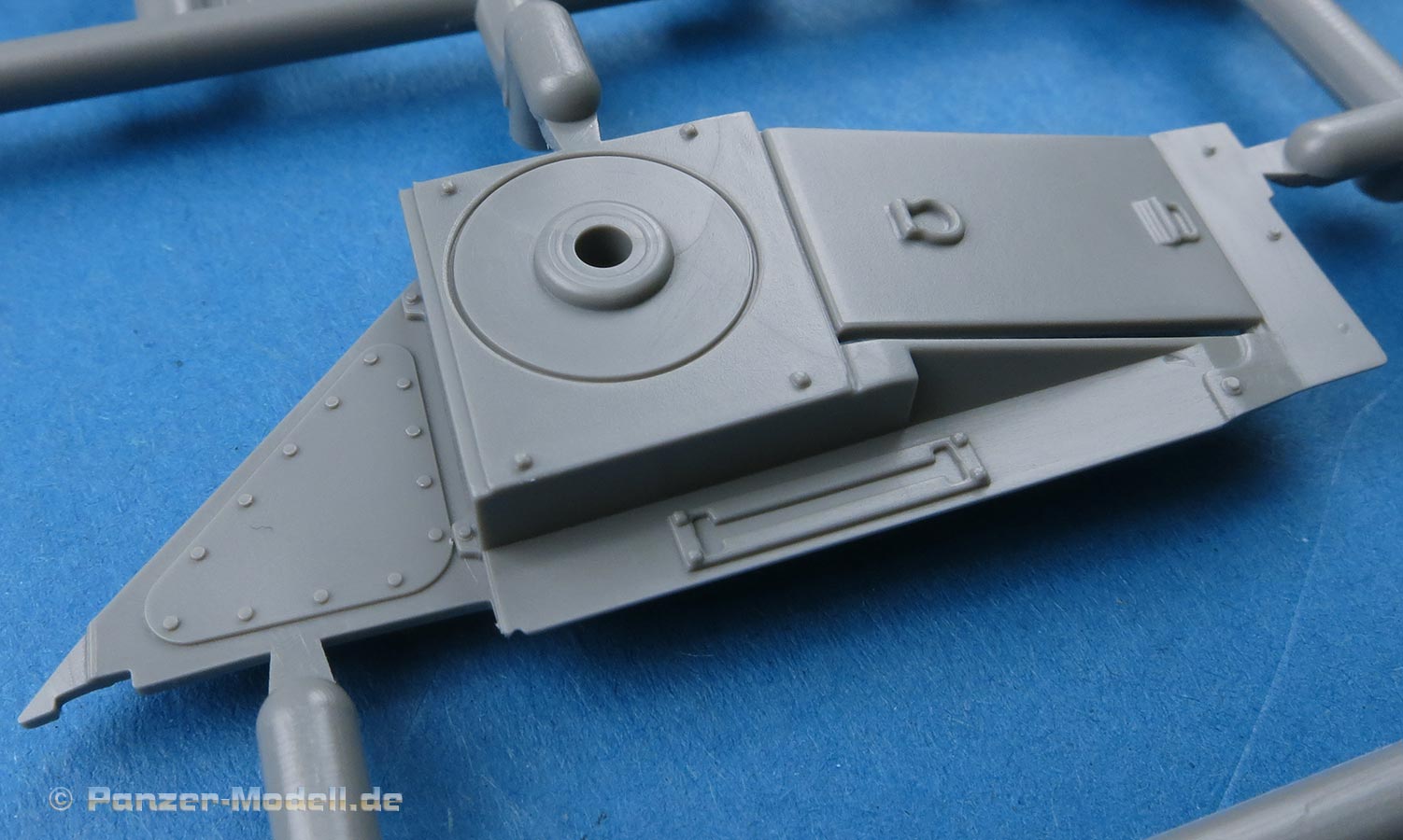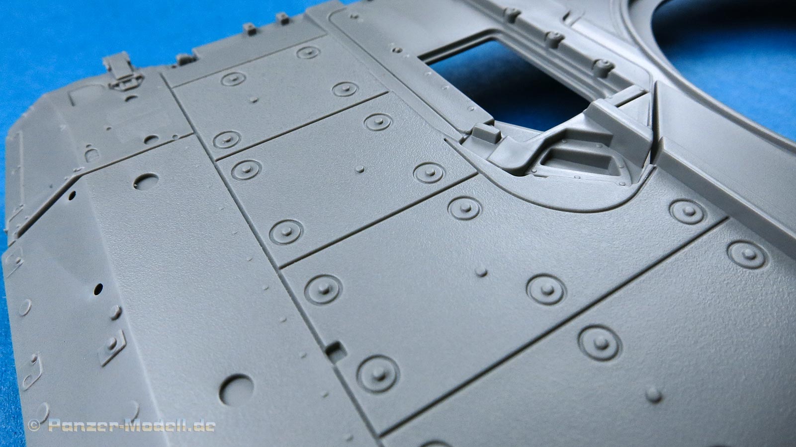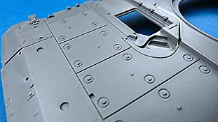 Die Deckplatte der Oberwanne ist einteilig. Die Zusatzpanzerung am Bug ist direkt mit angegossen und mit schönen, feinen Details der Befestigungungen. Die Fahrerluke lässt sich offen oder geschlossen bauen.