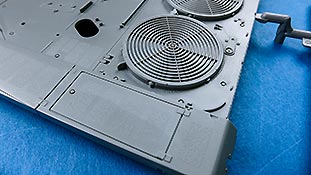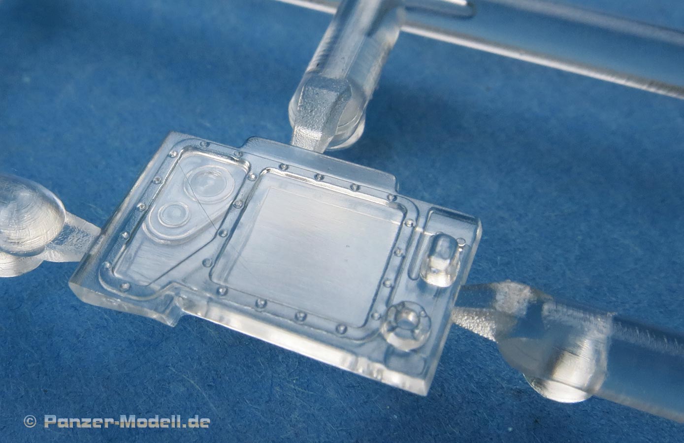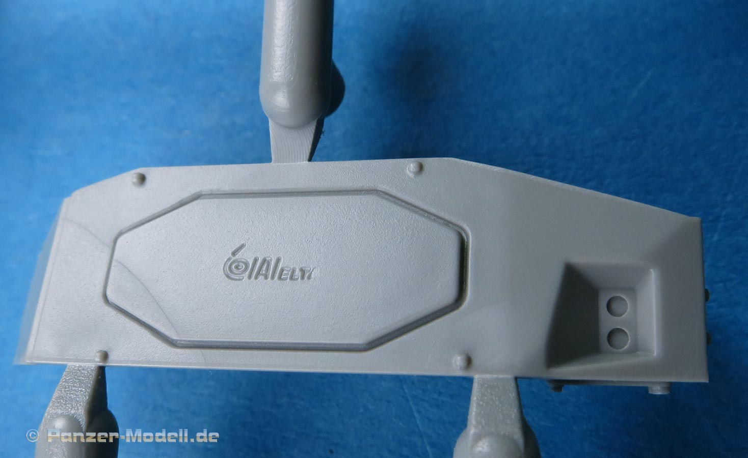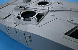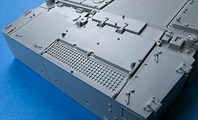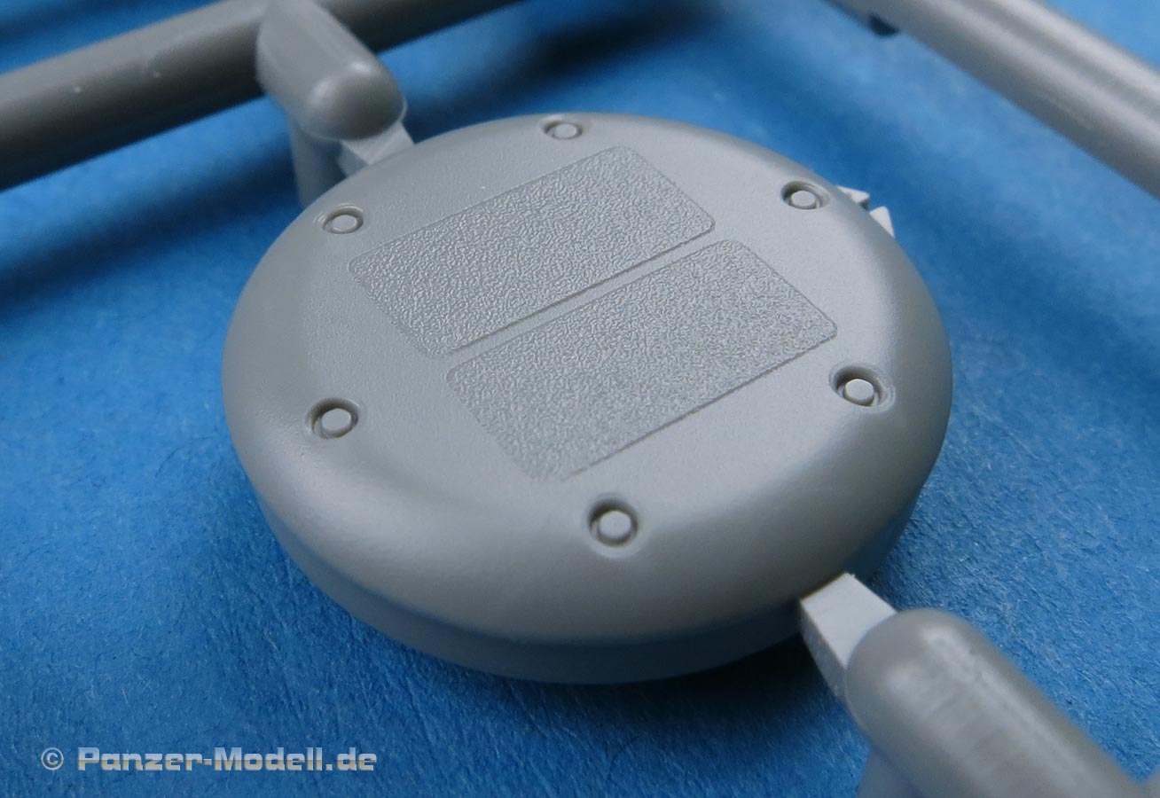 Die Deckplatte der Oberwanne ist einteilig. Die Zusatzpanzerung am Bug ist direkt mit angegossen und mit schönen, feinen Details der Befestigungungen. Die Fahrerluke lässt sich offen oder geschlossen bauen.