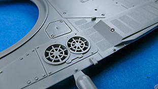 Die beiden Ringlüfter werden mit feinen PE Gittern abgedeckt. Auf die beiden Lüfter linksseitig, die uns vom A7V bekannt geworden sind, sind offen dargestellt und werden von innen mit PE Gittern "verschlossen".