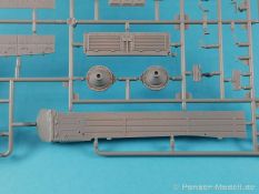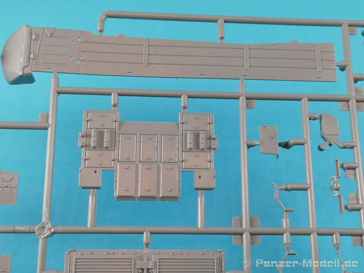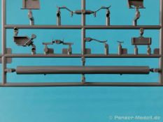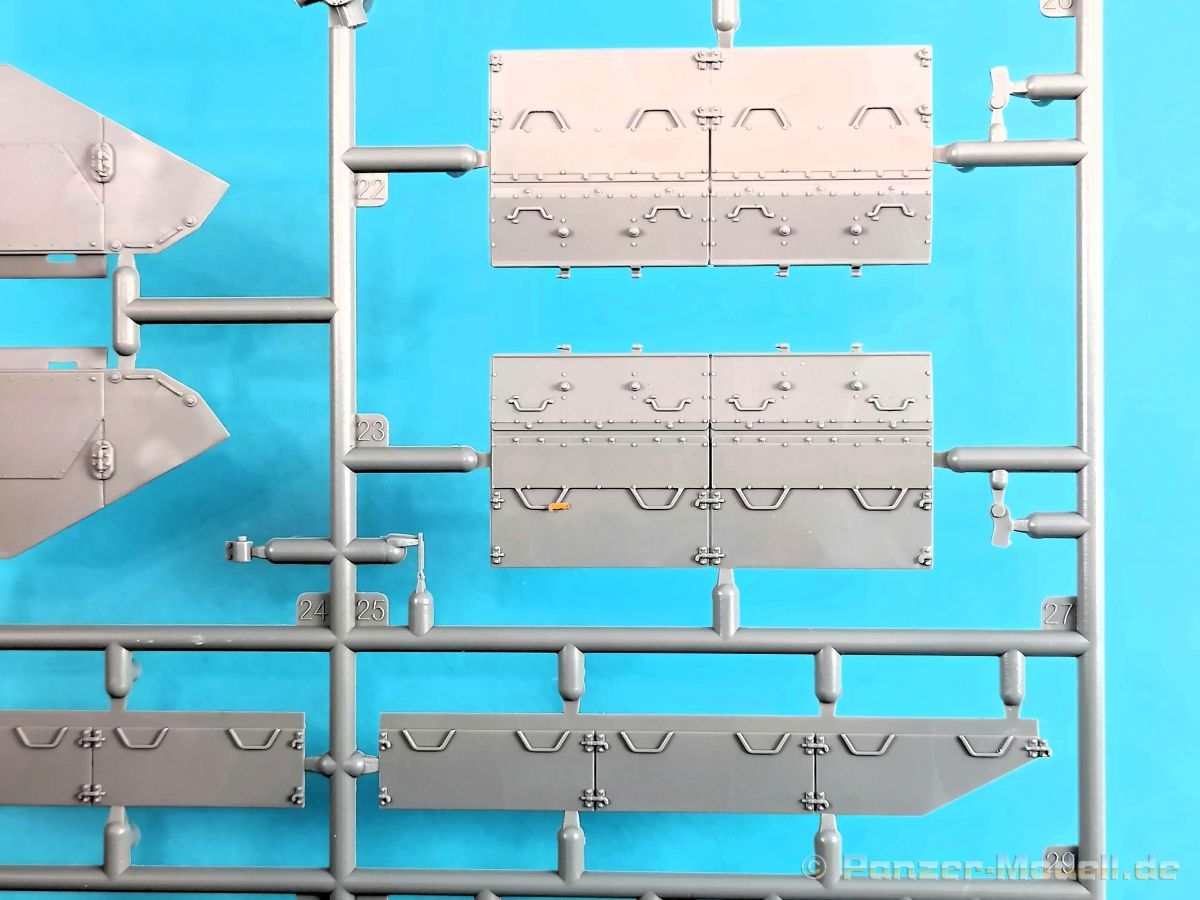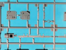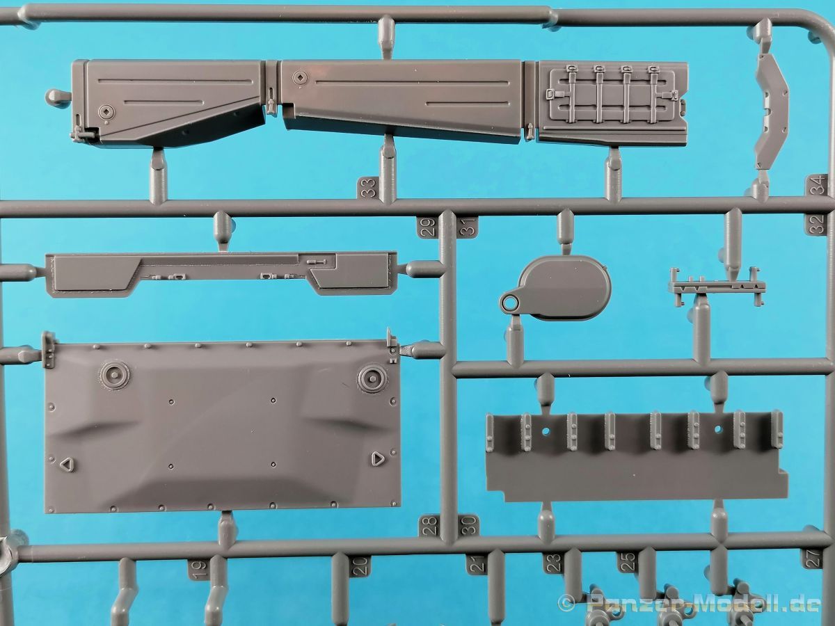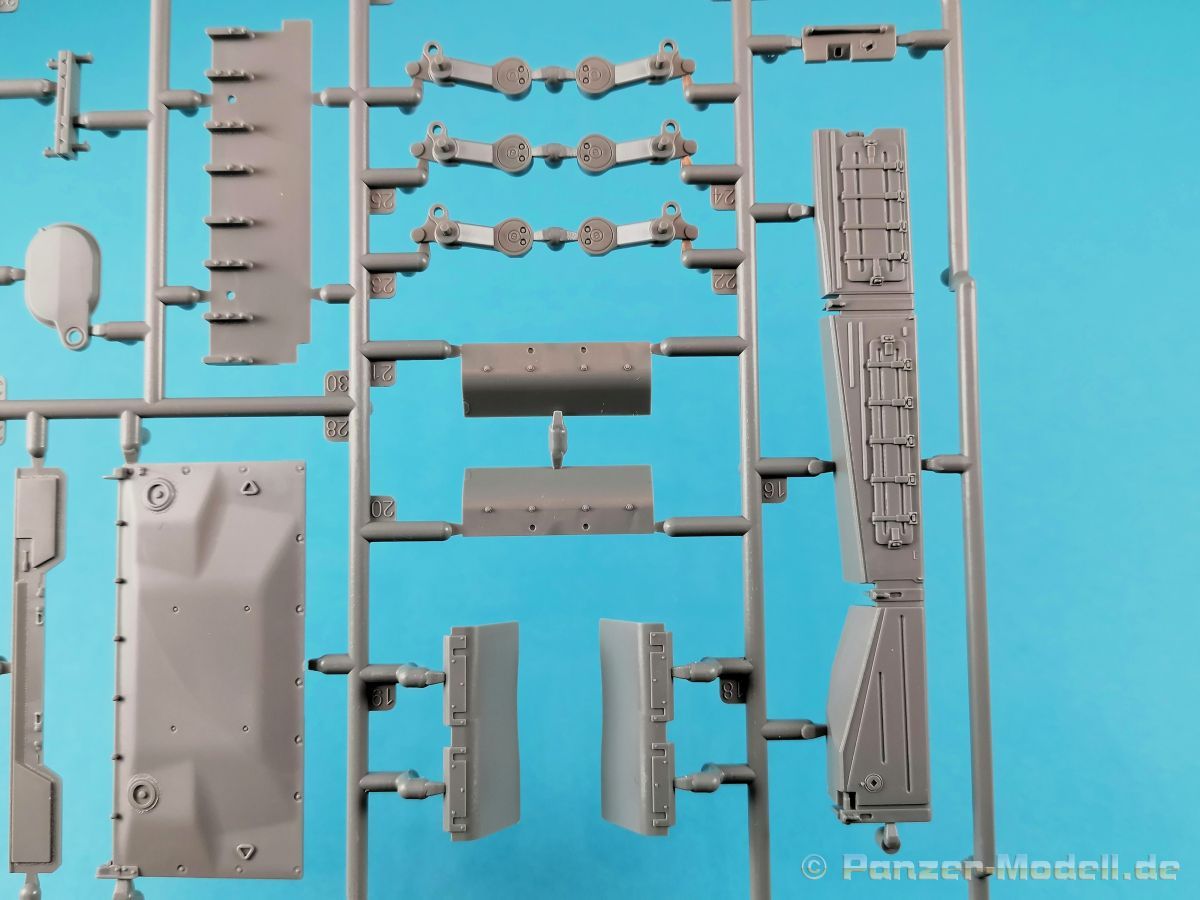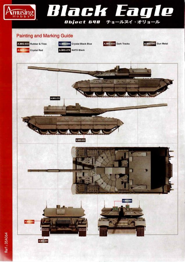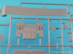 Das Objekt 640, besser bekannt als “Black Eagle” war eines der Projekte der Russen in den frühen 1990ern. Die Entwicklung des Prototypen erfolgte in Omsk. Viele Neuerungen flossen in das Projekt ein, die aber erst später im “Armata” ihren Niederschlag finden. Tatsächlich wurde dieser Panzer aber nie vollständig gebaut. Ein Vorführmodell, bestehend aus einer T-80U-Wanne und einem Objekt-480-Turm wurden der Öffenlichkeit 1997 vorgestellt. Aus finanziellen Gründen und Desinteresse des Verteidigungsministeriums in Moskau an diesem extrem teuren Projekt wurde die weitere Entwicklung abgebrochen. Erfahrungswerte und Erkenntnisse flossen aber in die Modernisierung anderer konventioneller Kampfpanzer ein. Amusing Hobby bleibt sich seiner Linie treu und liefert mit dem vorliegenden Kit erneut einen Prototypen, um nicht zu sagen ein weiteres “What If” Projekt! Was findet sich im Bausatzkarton (37 x 24 x 6,5 cm) mit Stülpdeckel. Zum Vorschein kommen neun Spritzlinge in Grau, eine Panzerunterwanne, ein Turmunter- und ein Oberteil. In zwei Beuteln, gut verpackt gibt es einem braunen Ton gehalten die Teile für die Ketten. Klarsichtteile, Druckteile und eine kleine PE-Platine runden alles ab. Beim Betrachten der Bauteile fällt schon auf den ersten Blick die saubere Verarbeitung auf. Formenversatz und Flash sucht man vergebens, also Spritzguß auf hohem Niveau. Auswerfermarken lediglich in Bereichen die sich später dem Auge des Betrachters entziehen. Alles ist sehr filigran, scharf und detailreich umgesetzt. Ob es sich um Bolzen, Nieten und Schweißnähte handelt; alles gefällt. Oberflächendetails fehlen ebensowenig. Allerdings erscheint mir die Oberfläche des Panzers etwas zu glatt, aber das ist nicht unbedingt ein Manko. Abhilfe werden versierte Modellbauer sicherlich schaffen. In 17 Baustufen führt uns die Bauanleitung im DIN A4 Hochformat durch den Bau des Panzers. Den üblichen mehrsprachigen Hinweisen und Piktogrammen auf der ersten Seite folgt auf Seite zwei die übliche Übersicht der Bauteile. Die Zeichnungen sind gut lesbar und nicht mit Teilen überladen. Fragen dürften sich keine ergeben. Kleine Bauuntergruppen weisen auf Besonderheiten hin. Klassisch beginnt der Bau des Fahrzeugs dann auf Seite drei mit der Unterwanne. In vier Baustufen dreht sich alles um die Konstruktion des Laufwerks. Durch die Lage der Drehstäbe sollte auch die Beweglichkeit der Laufrollen und der Ketten gegeben sein, also auch für Dios mit unebenen Untergrund. Der fünfte Bauabschnitt beschäftigt sich mit der Montage der Laufrollen und dem Bau der Kette. Laut Anleitung werden die Kettenglieder nur zusammengeklickt und abschließend mit den Führungszähnen vervollständigt. Dadurch sollten die Kettentrümmer auch beweglich bleiben. Wahrscheinlich das aufwändigste Konstrukt an dem Panzer. Bevor es ab Baustufe acht an die Konstruktion der Oberwanne geht wird die Unterwanne mit diversen Anbauteilen komplettiert. Auch der übliche “Baumstamm” darf nicht fehlen… Dank der wirklich gelungenen Zeichnungen läuft der weitere Zusammenbau ohne Probleme. Die Schutzbleche der Ketten, die mit Treibstofftanks etc. bestückt werden und die Schürzen machen ebenfalls in Summe einen sehr guten Eindruck. Das für russische Panzer typische Erscheinungsbild ist spätestens jetzt klar erkennbar. Im Heckbereich werden weitere Anbauteile angebracht und zudem Reservetanks, die im Slide-Mould Verfahren hergestellt sind und die mit feinen Beschriftungen versehen sind. Clever gedruckte Lampen und deren Schutzbügel erleichtern den Bau. Fehlt nur noch der Turm. Dieser ist grob zweiteilig umgesetzt und besticht ebenfalls durch viele Details. Zwischen die Turmhälften wird noch die Befestigung für die Kanone eingebracht die für die Höhenrichtung zuständig ist. Leider ist das Rohr zweiteilig, aber eine Passprobe zeigte eine verblüffende Genauigkeit der beiden Hälften. Eine Nacharbeit dürfte sich also in Grenzen halten. Am Turm finden Optiken, weitere Anbauteile usw. ebenfalls ihren Platz. Auch kommen viele Klarteile in diesem Bereich zum Einsatz. Es liegt in der Natur der Sache das nur ein Bemalungsvorschlag vorhanden ist. Allerdings macht sich bei der Farbwahl etwas Skepsis breit. Recherche könnte weiterhelfen. Die Farben sind auf Ammo by MIG ausgerichtet. Decals sind für dieses Fahrzeug keine vorgesehen. Die wenigen PEs (drei Stück) sind erstklassig als Lüftergitter umgesetzt stellen niemand vor Probleme. Amusing Hobby hat es erneut geschafft ein interessantes Fahrzeug zu realisieren. Ohne Details zu verlieren und in eine Kleinteiligkeit abzudriften liegt uns ein solider Bausatz vor, der auch von Anfängern durchaus bewältigt werden kann. Die sinnvolle und relative überschaubare (subjektiv) Teileanzahl dürften zu einem relativ schnellen Ergebnis führen. Ein tolles Modell, nicht nur für “What If” Fans. Sehr gute Qualität und Ausstattung zu einem noch guten Preis. Beide Daumen hoch.