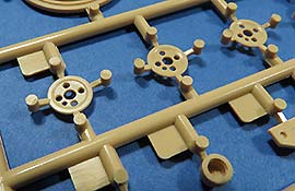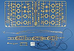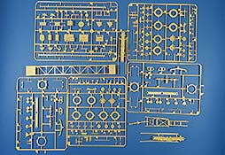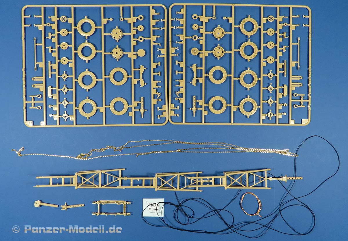 Im karton der mit einem schlichten Deckelbild daherkommt finden wir 7 sandgelbe Spritzlinge, die Brücke, zwei Achsen, 4 Ständerwerke, eine Laufkatze, reichlich Metallgliederkettchen, Textilseilmaterial, verdrilltes Kupferkabel und einen kleinen Decalbogen.